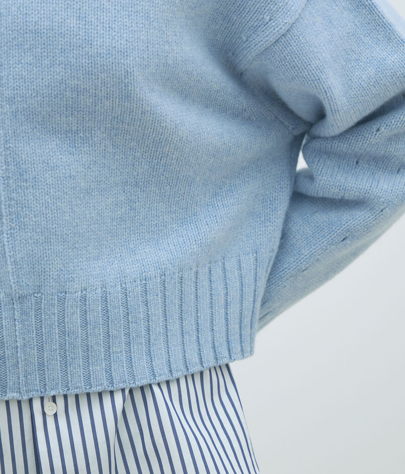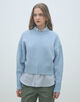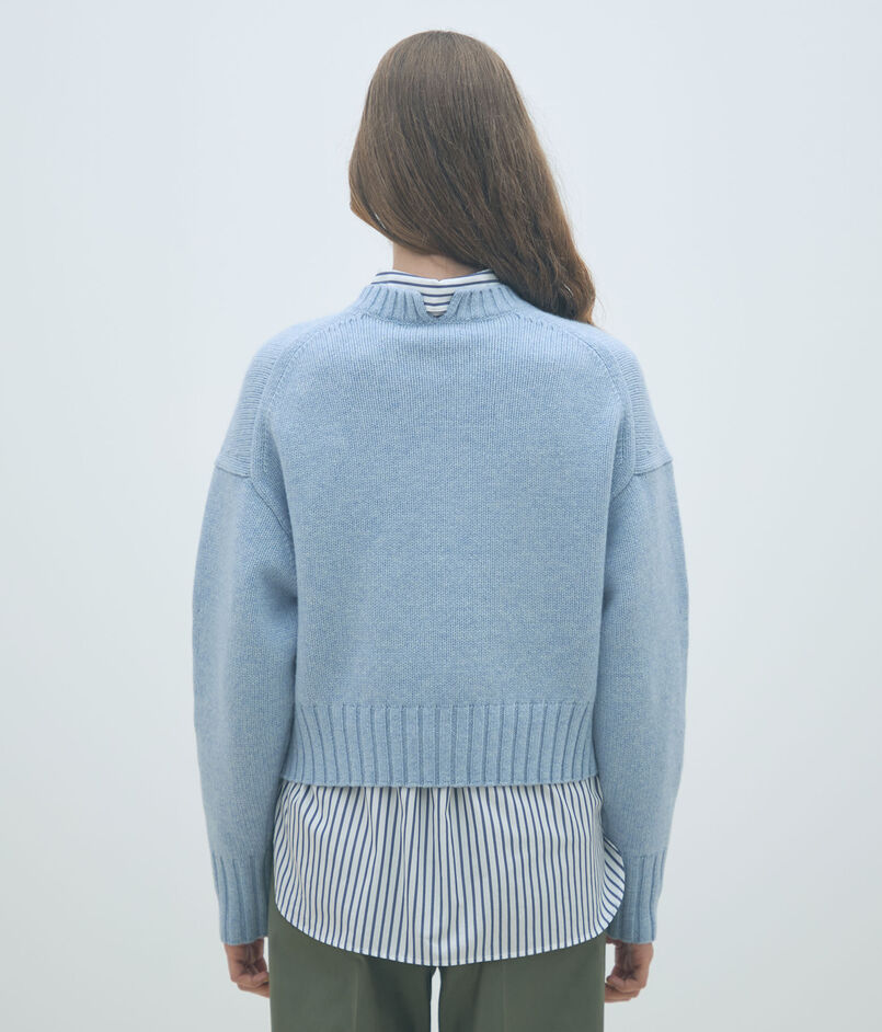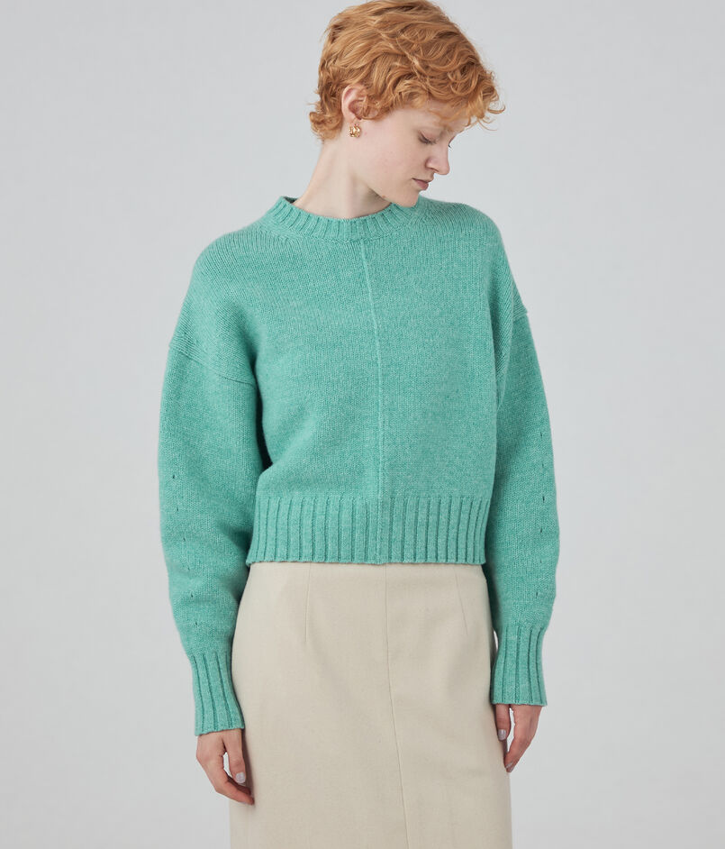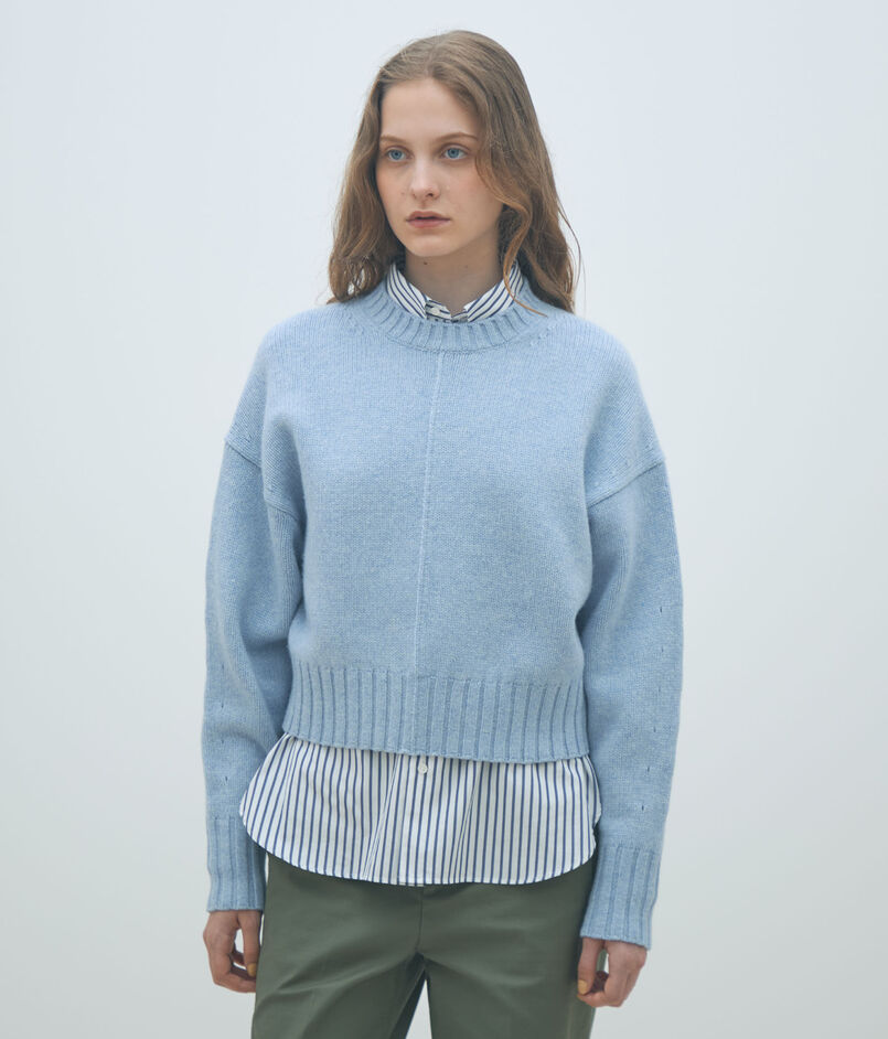 クルーネックプルオーバーはコンパクトなボディと存在感のあるふんわりとしたスリーブの組み合わせが新鮮なバランスの一着。