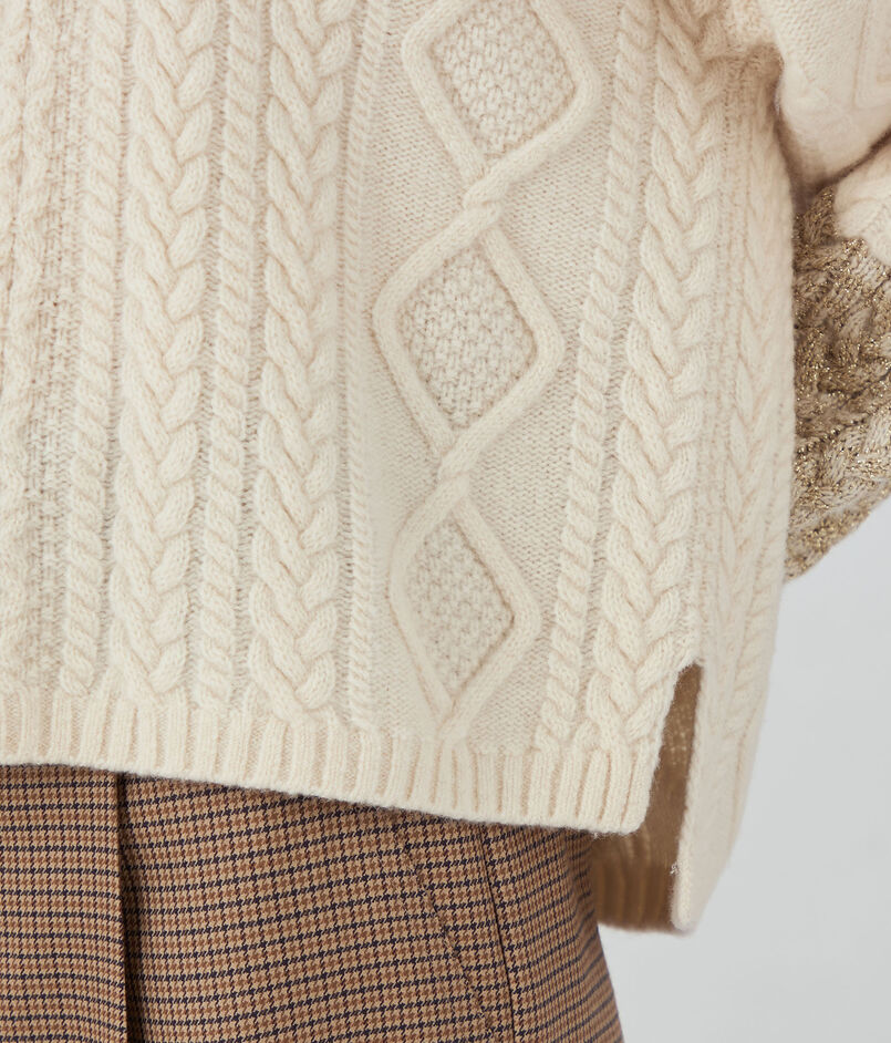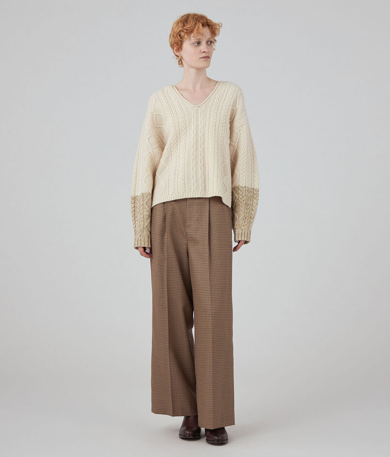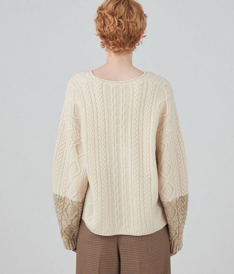 伝統的なアラン柄をコンビネーション使いした、計算された細やかで凹凸のある表面感が魅力的なニットシリーズ。