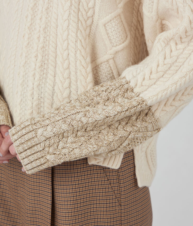 袖口のゴールドラメの切り替えが華やかなアクセントで、秋冬のコーディネートに幅広く活躍してくれるアイテム。