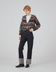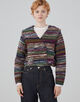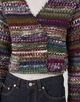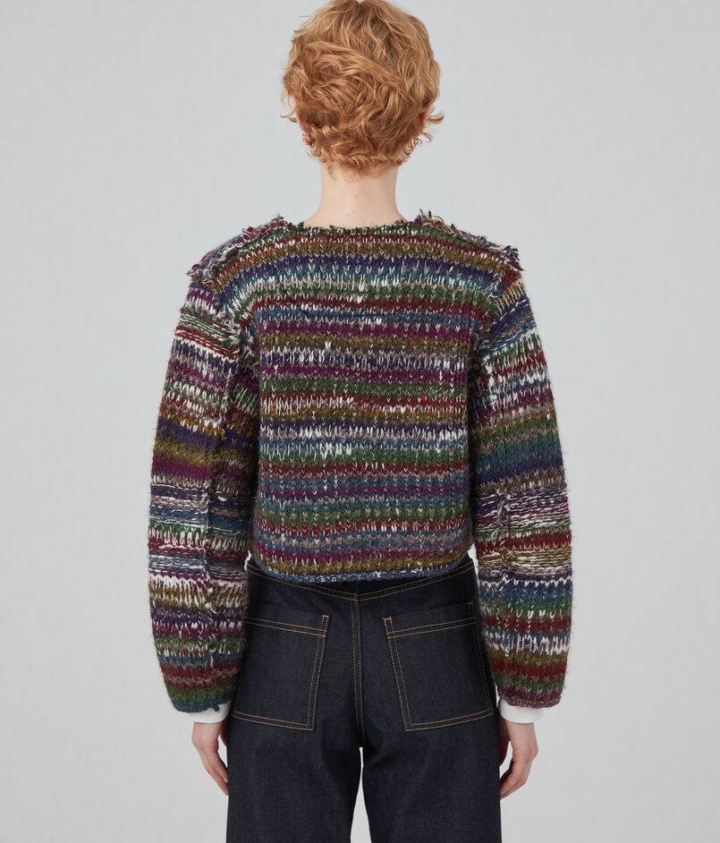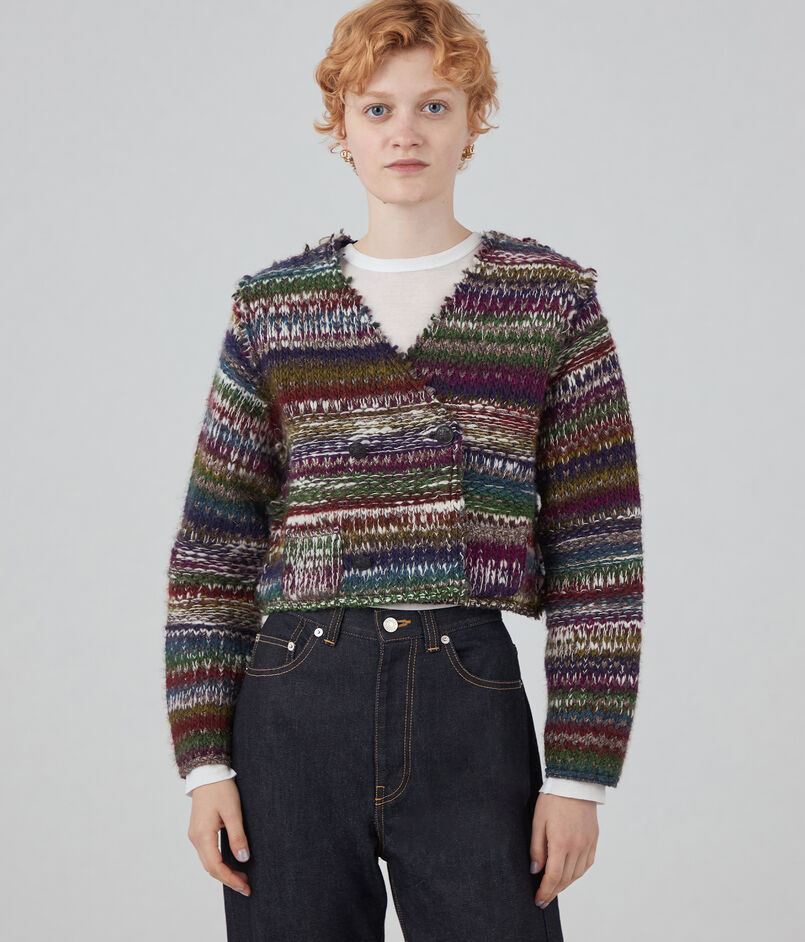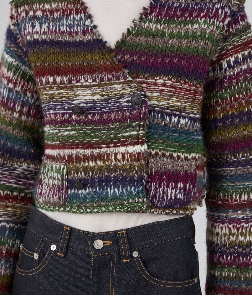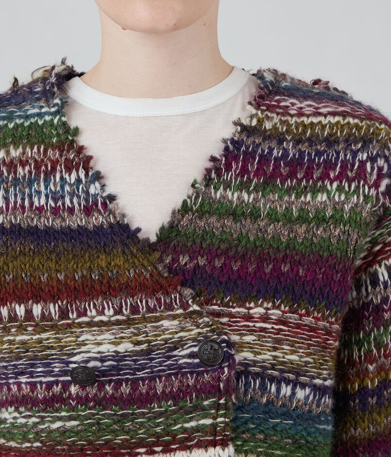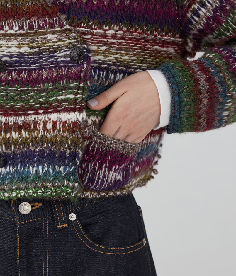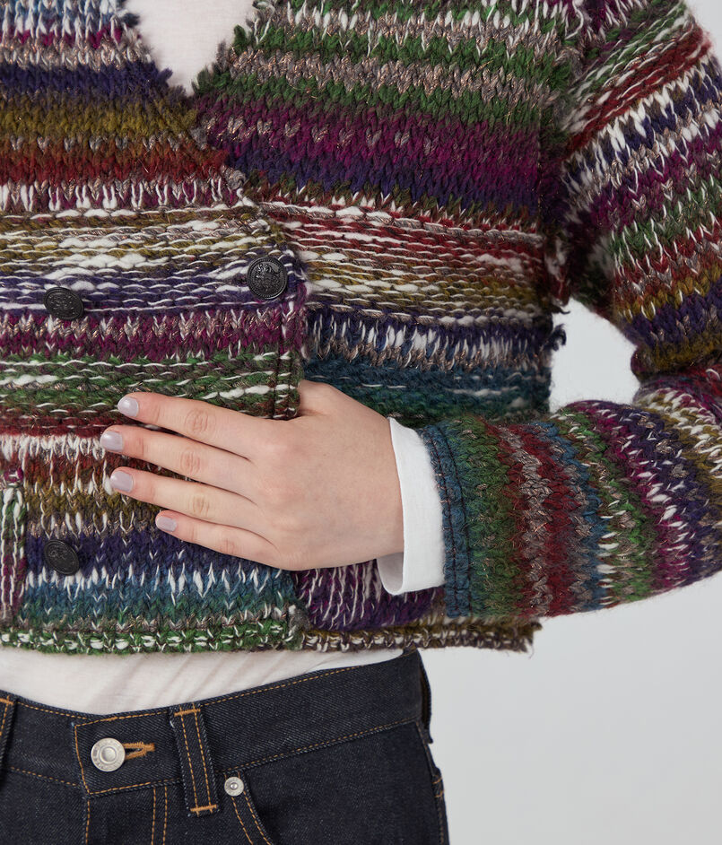 ラメ糸が入ったファンシーヤーンを凹凸感のある編み地にし、裏側にニットでは珍しい芯を貼って仕上げたジャケット。