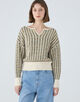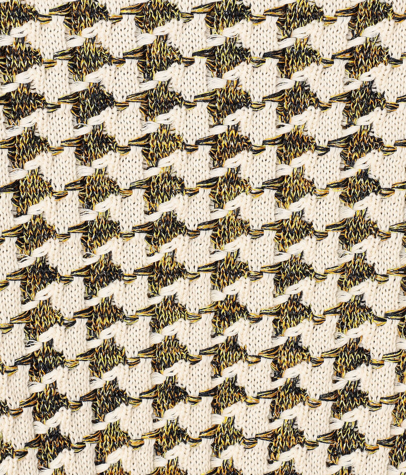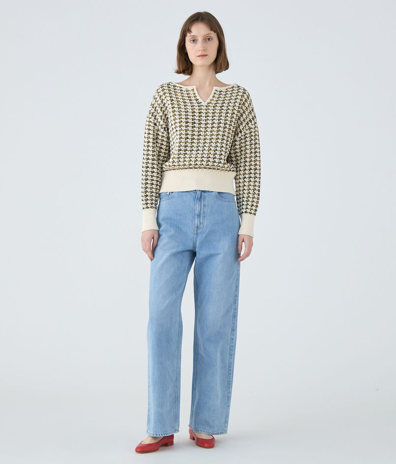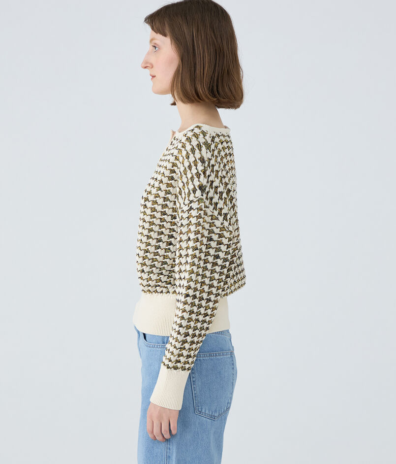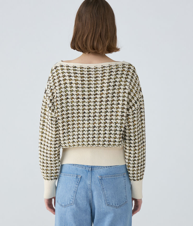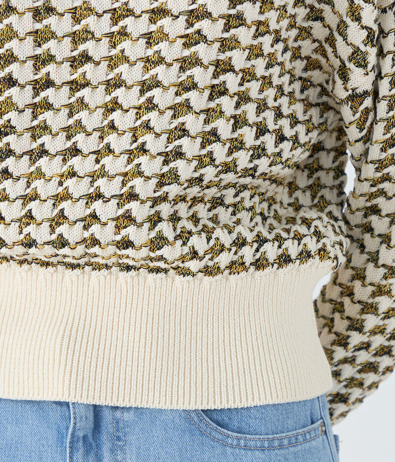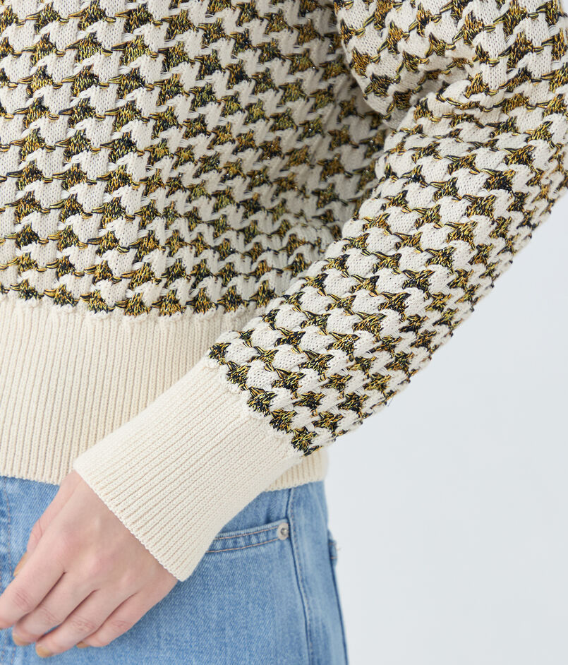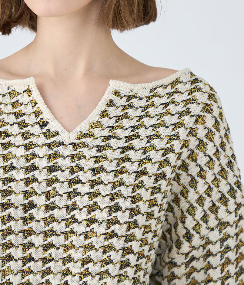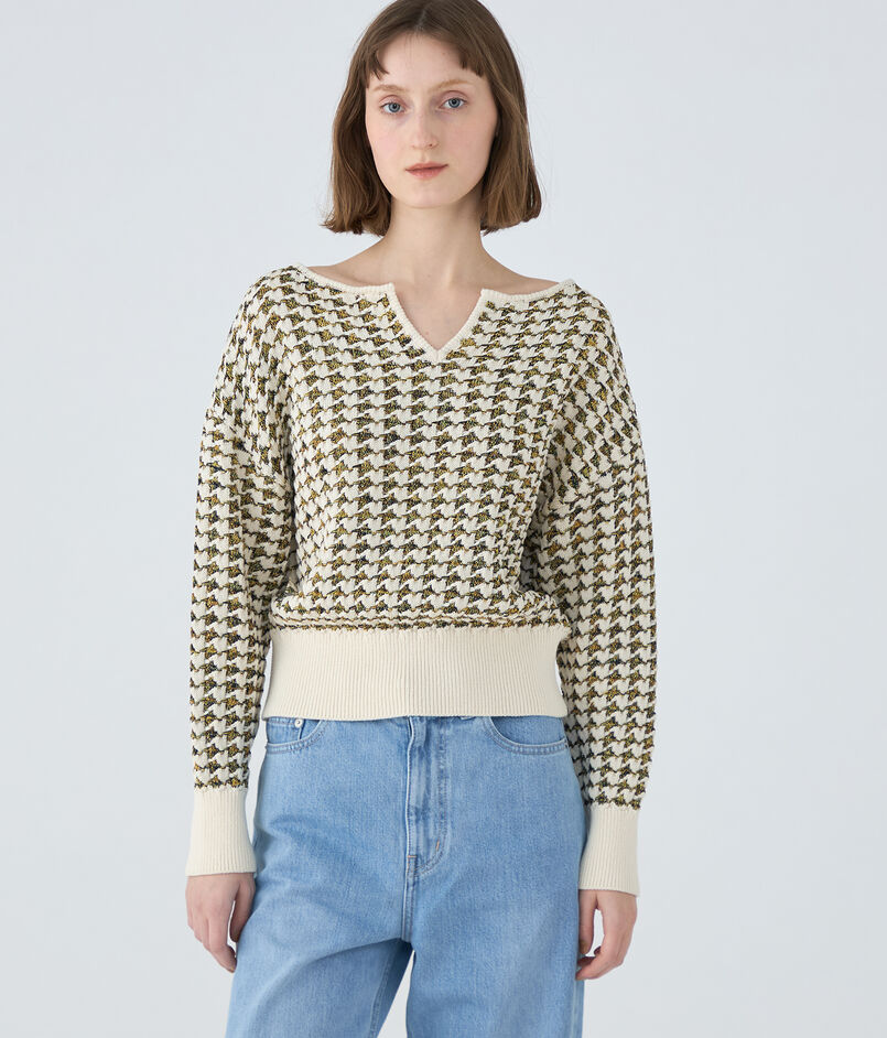 ギマ加工が施されたコットン糸をベースにラメ糸を多色で使ってハウンドトゥース柄を表現したニットシリーズ。