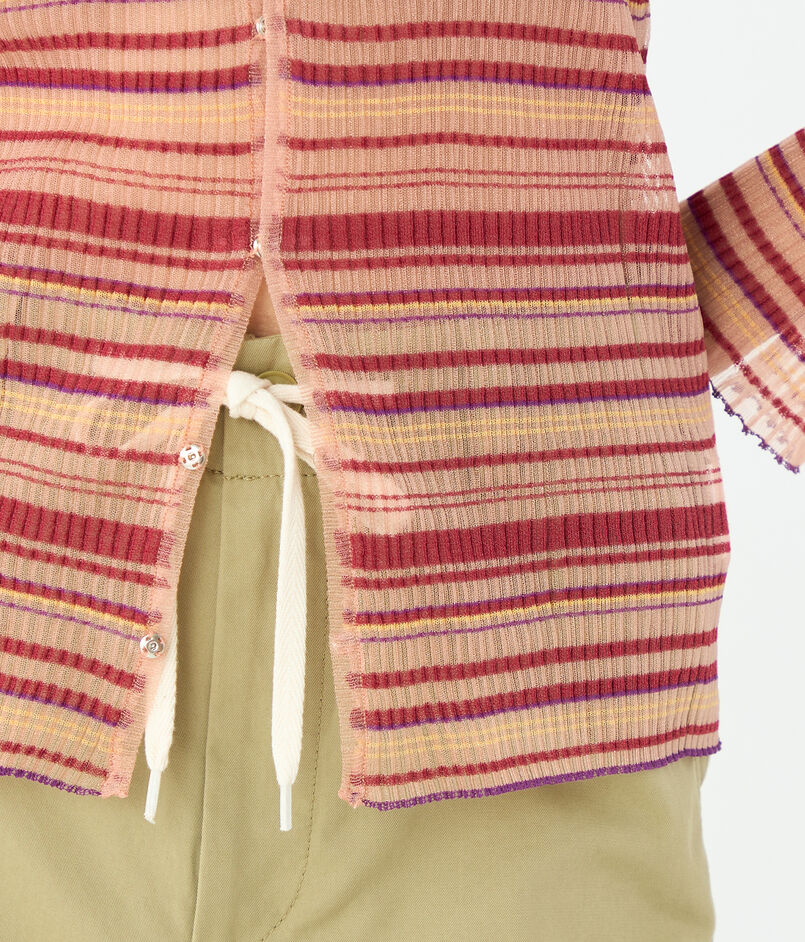 シアーな風合いを生かしてタンクトップなどとレイヤードしたり、フロントを開けて羽織るなど、さまざまなコーディネートを楽しめる一着。
