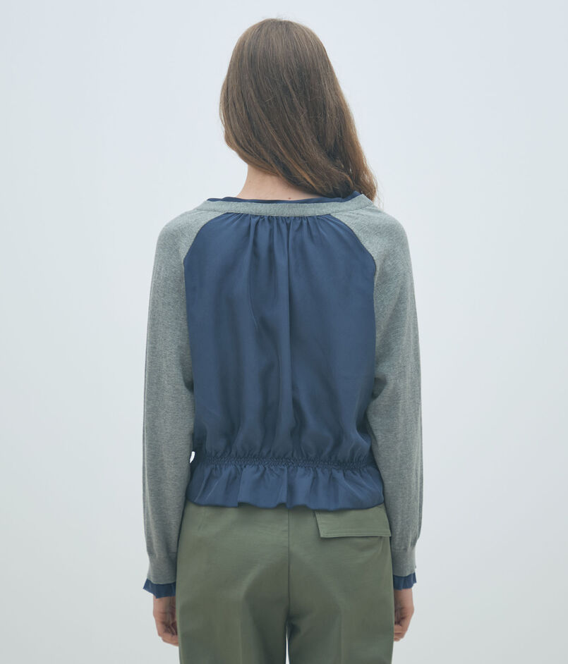 さらっとした風合いの細番手のコットン糸で織り上げたニット素材と光沢感のあるシルクの布帛素材を使用したファブリックコンビシリーズ。
