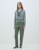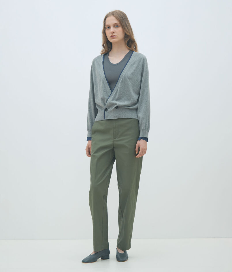 カーディガンはダブルボタンのデザインに着丈の短いシルエットで新鮮なバランスの一枚。