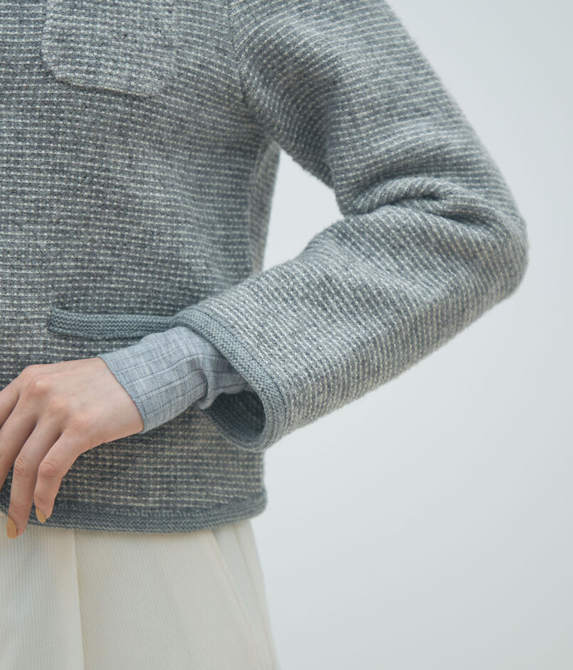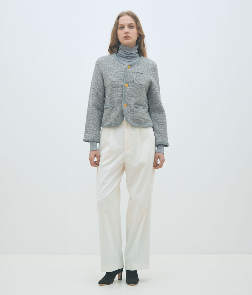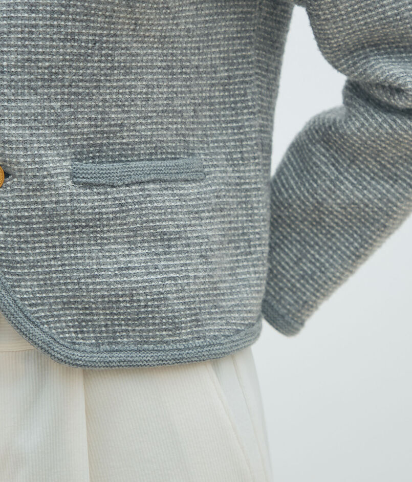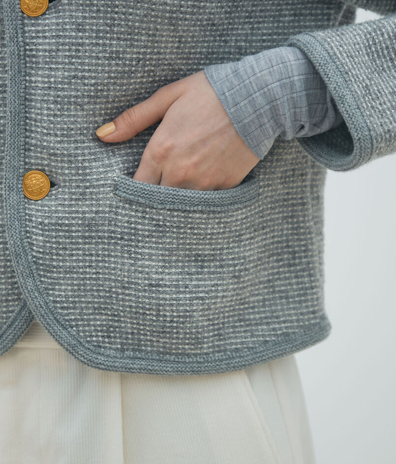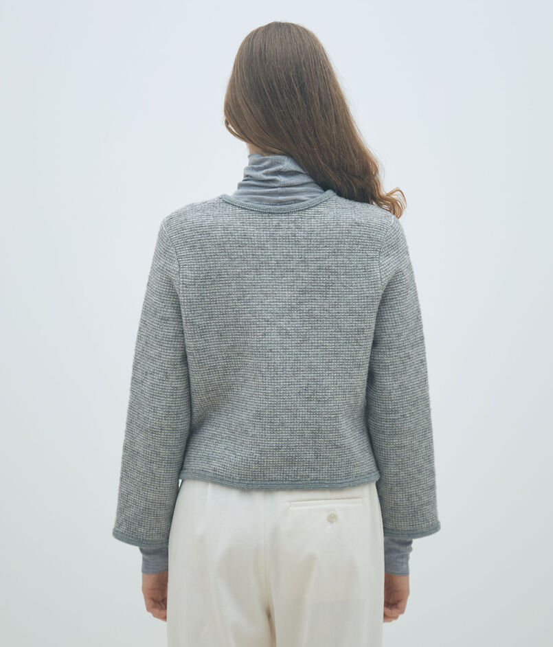 ウールのブークレー糸を使用し、柄編みにすることでツイードのような凹凸のある表面感に仕上げたニットカーディガン。