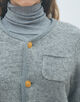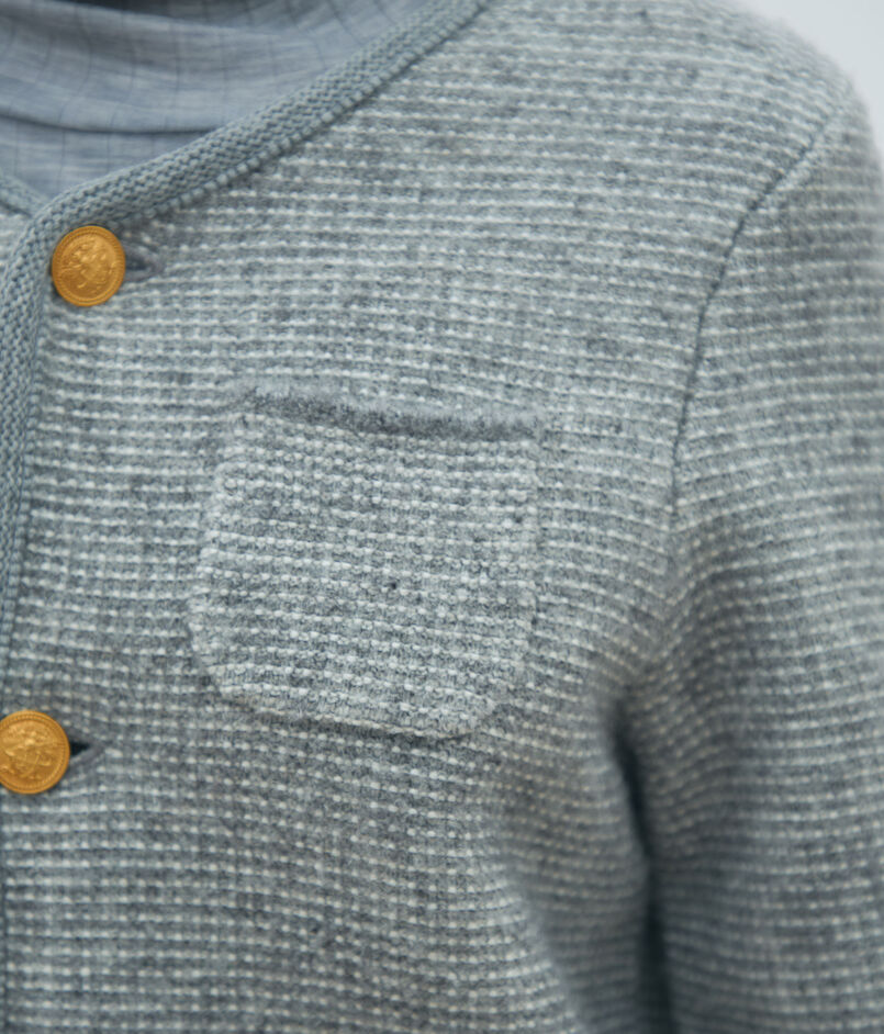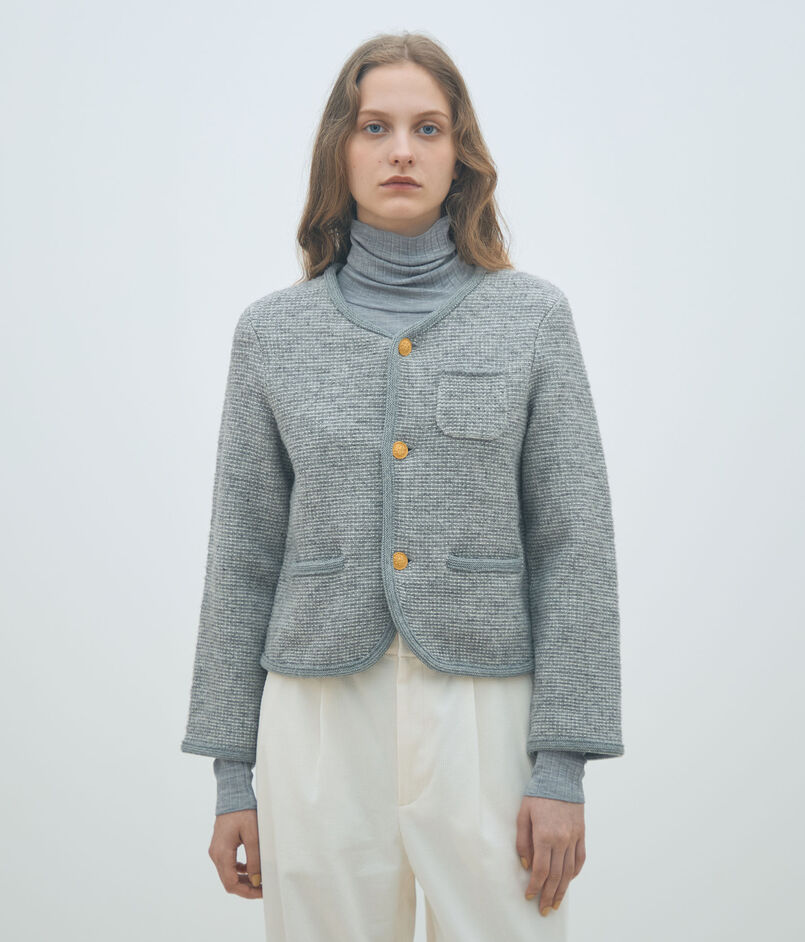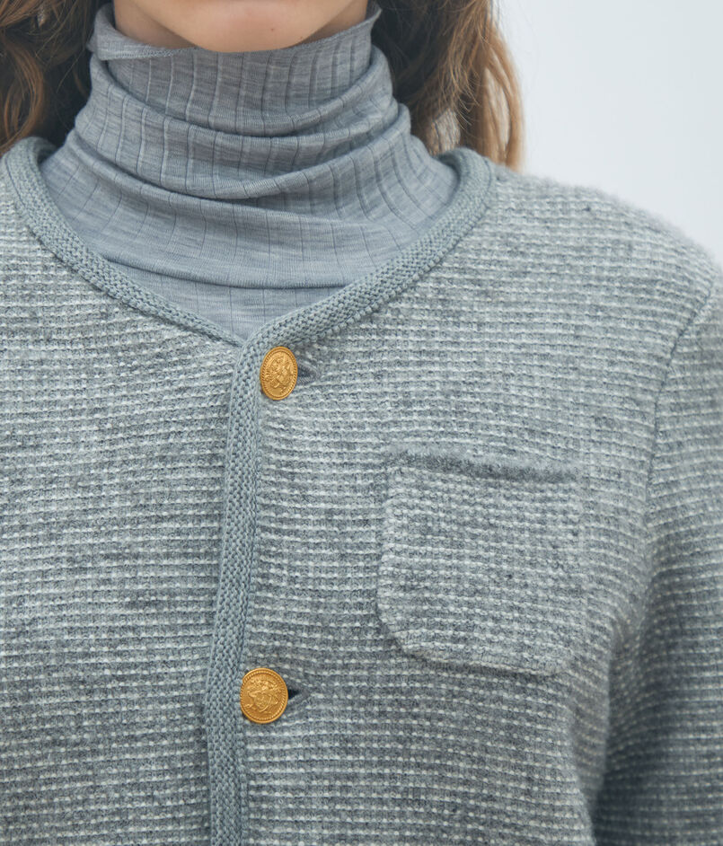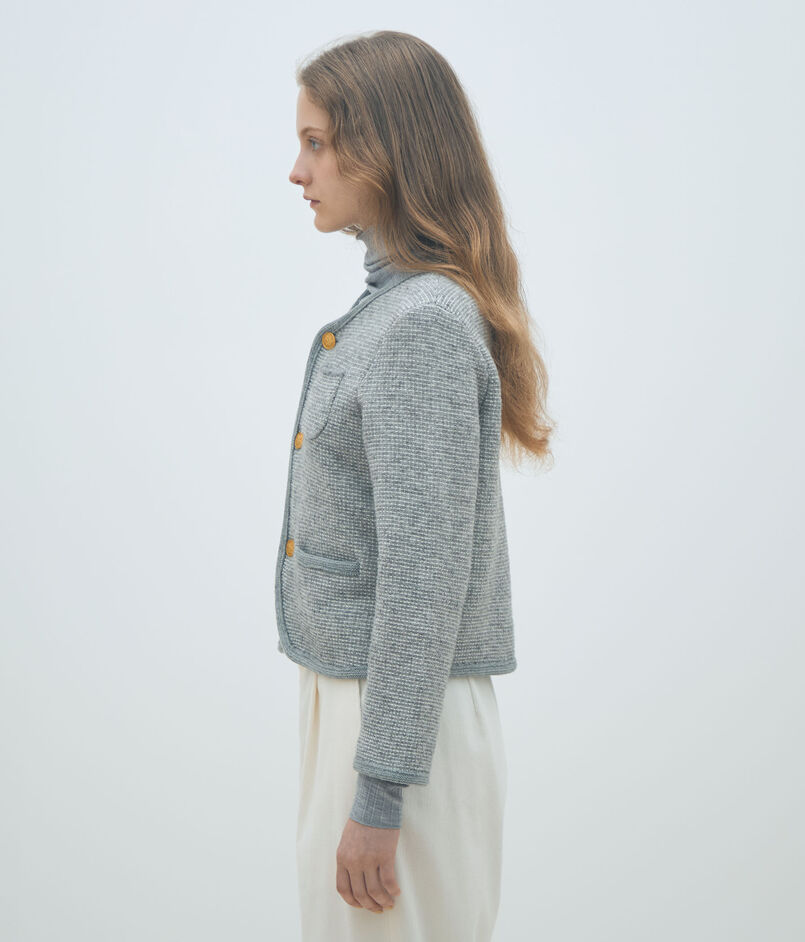 ウールのブークレー糸を使用し、柄編みにすることでツイードのような凹凸のある表面感に仕上げたニットカーディガン。
