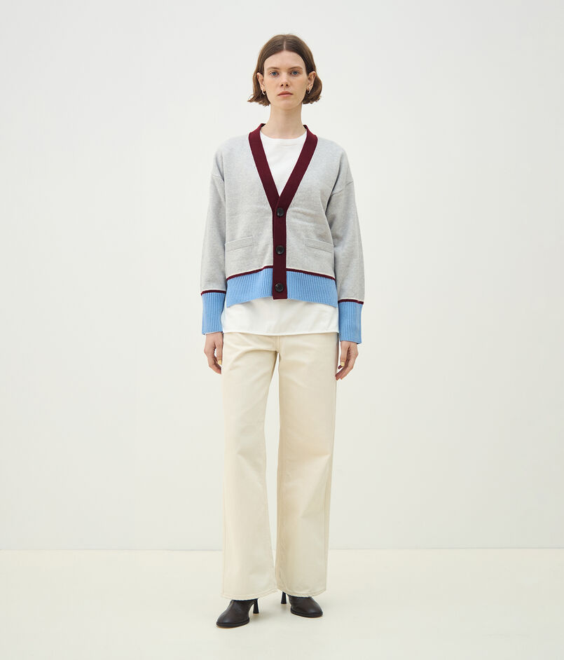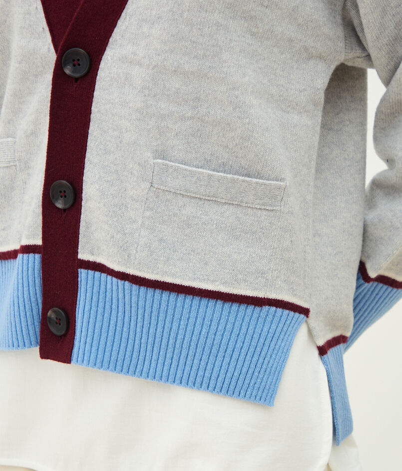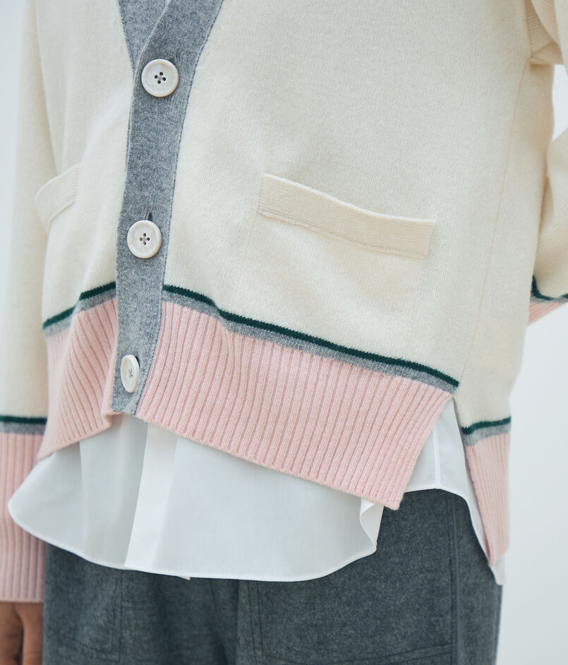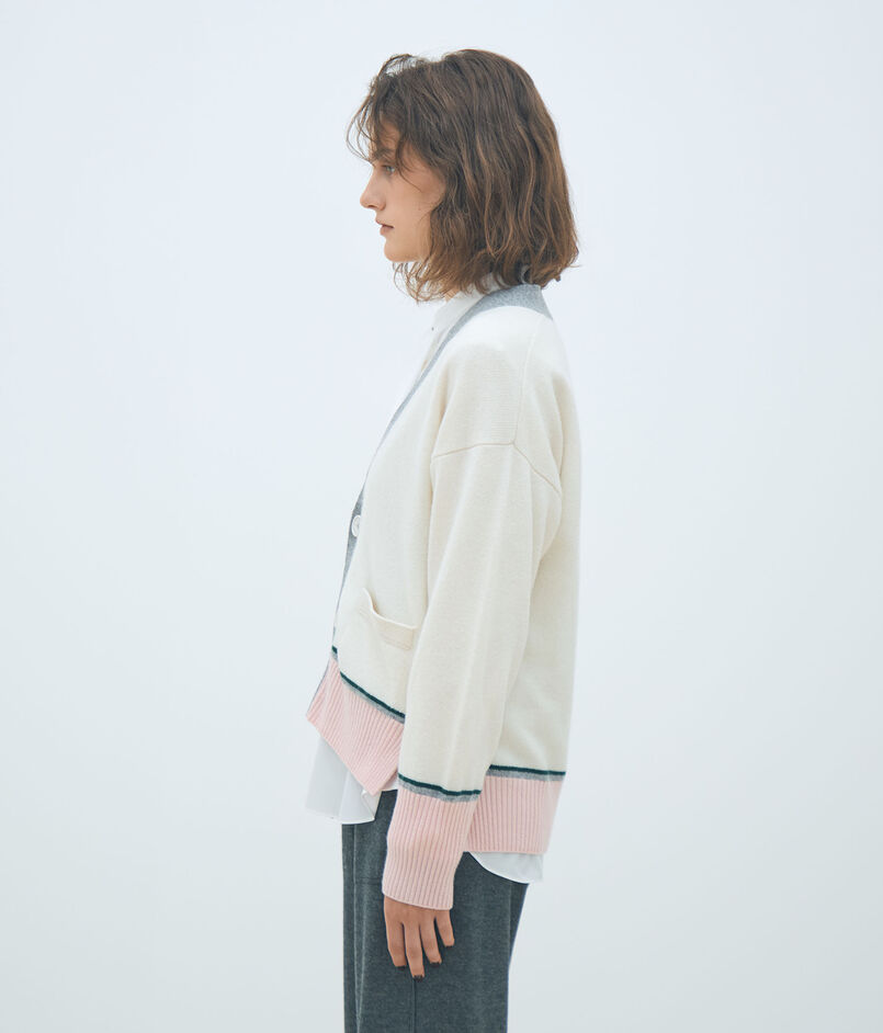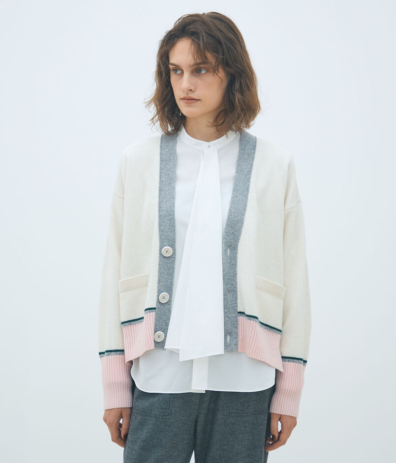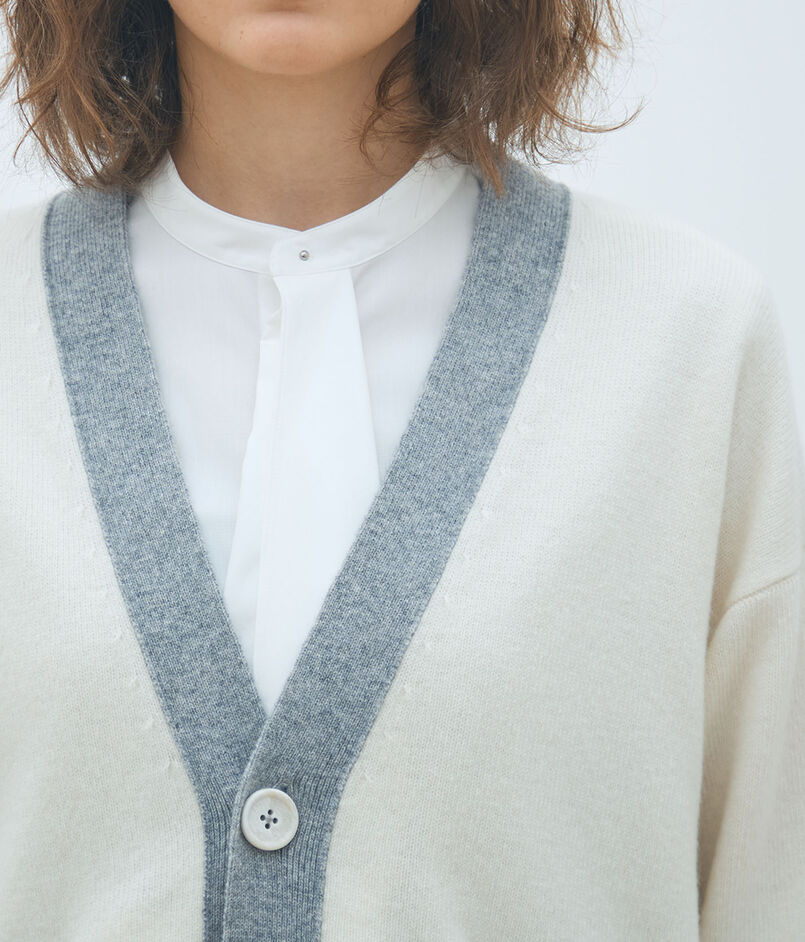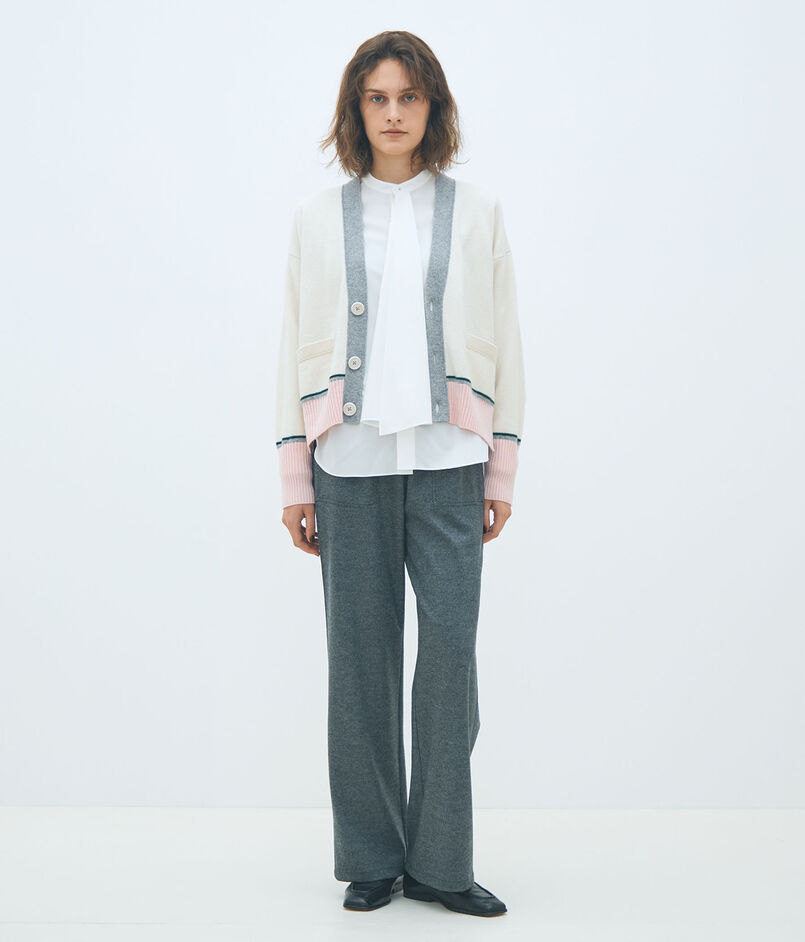 カーディガンはドロップショルダーにややゆとりのあるボリュームシルエットでリラックス感のある一枚。