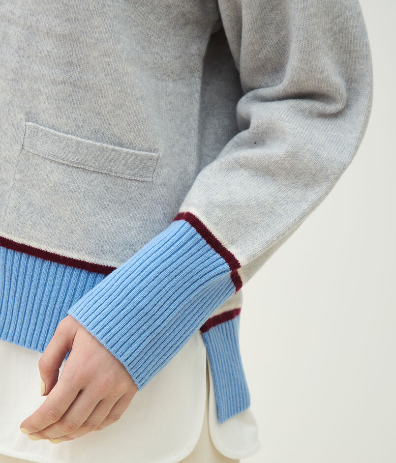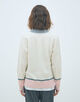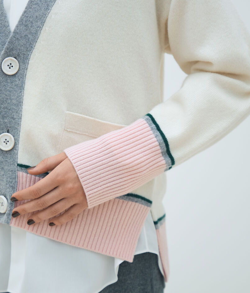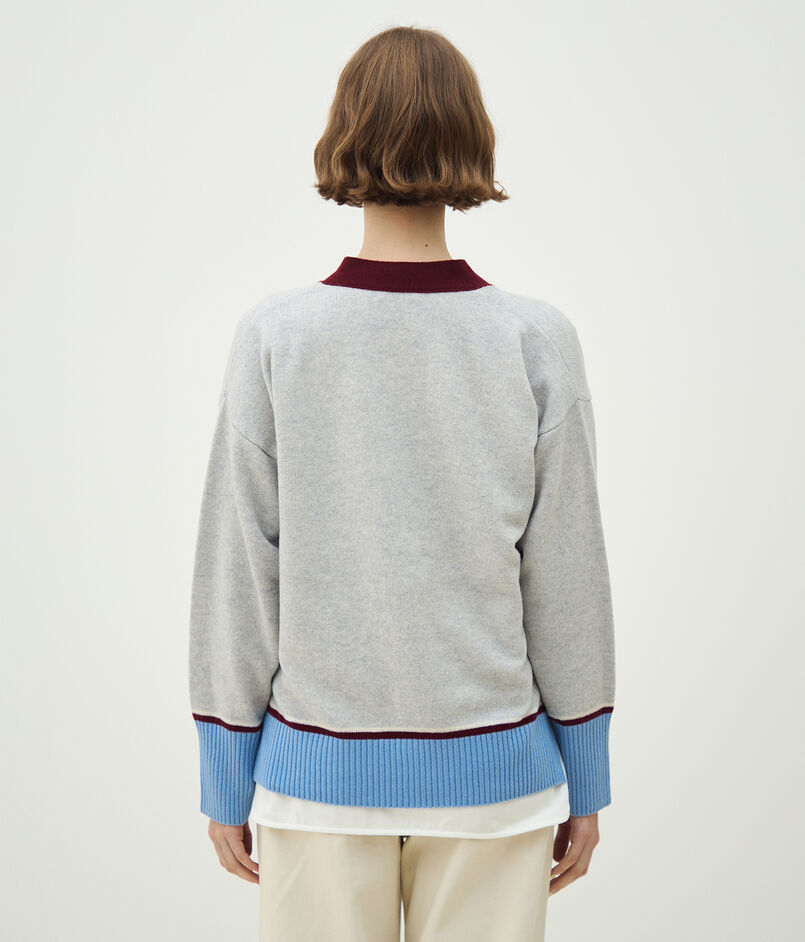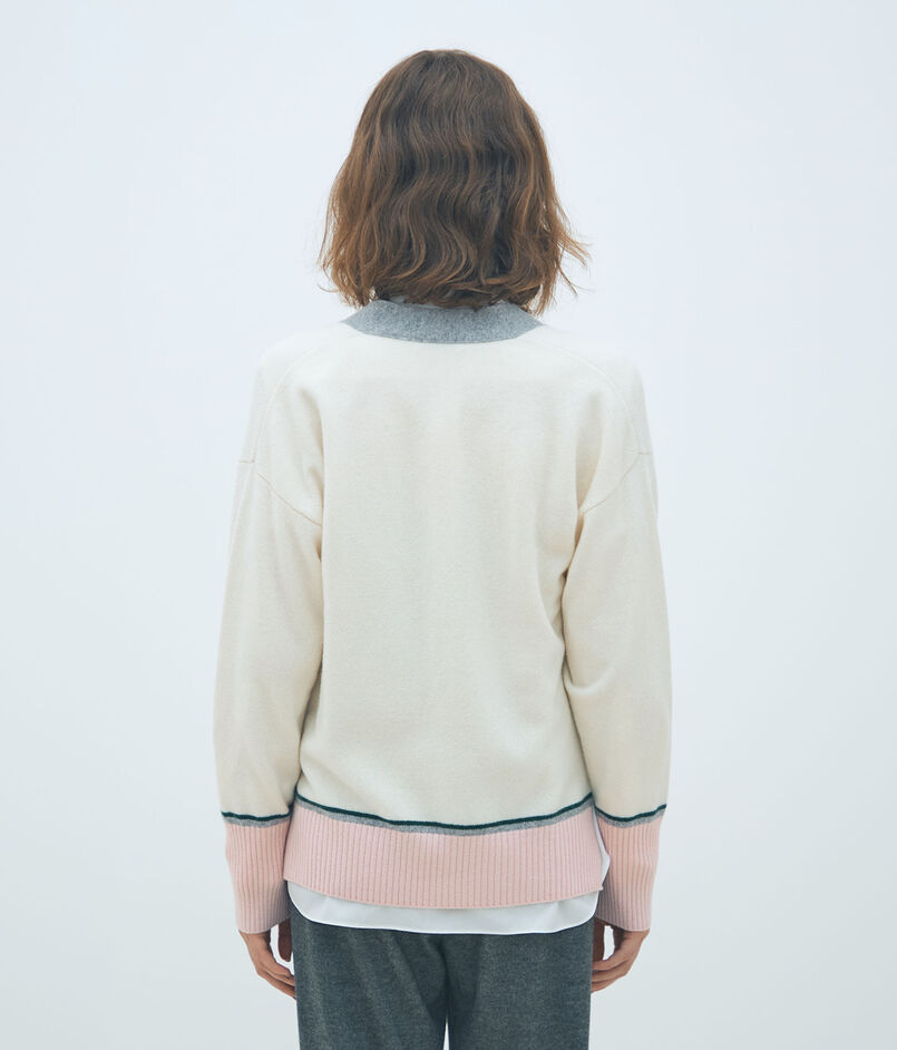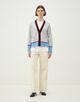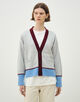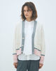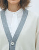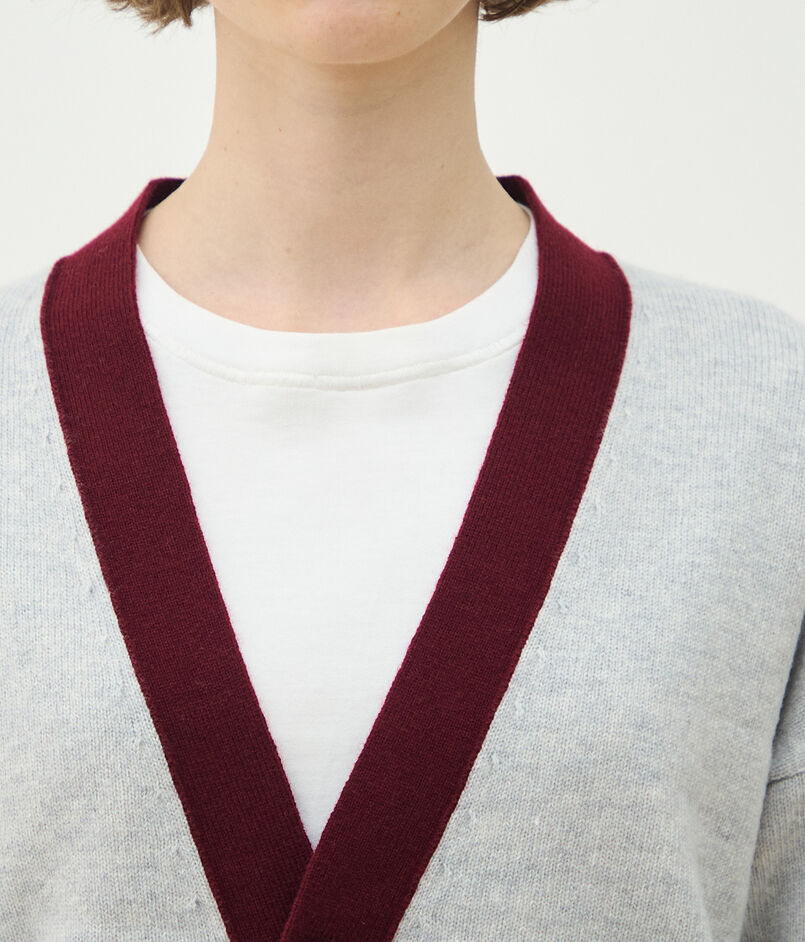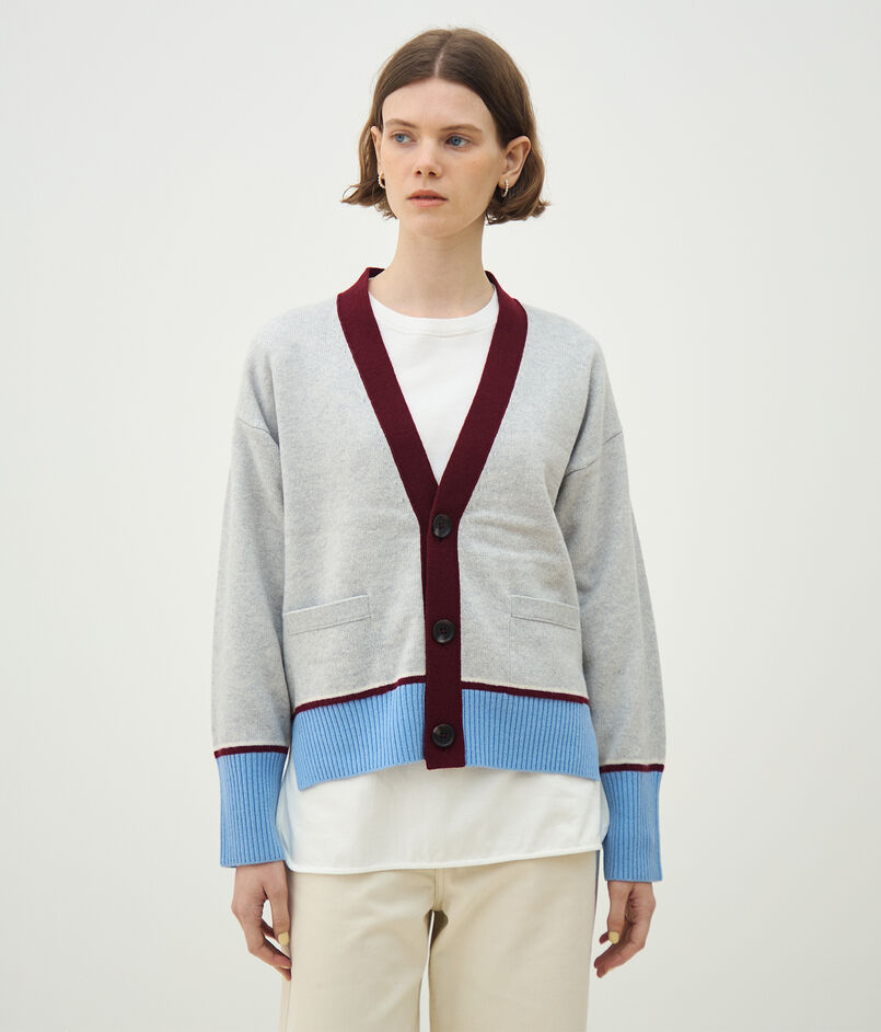 カーディガンはドロップショルダーにややゆとりのあるボリュームシルエットでリラックス感のある一枚。