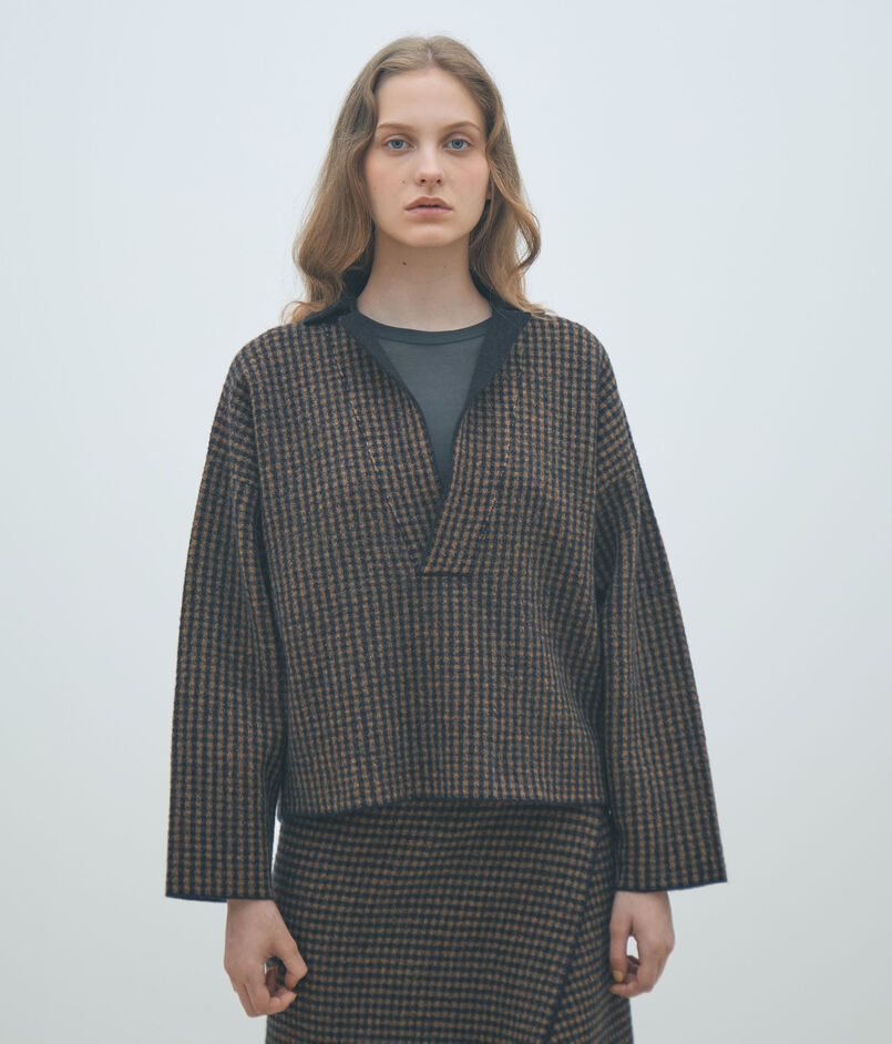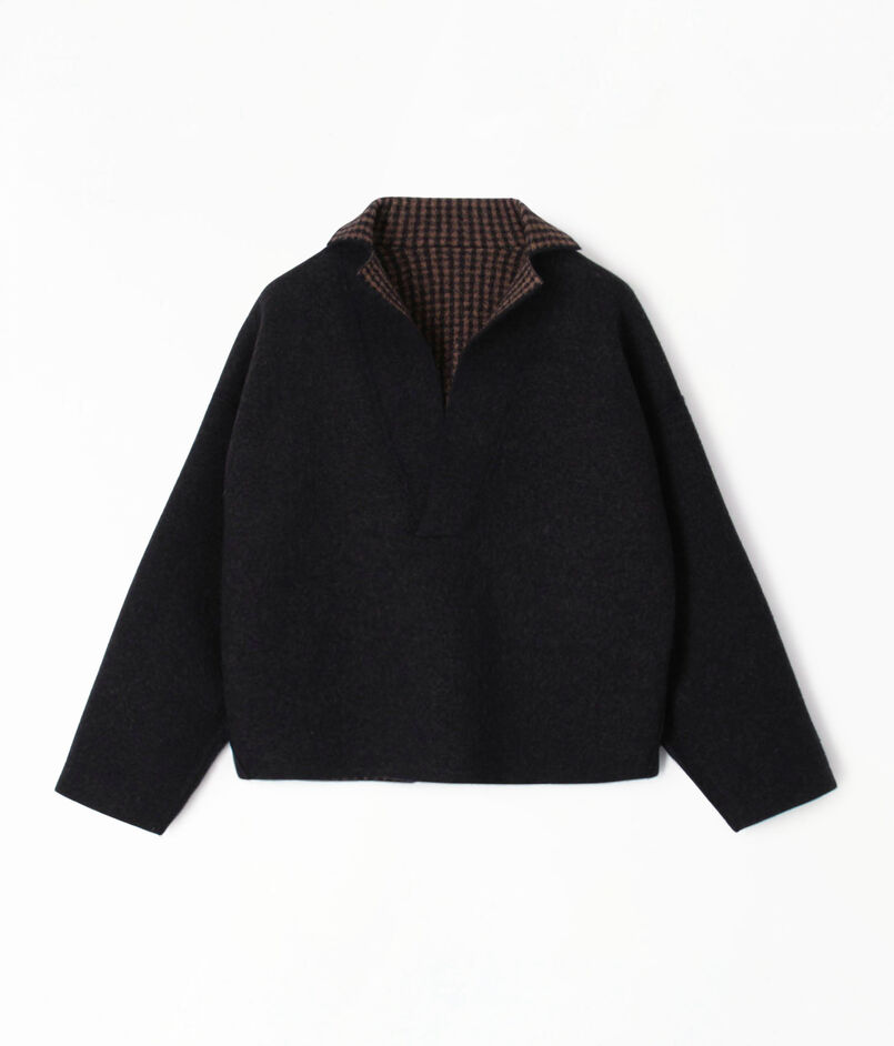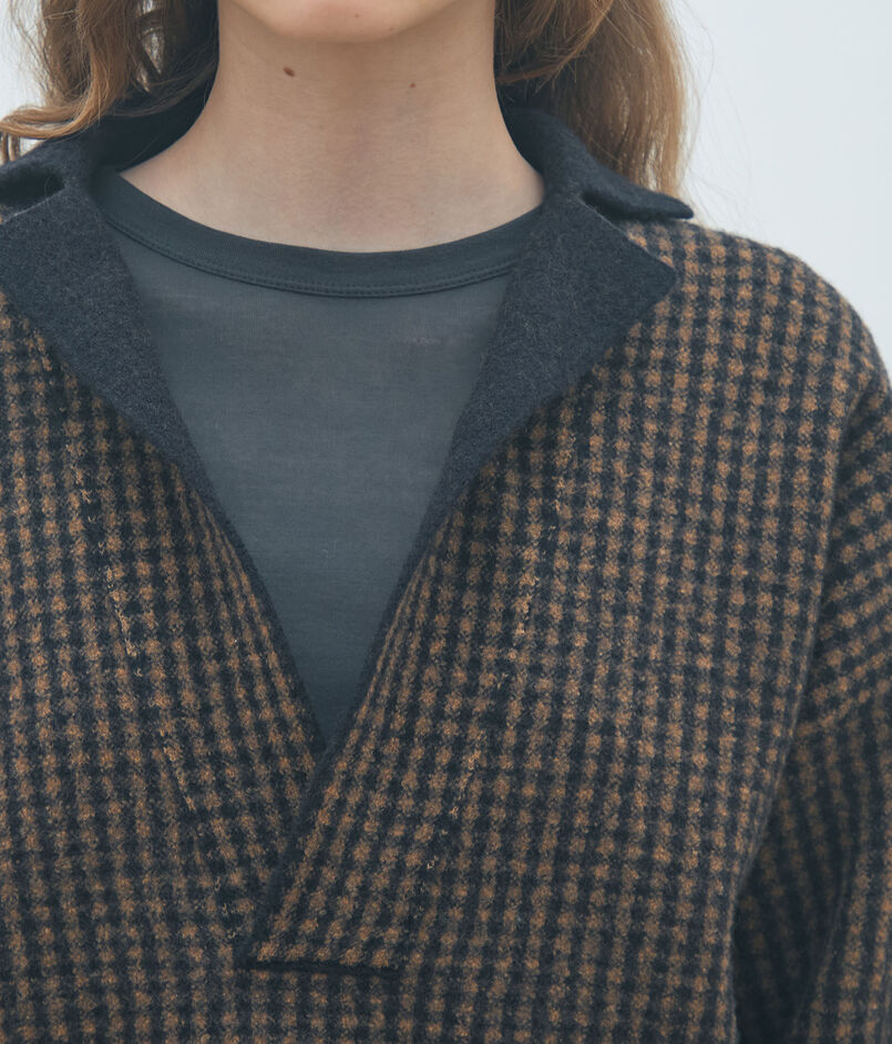 未防縮のウール糸で編み上げてから縮絨加工を施したフェルトライクな素材を使用したプルオーバー。