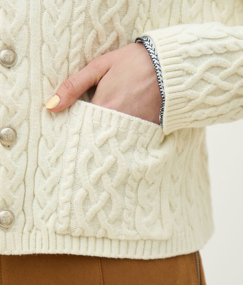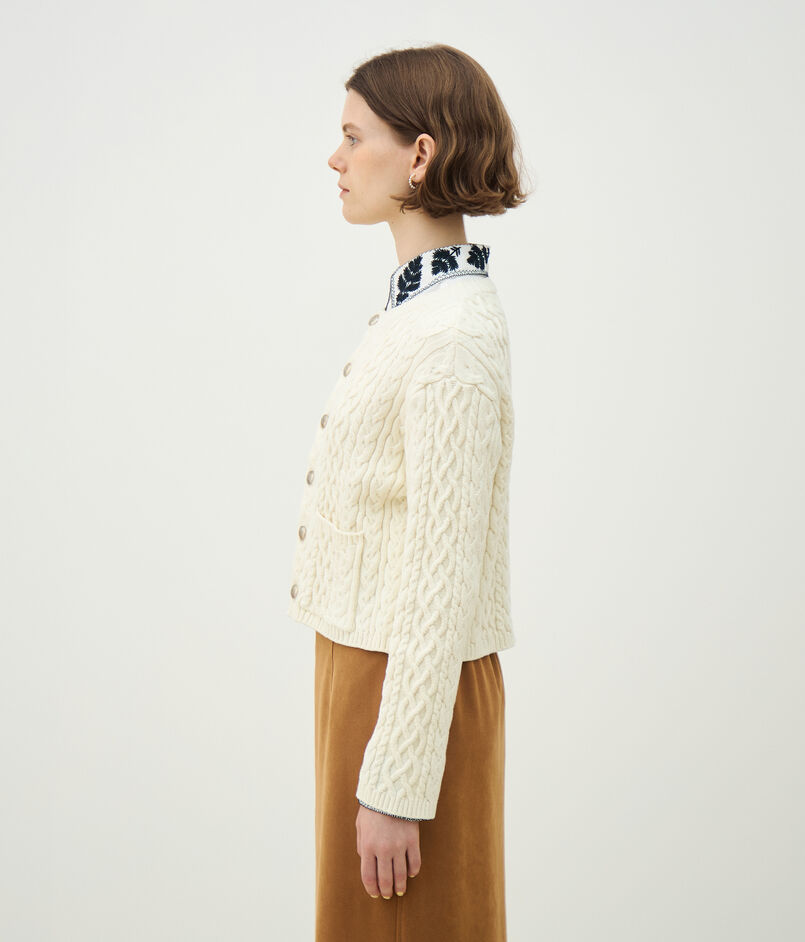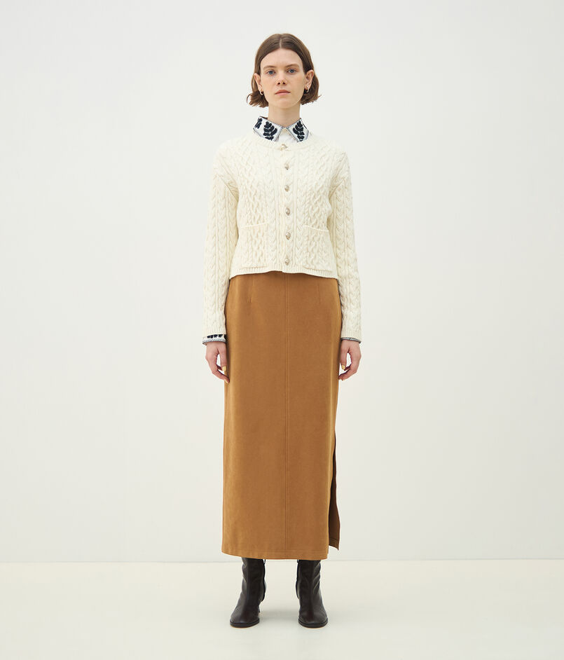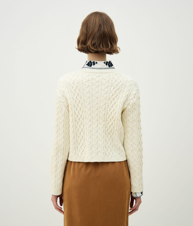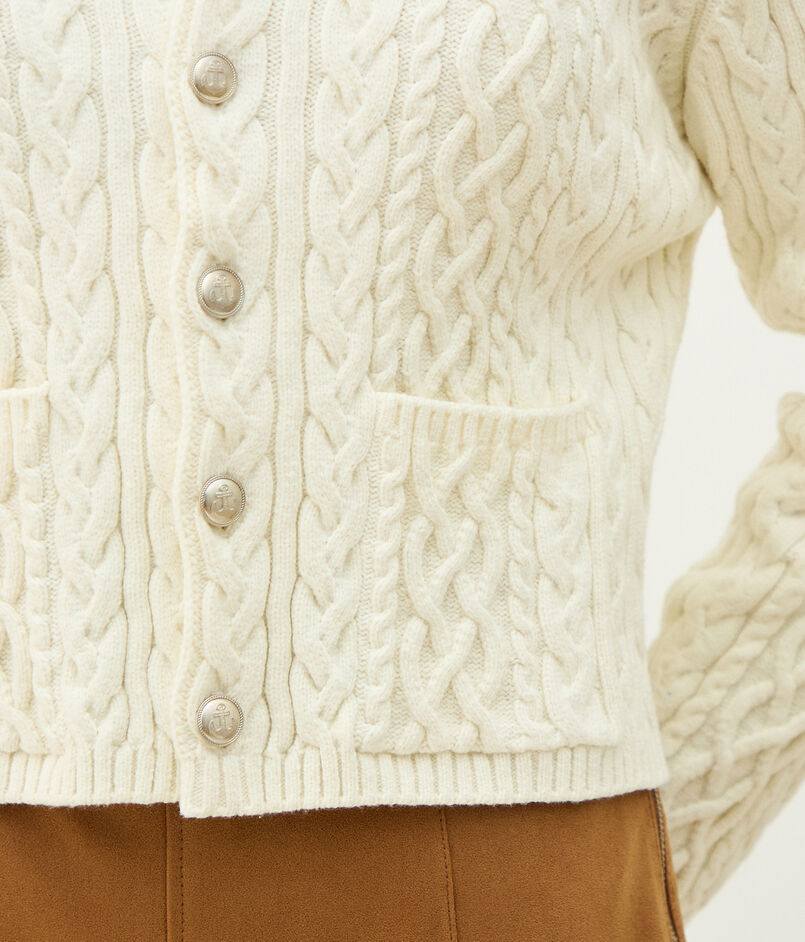 軽さとハリ感のあるオリジナル糸を使用し、計算された細やかなケーブル柄に編み上げた〈MACPHEE〉定番のニットシリーズ。
