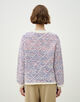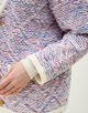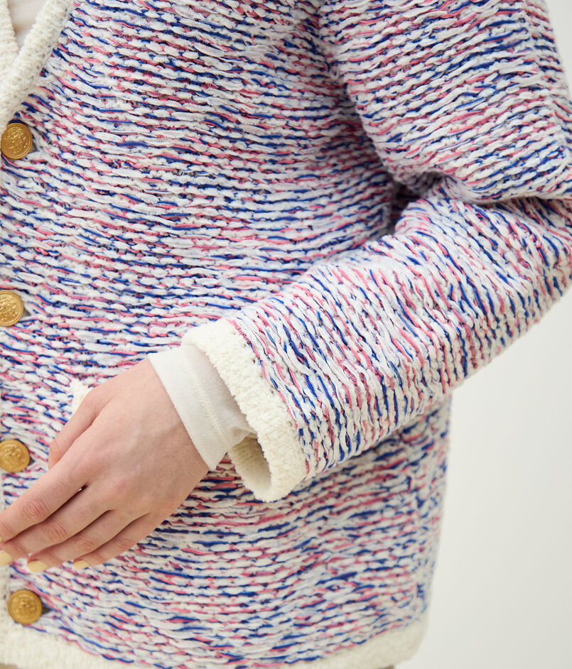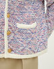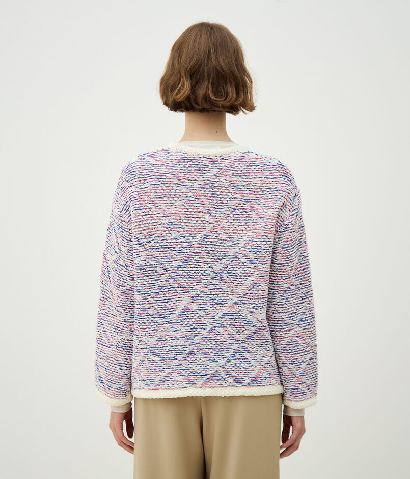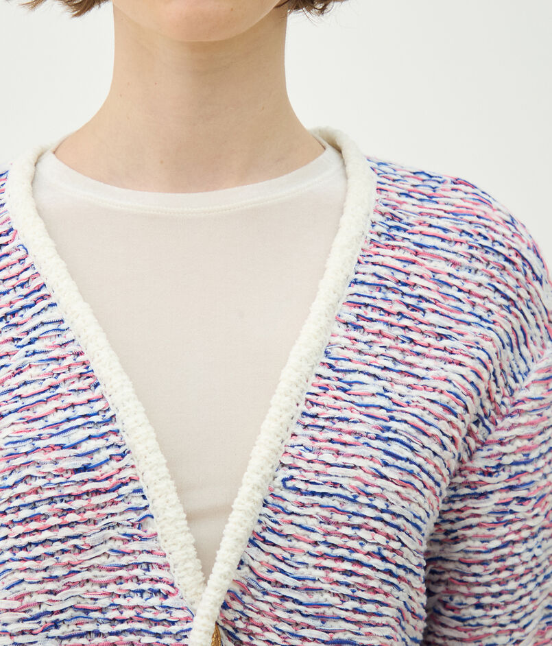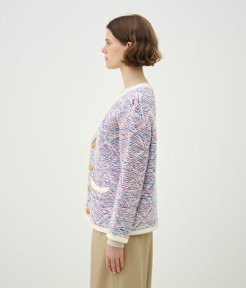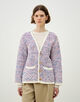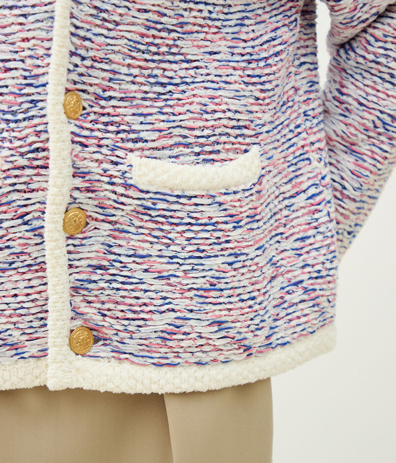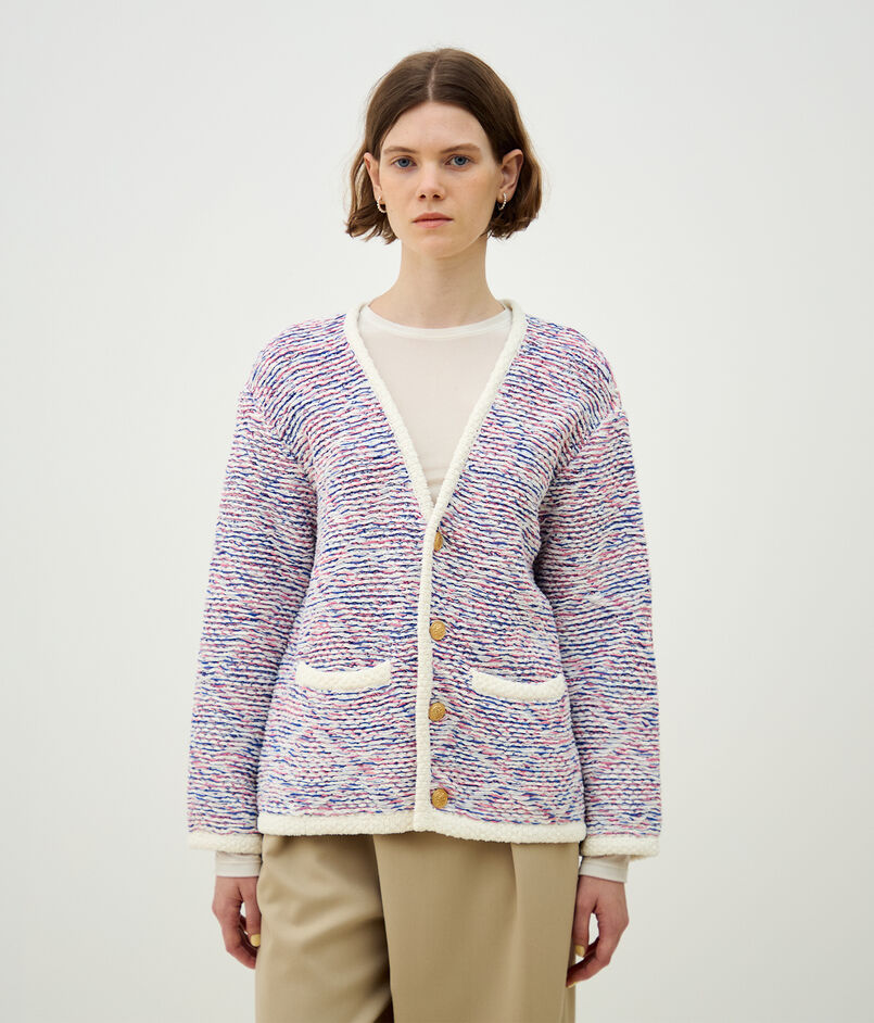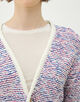 3色使いのテープヤーンと太さの異なるテープヤーンを組み合わせ、ジャカードに編み上げることで複雑で凹凸感のあるチェック柄に仕上げたニットカーディガン。
