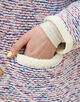 配色のパイピングディテールやブランドオリジナルのエンブレムボタンでほど良くアクセントをつけています。