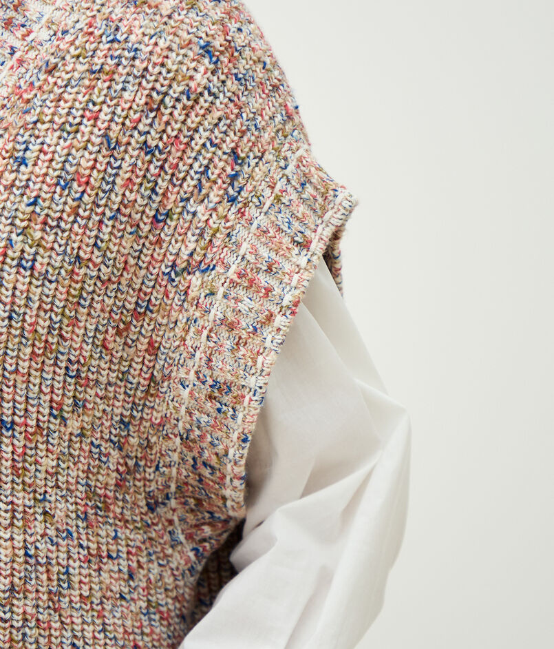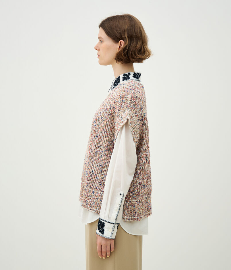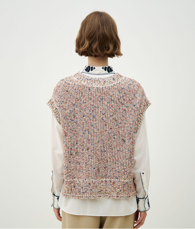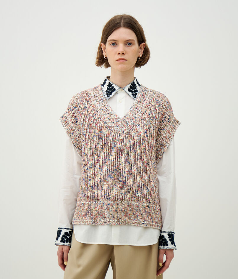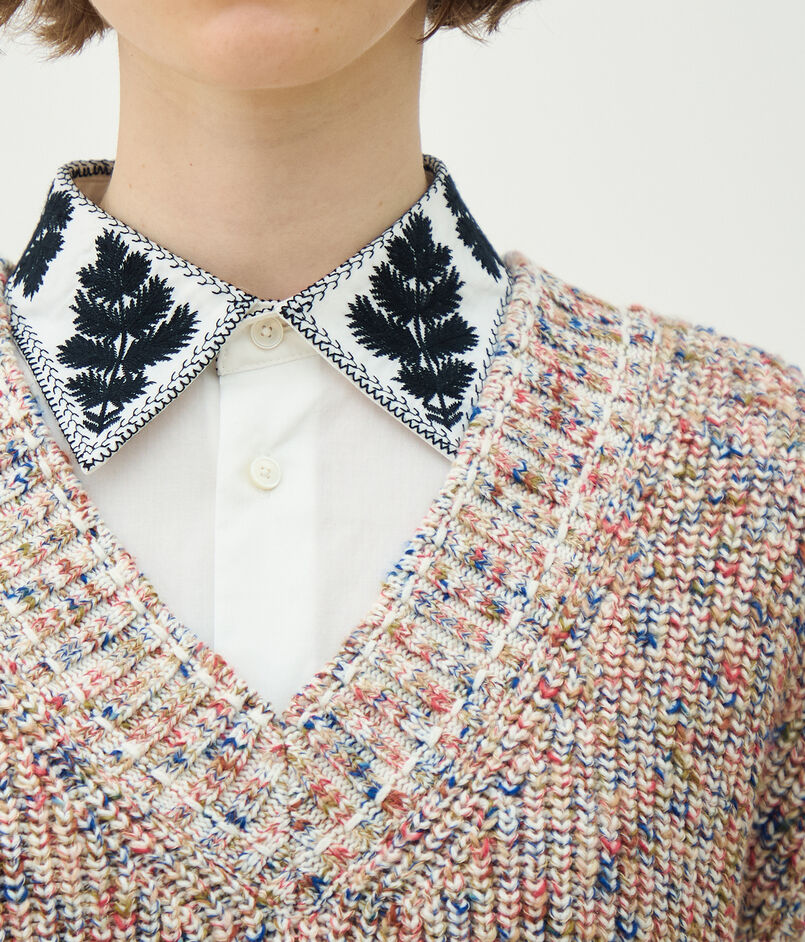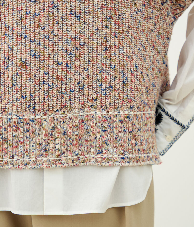 軽さとハリのあるオリジナルのコットン糸とカラフルなかすり糸を一緒に編み上げ、〈MACPHEE〉らしいツイーディーな表情に仕上げたニットシリーズ。