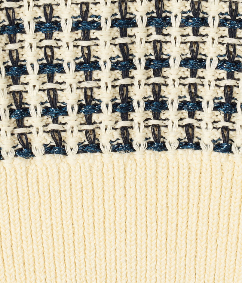 ドライな質感と清涼感を感じられる肌触りが特徴の擬麻加工を施したコットン糸をベースにラメ糸を多色使いし、チェック柄を表現しています。