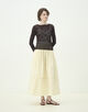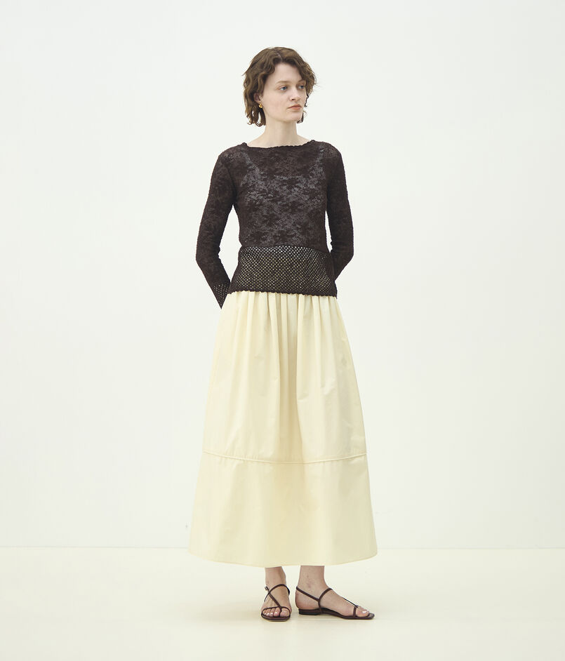 フェミニンな印象ながらメッシュ柄と組み合わせ、カジュアルな素材を使用することで着回しやすい表情に仕上げています。