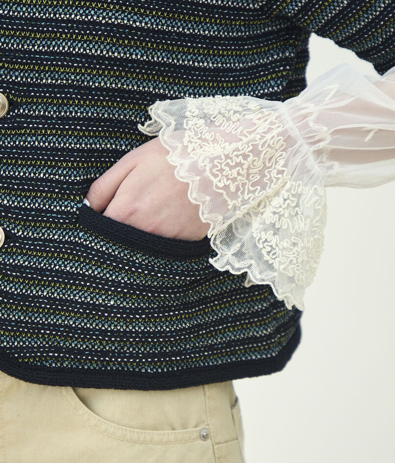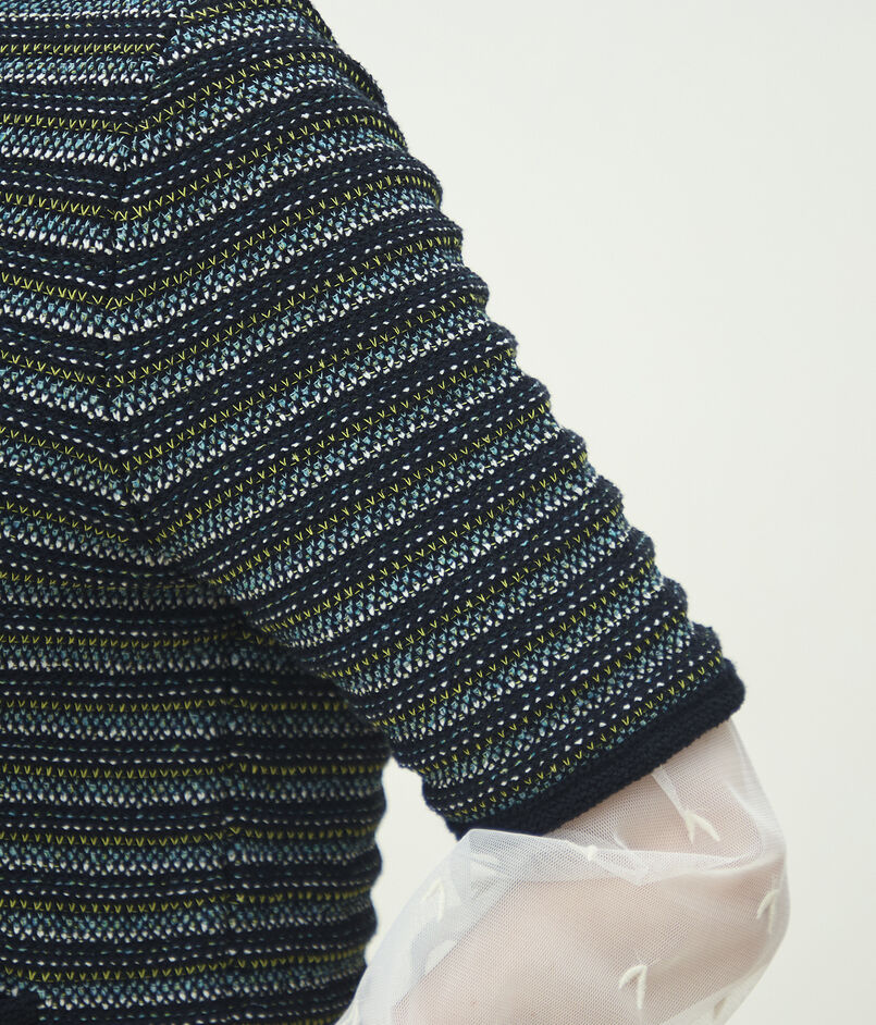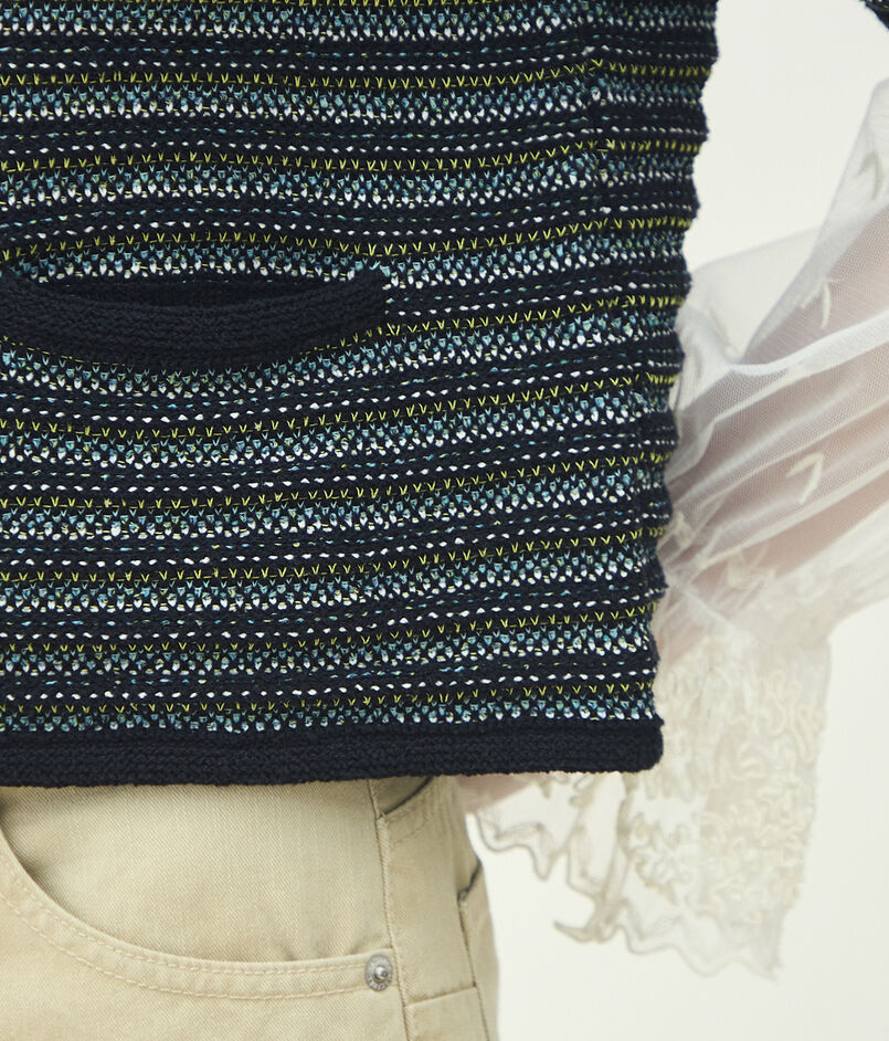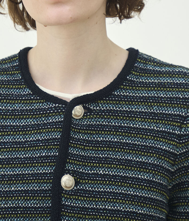 多色・別素材を複雑に編み込み、凹凸のある豊かな表情に仕上げたツイードニット素材を使用したジャケット。