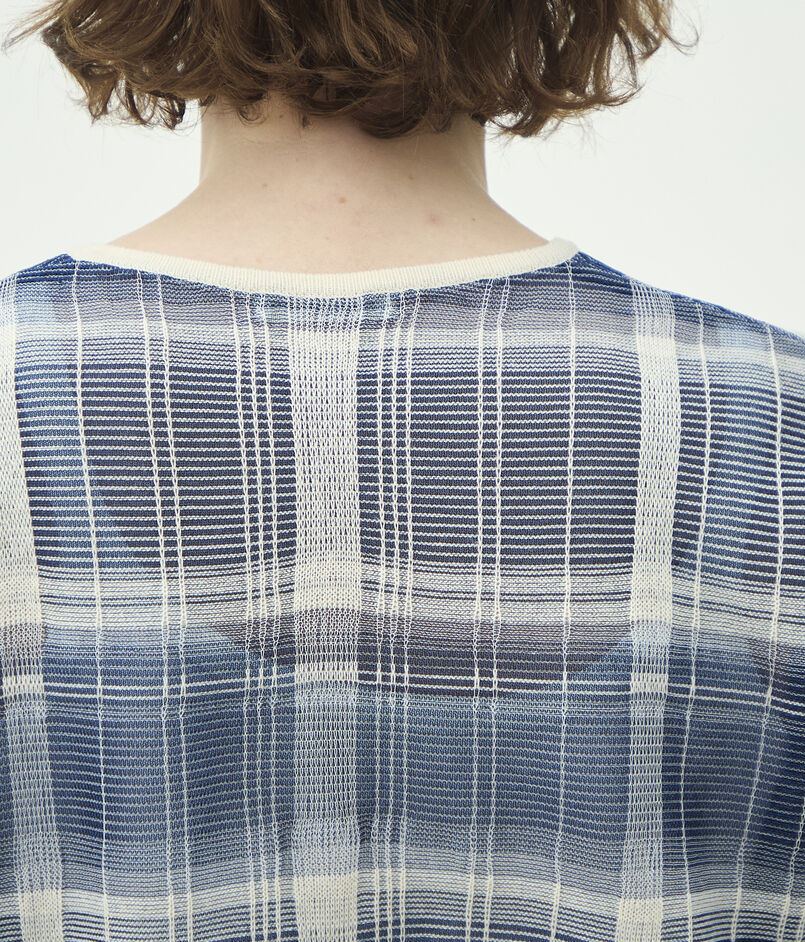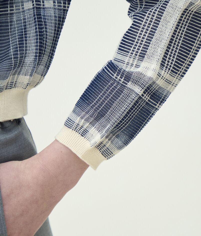 太さの異なる2種類の糸で表情のあるチェック柄に織り上げたニットシリーズ。