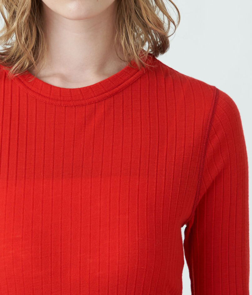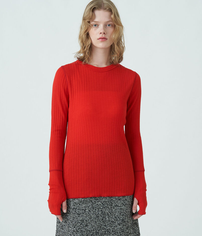 良質なウール糸をプリーツリブ組織に編み立てたジャージー素材のプルオーバー。