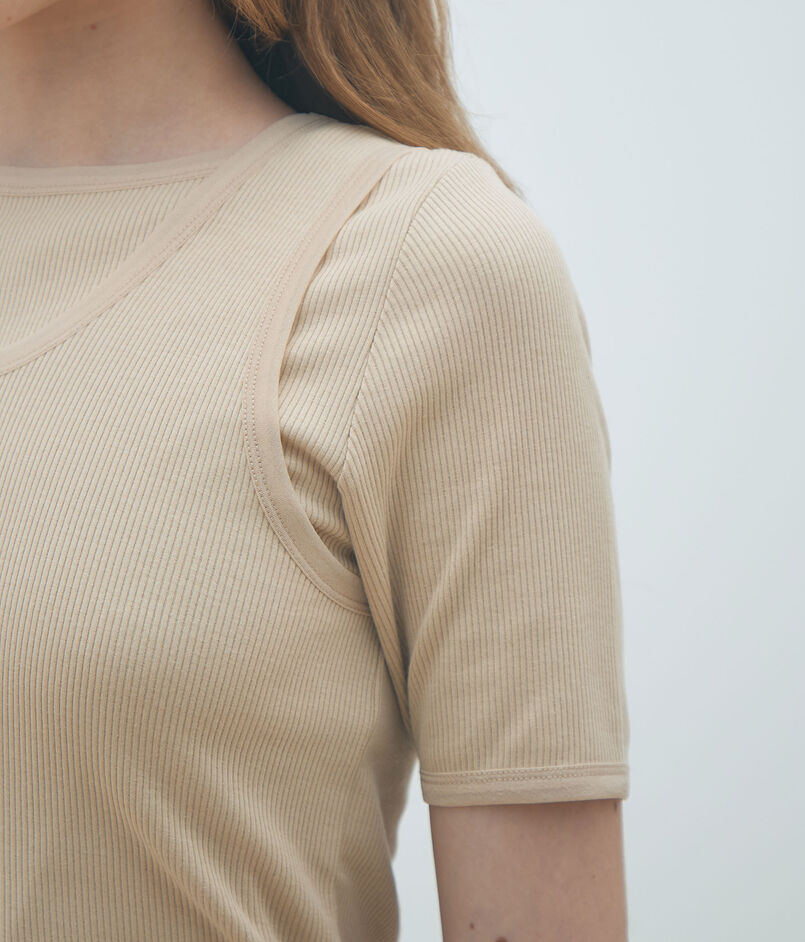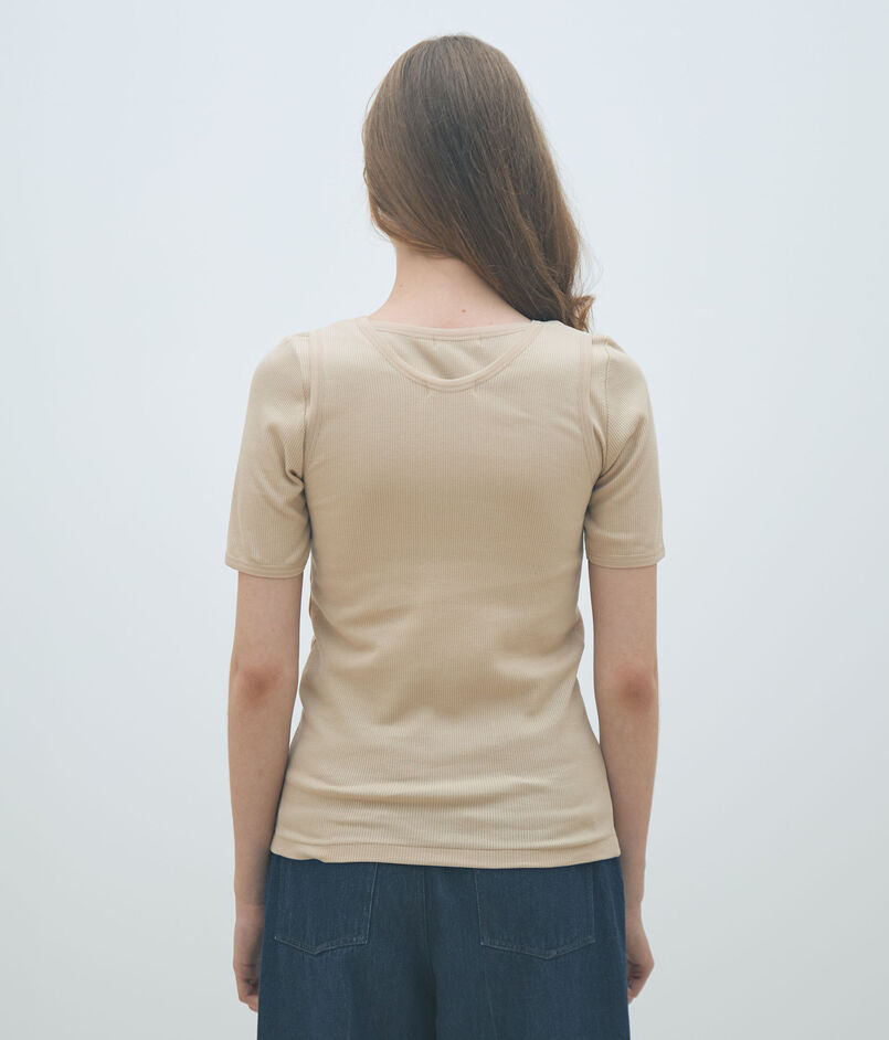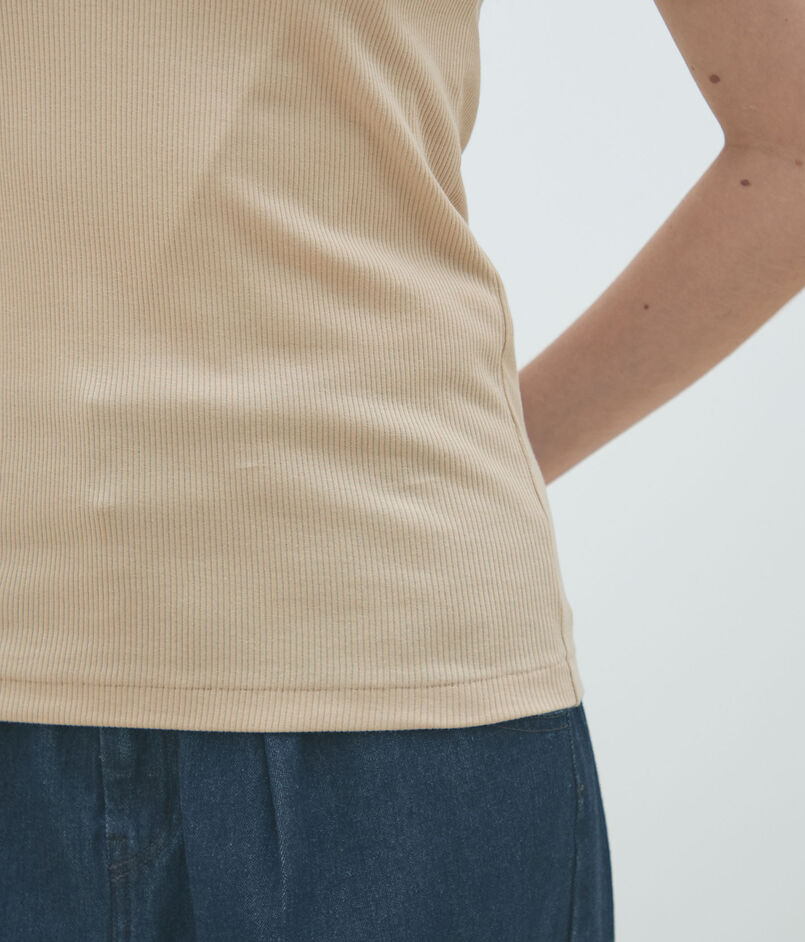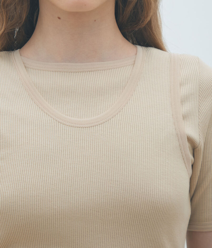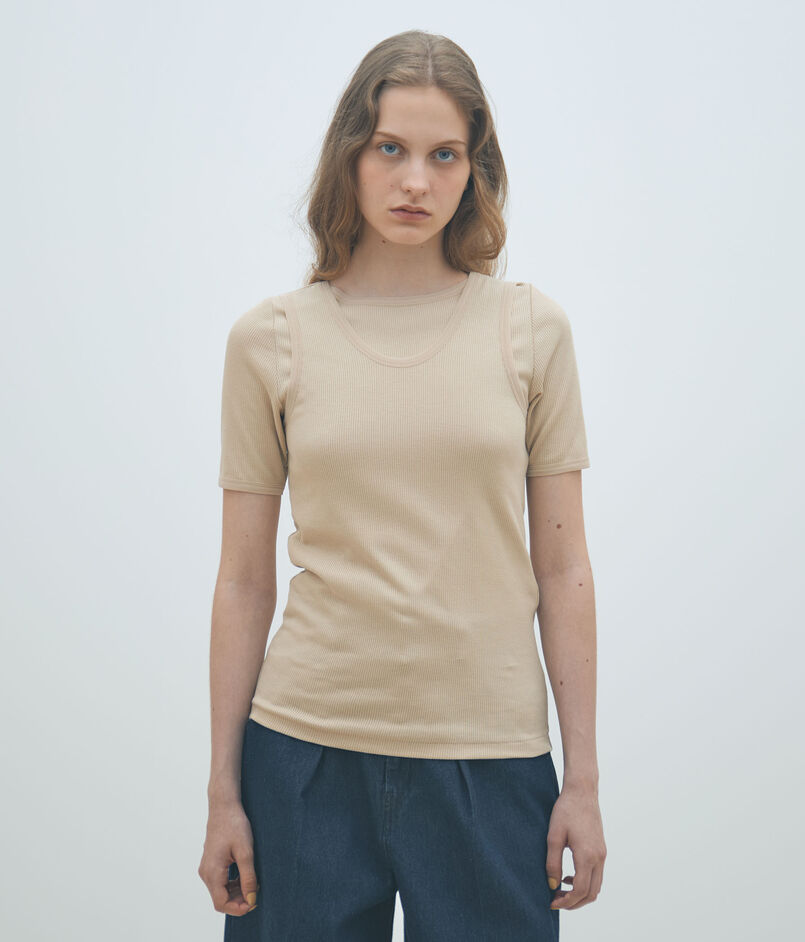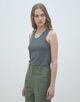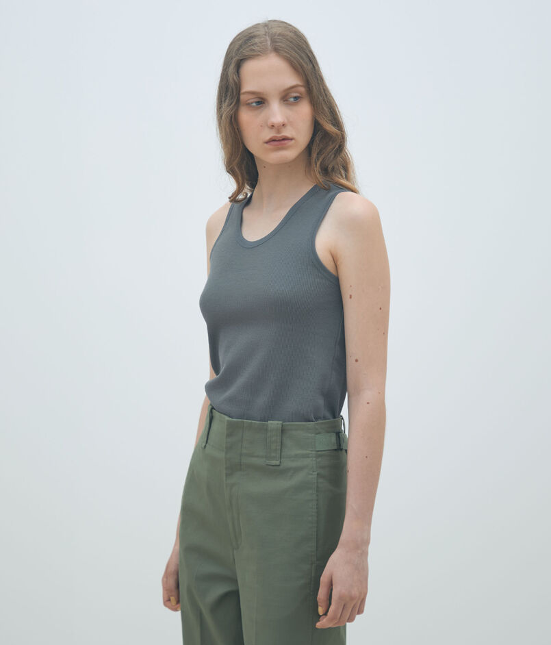 ほど良くフィット感のあるシルエットと太めのストラップでヘルシーな印象のタンクトップ。