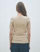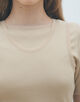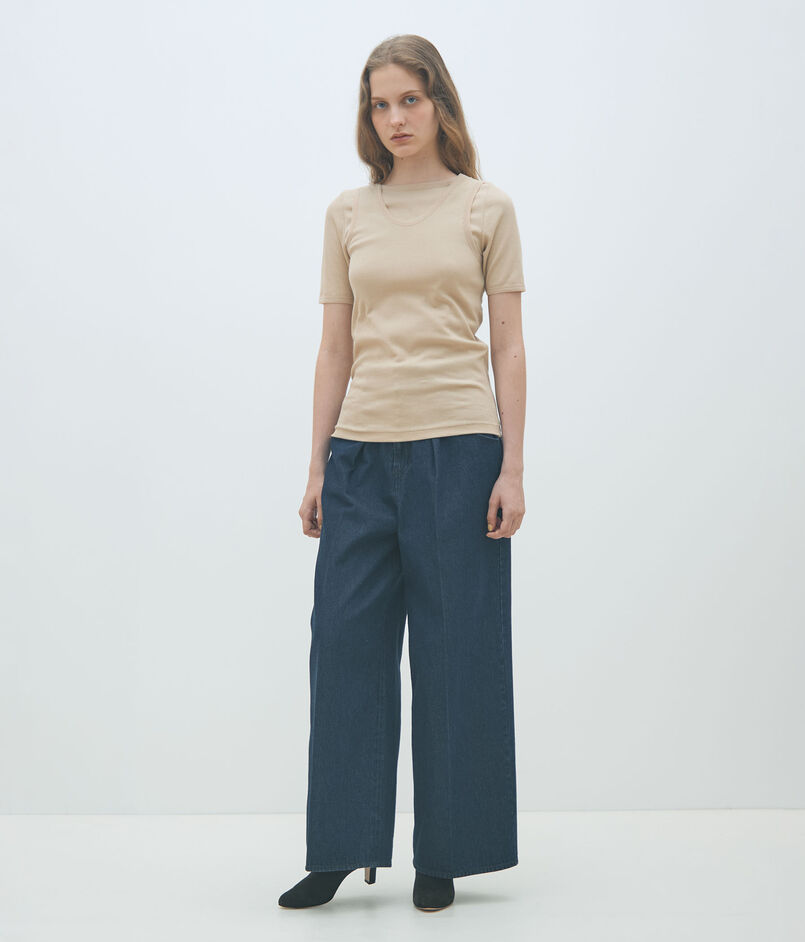 襟とアームホールはトリコット組織のシアー素材でバインダー始末することで、ベーシックなデザインにアクセントをつけています。