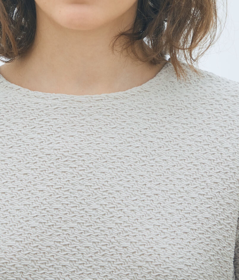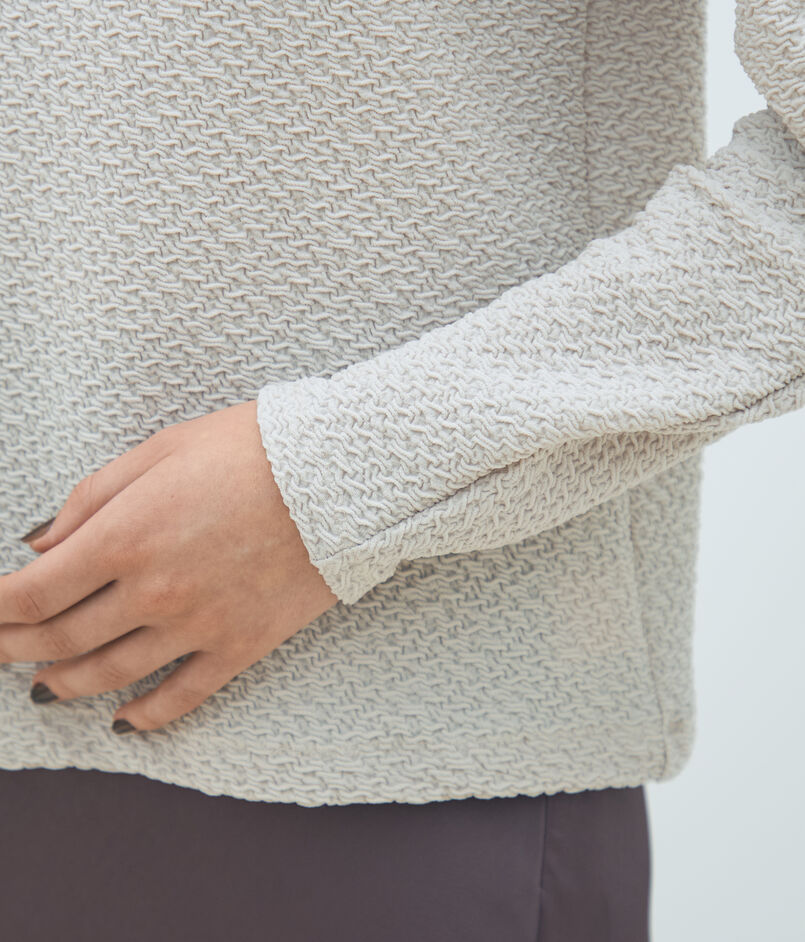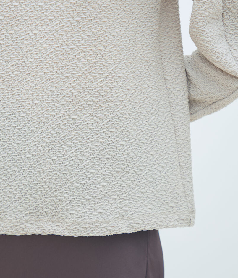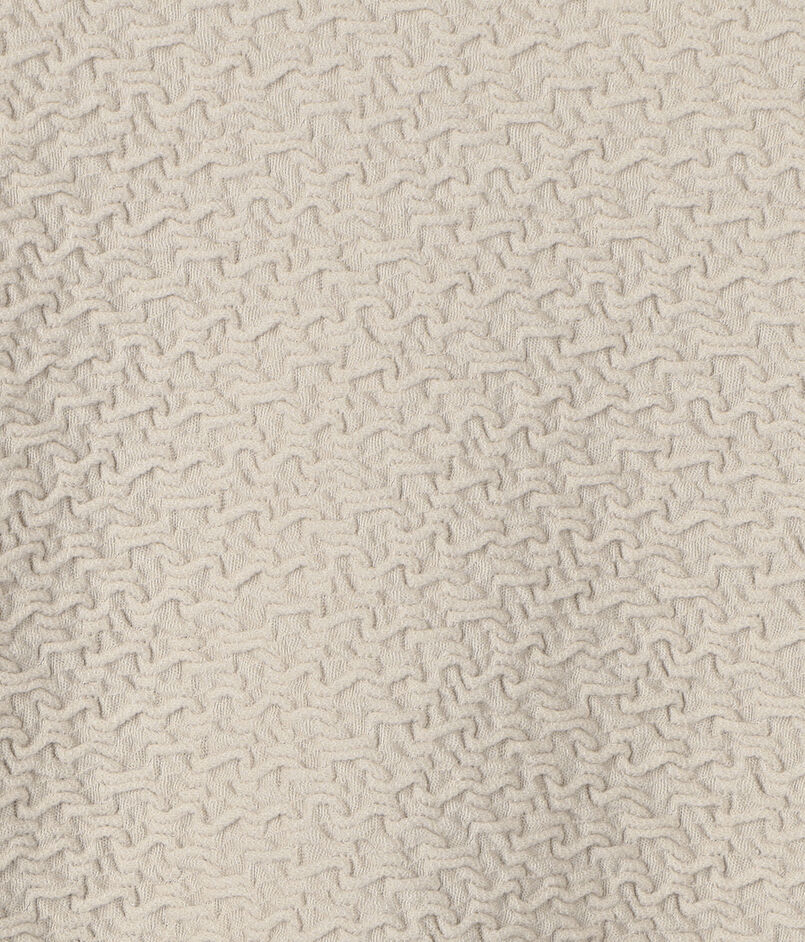 台数の少ない希少で特殊な編み機を使用し、伸縮性のある糸を入れ込んでシャーリングでジャカードを表現しています。