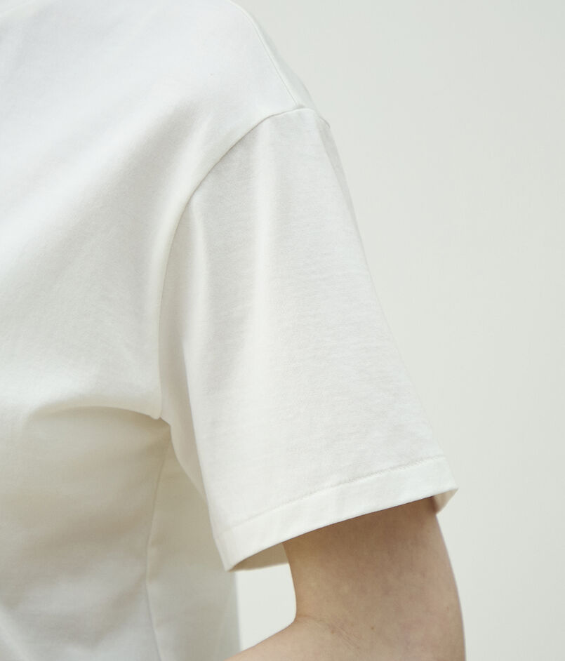 絶妙なゆとりを持たせつつ、ネックラインをきゅっと詰めることでヘルシーかつクリーンなバランスに仕上げた一枚。