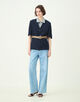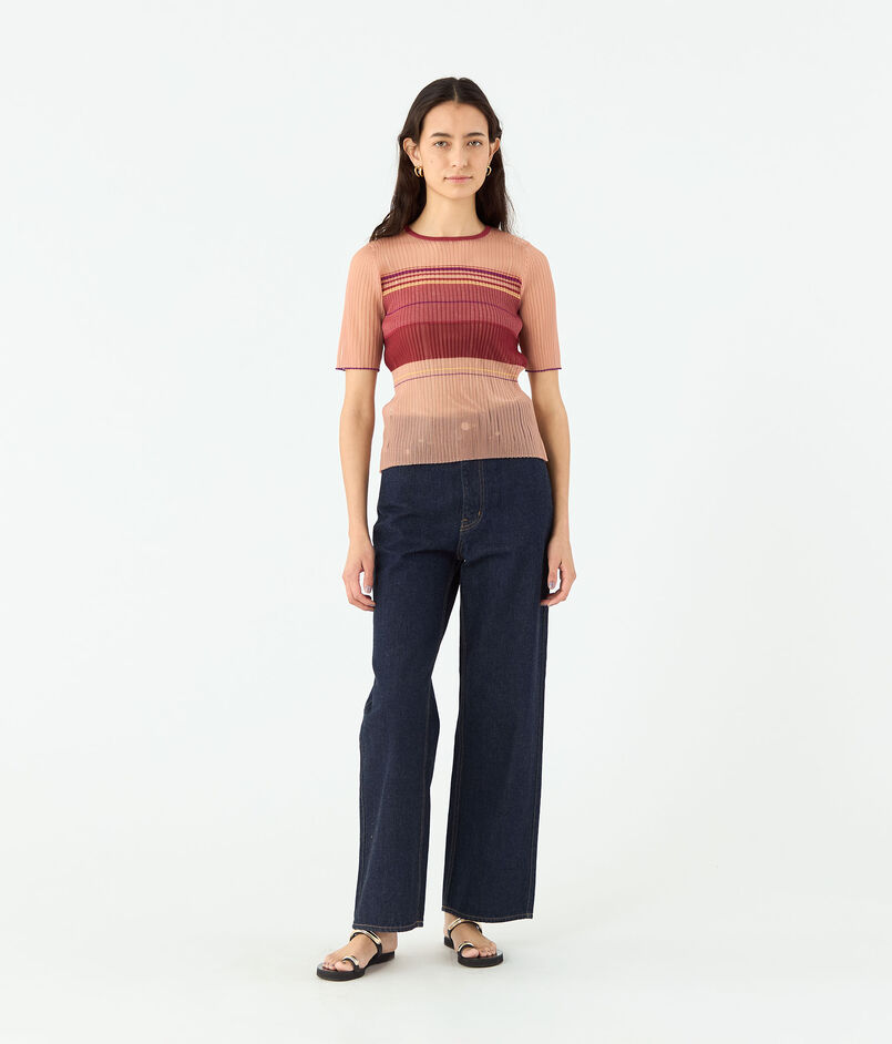 ストレートパンツはほど良くゆとりのあるシルエットで抜け感がありつつも、ハイウエストのデザインや腰まわりをややタイトにすることですっきりとしたバランスに。
