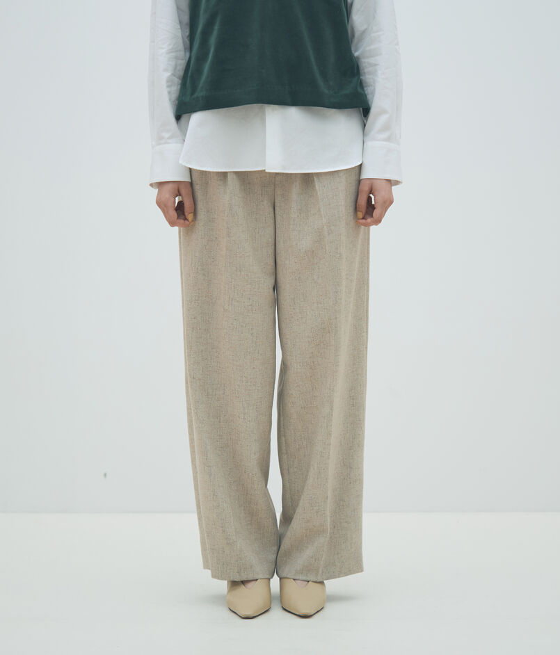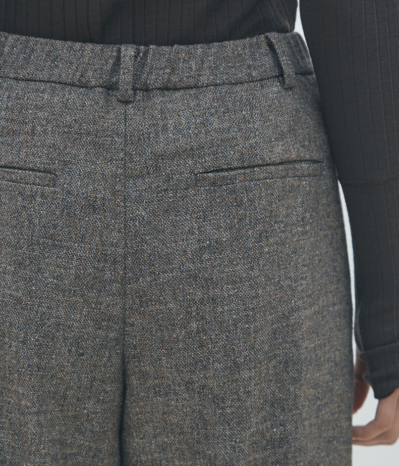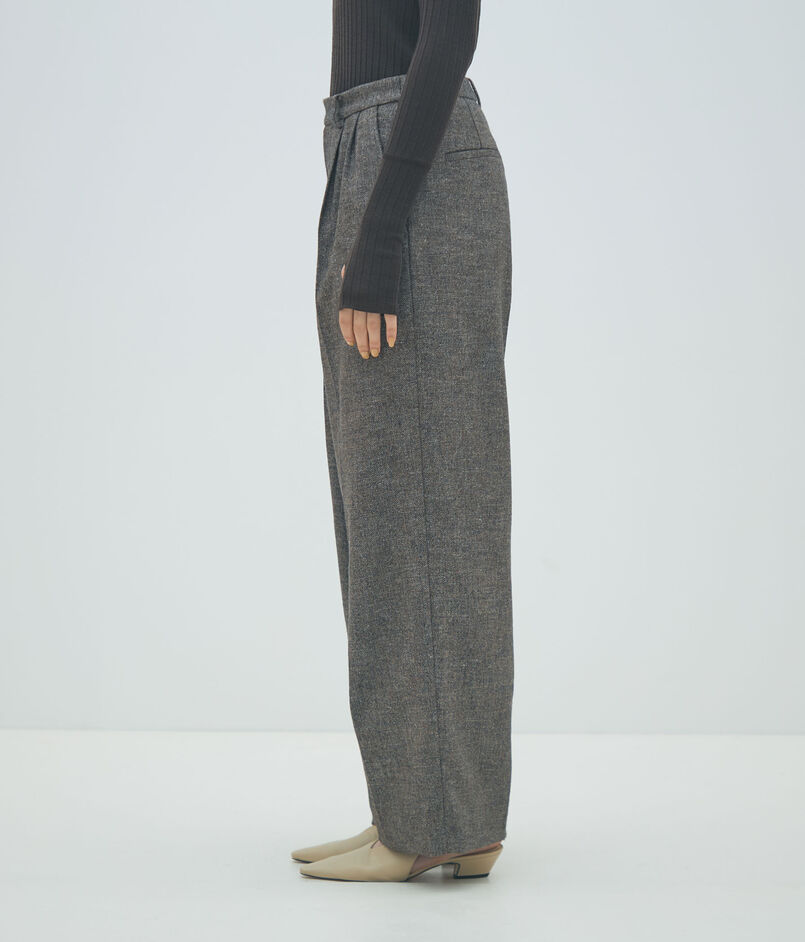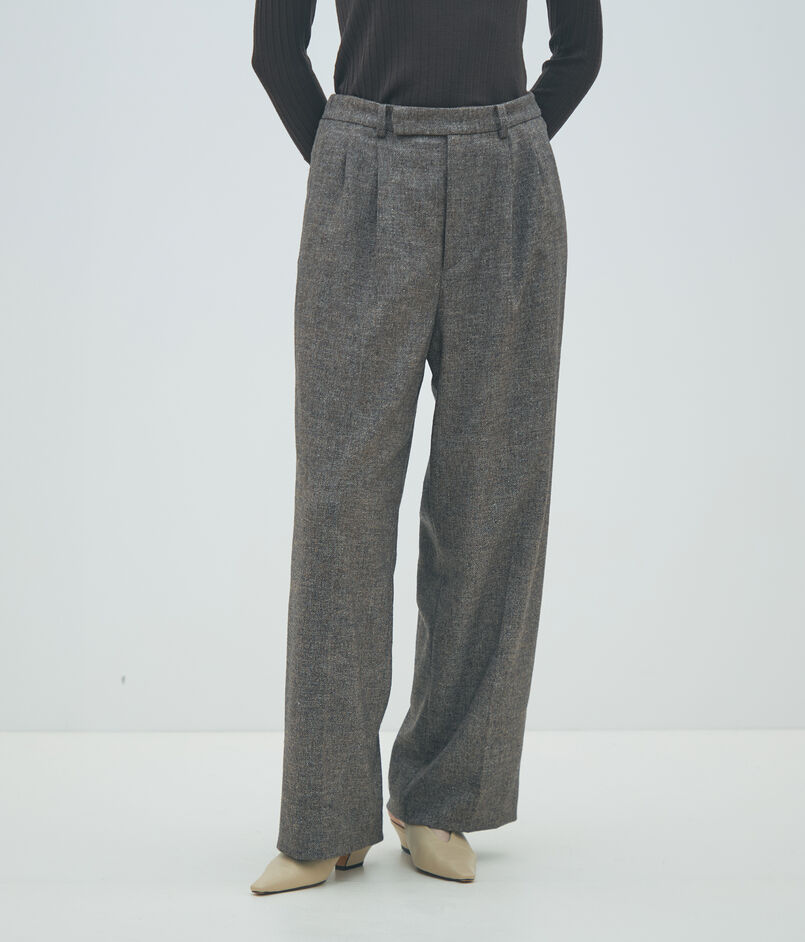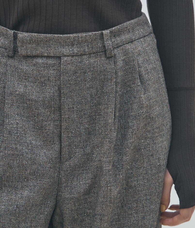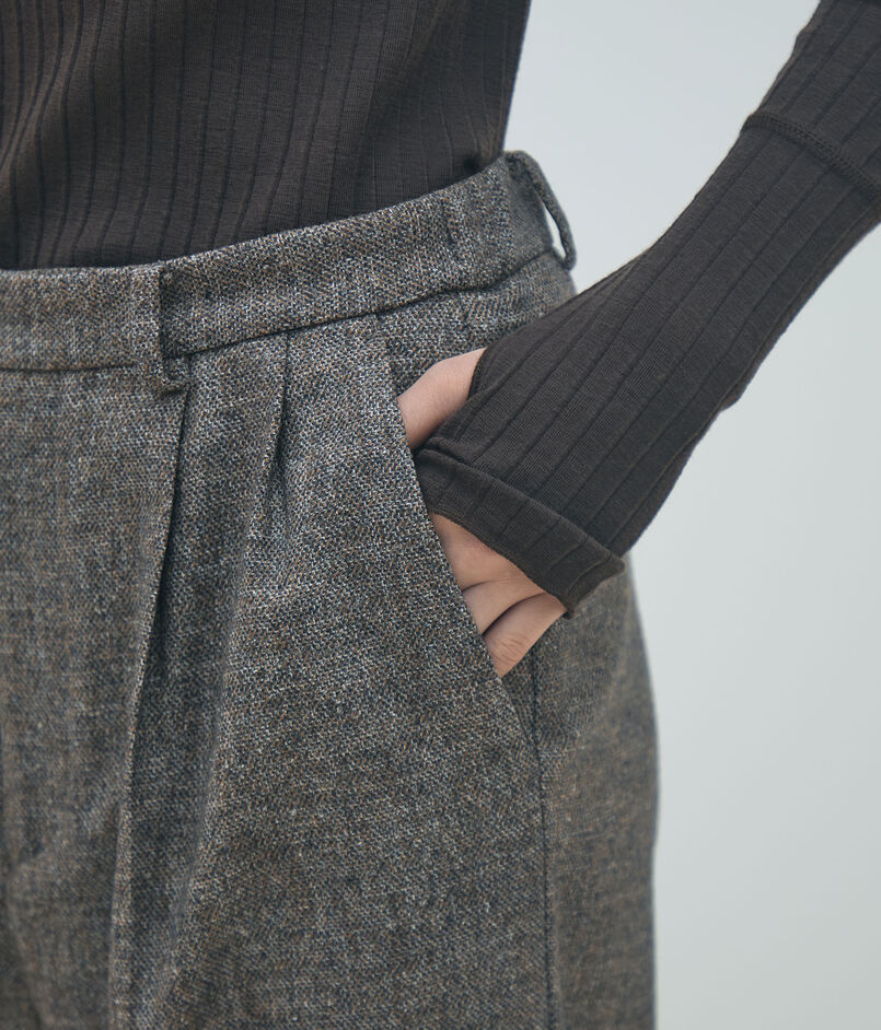 タテ糸にリサイクルウールとポリエステルの杢糸を、ヨコ糸にはシルクネップとポリウレタンを使用した、ウォーム感がありながらも締まりのあるタッチが特徴のツイード素材のパンツ。