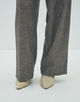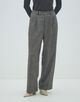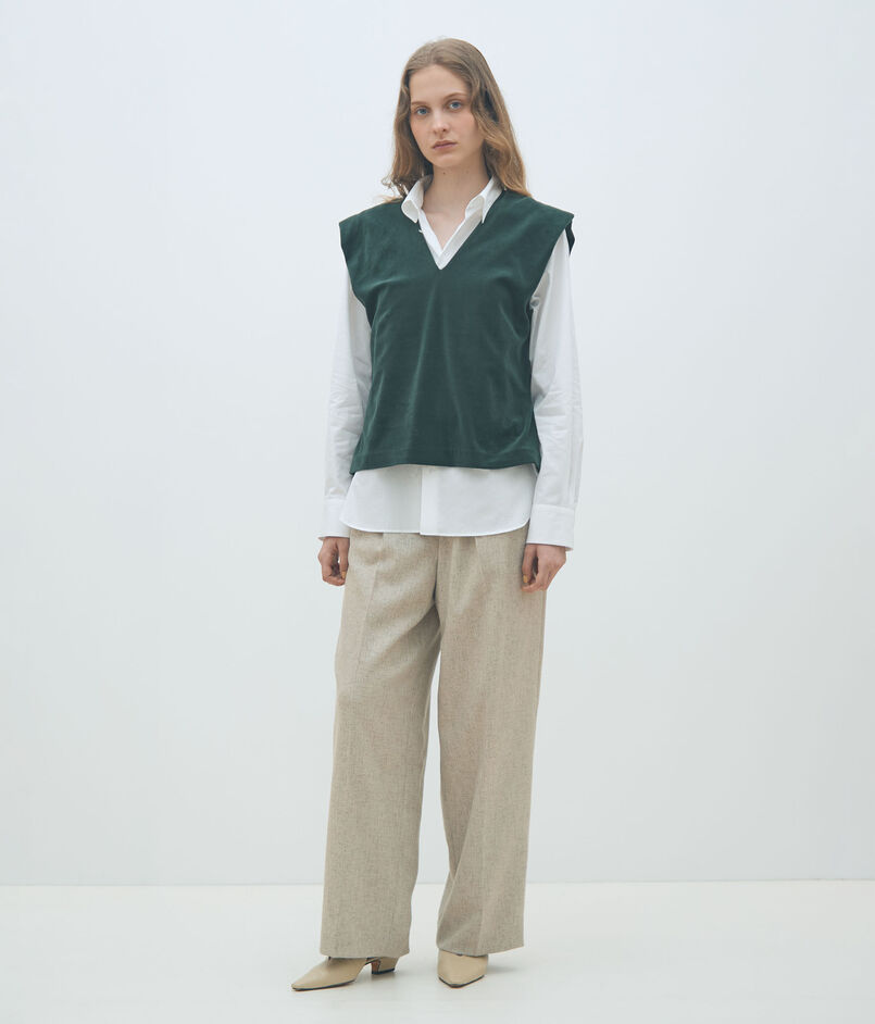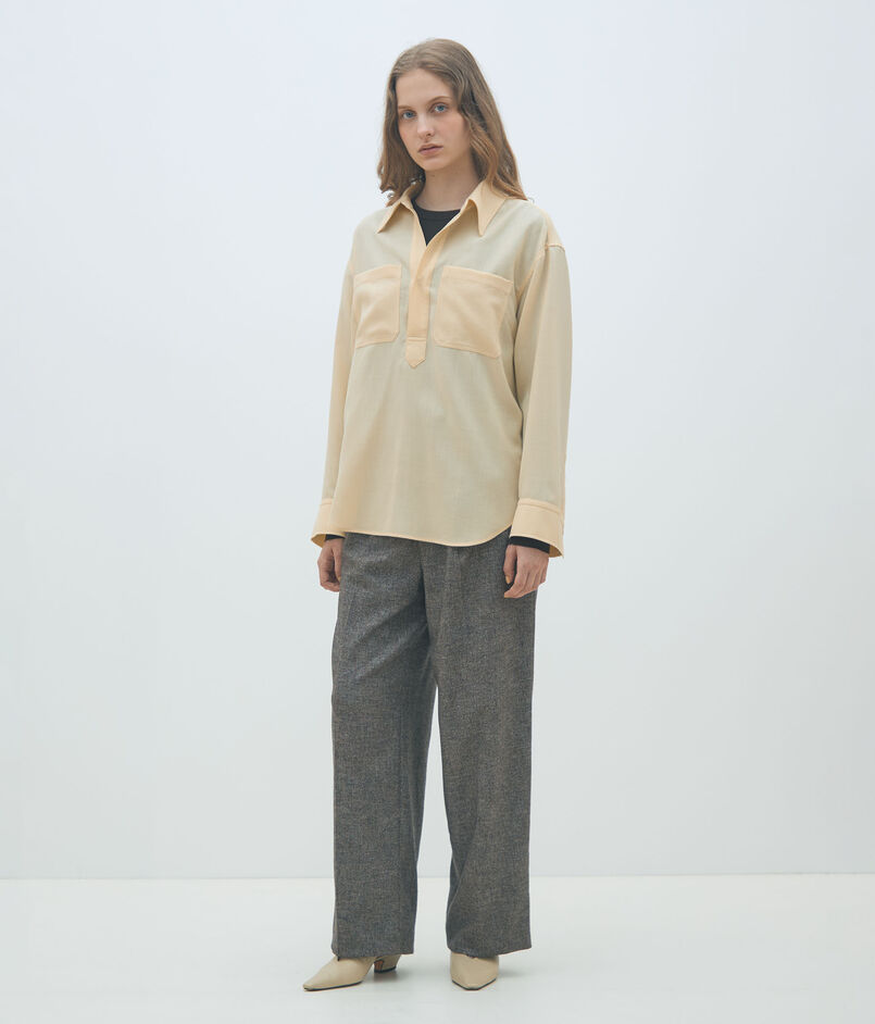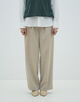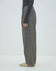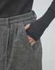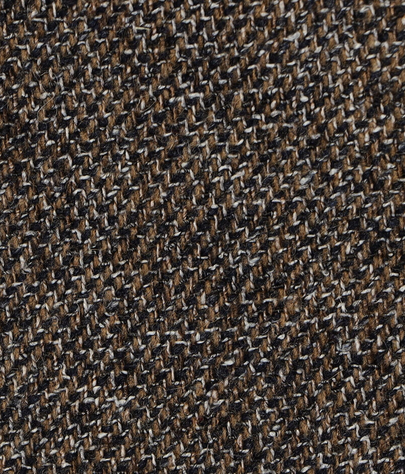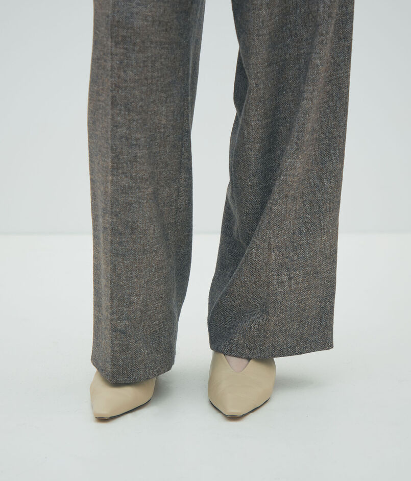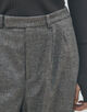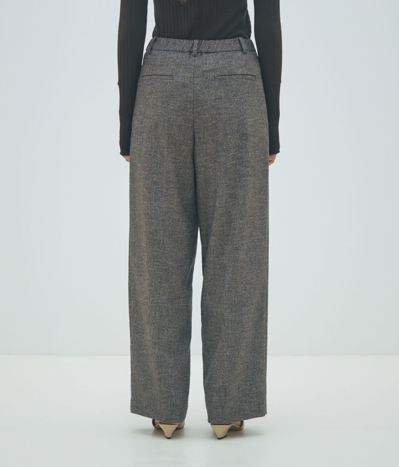 タテ糸にリサイクルウールとポリエステルの杢糸を、ヨコ糸にはシルクネップとポリウレタンを使用した、ウォーム感がありながらも締まりのあるタッチが特徴のツイード素材のパンツ。