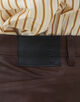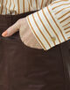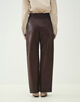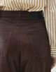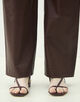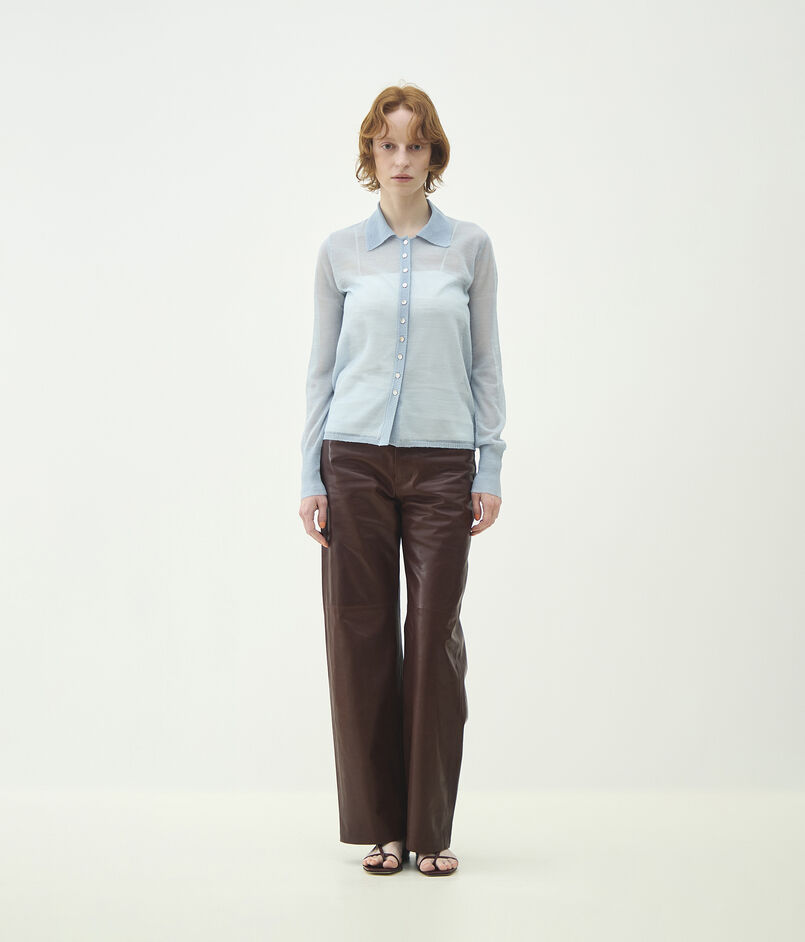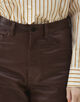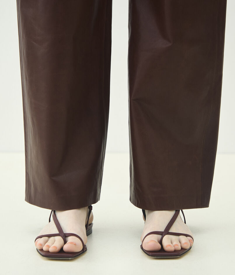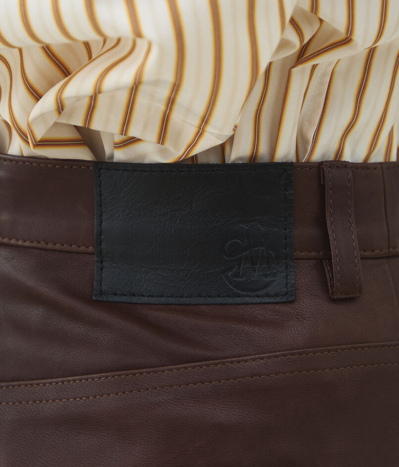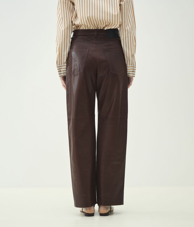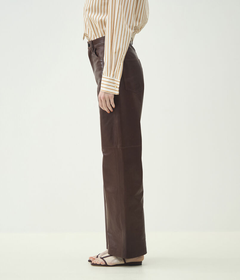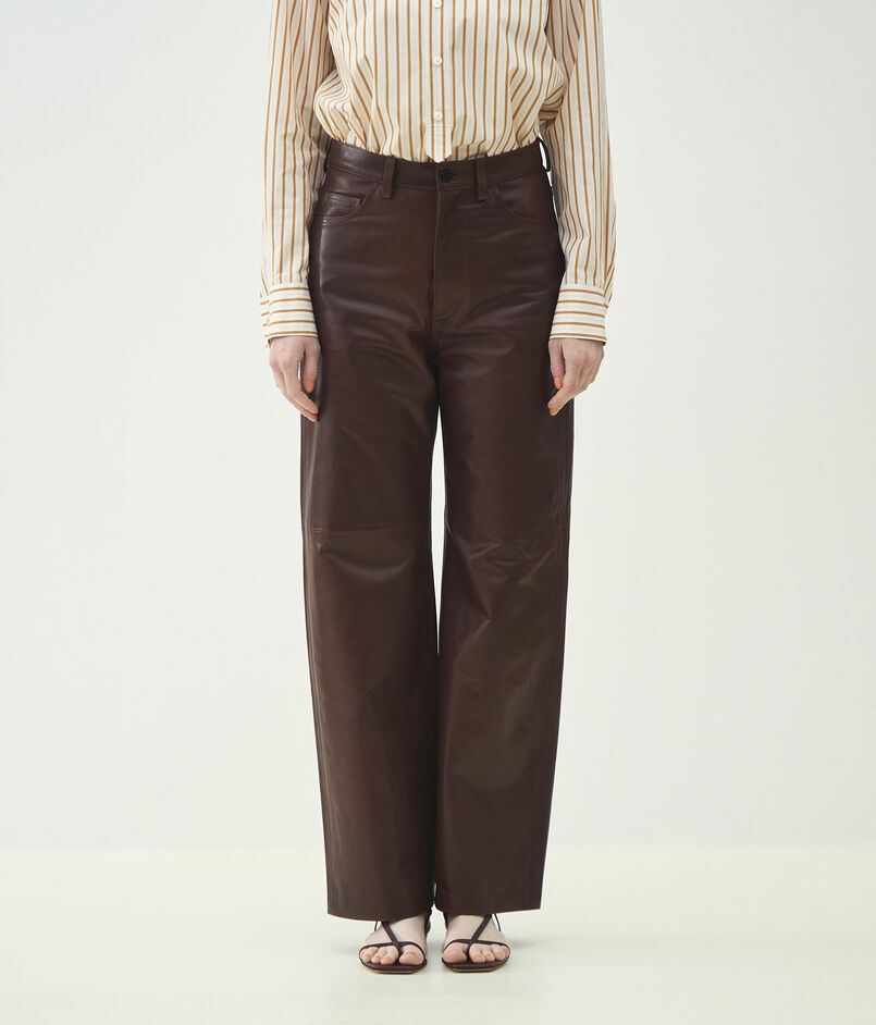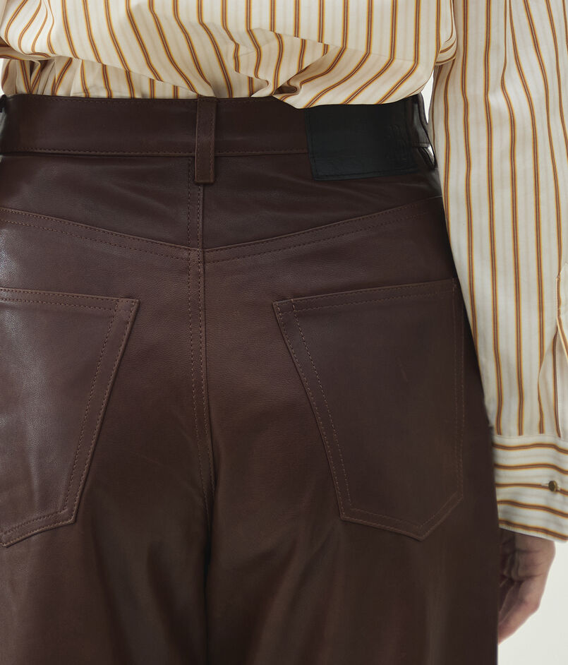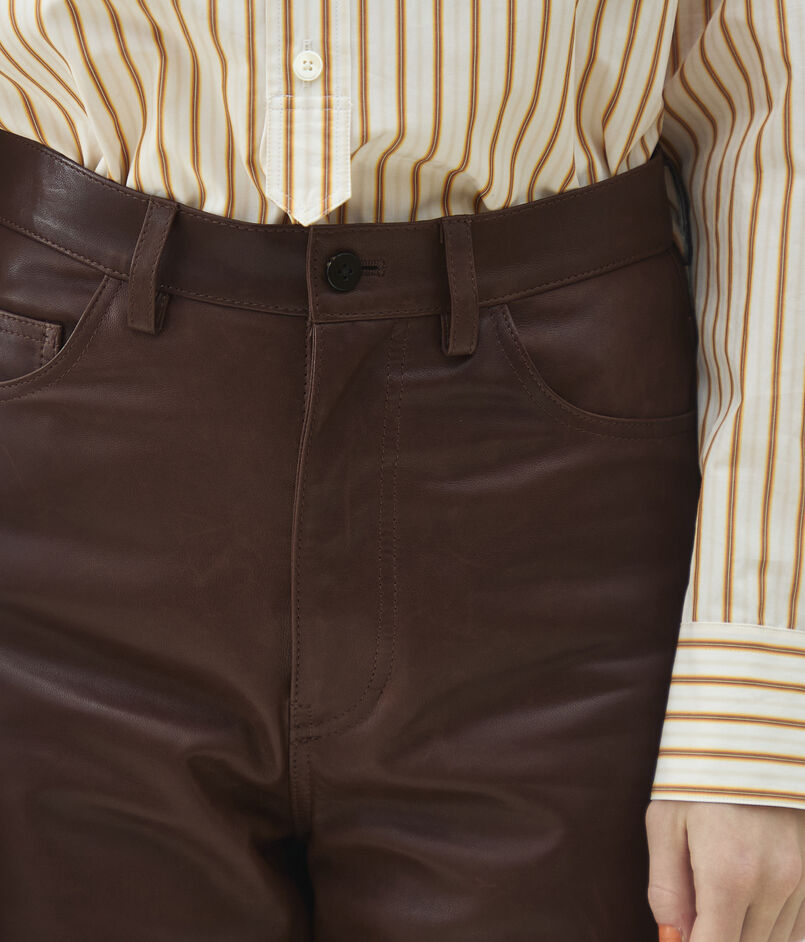 パンツはレザーのハードなイメージを、ボルドーブラウンのニュアンスあるカラーリングと5ポケット型に落とし込むことでラフな印象に仕上げた一着。