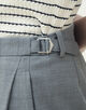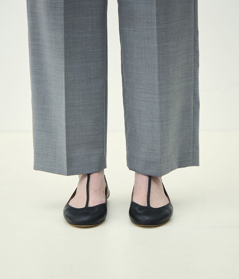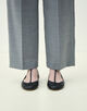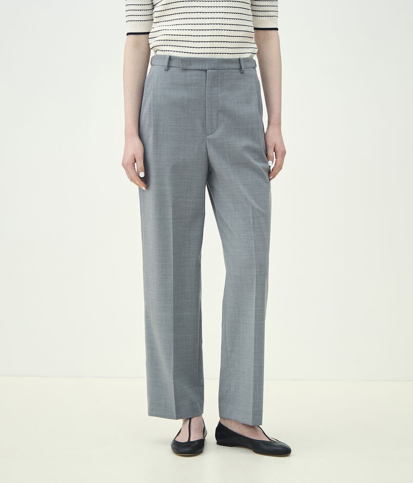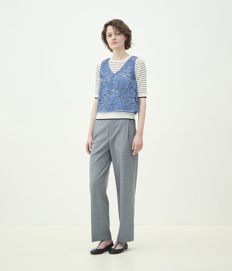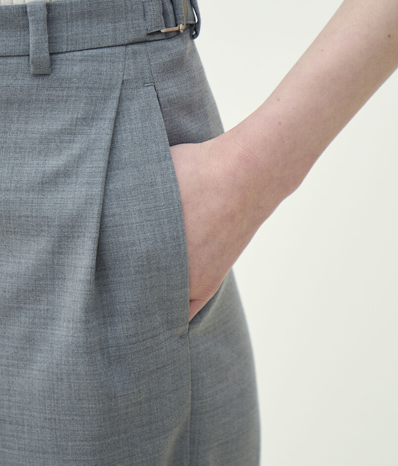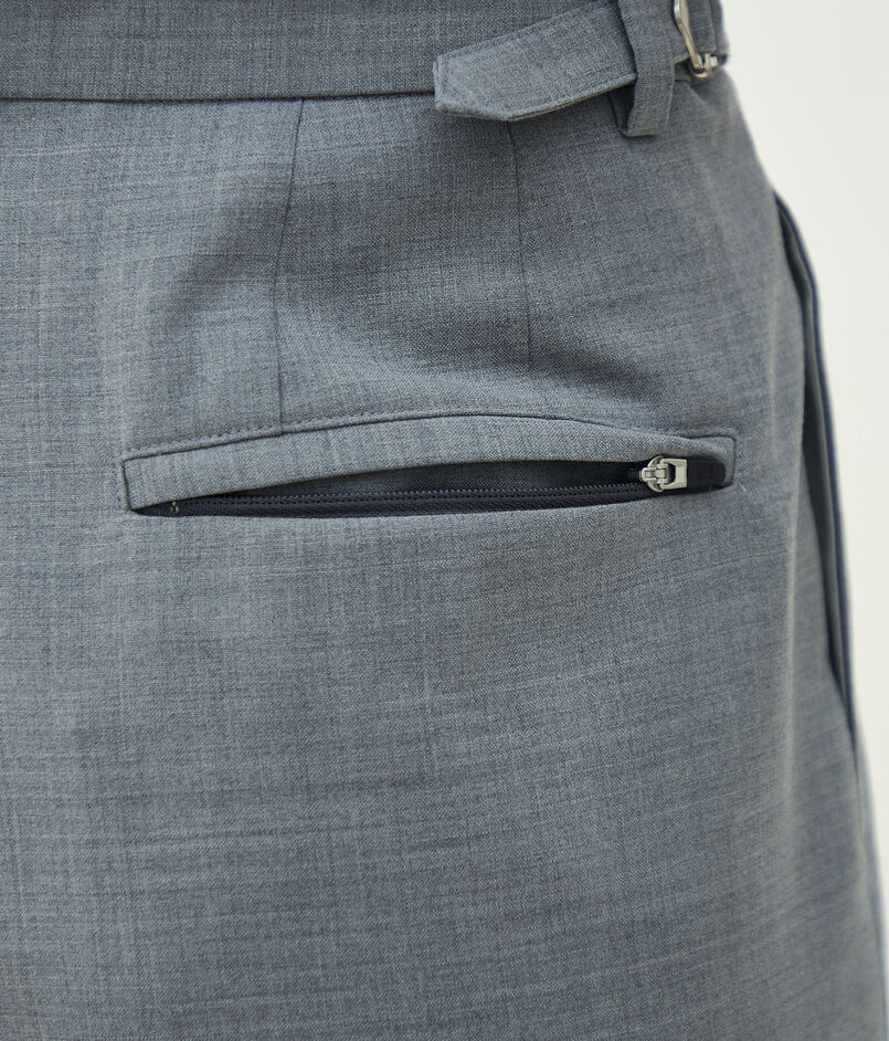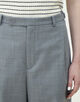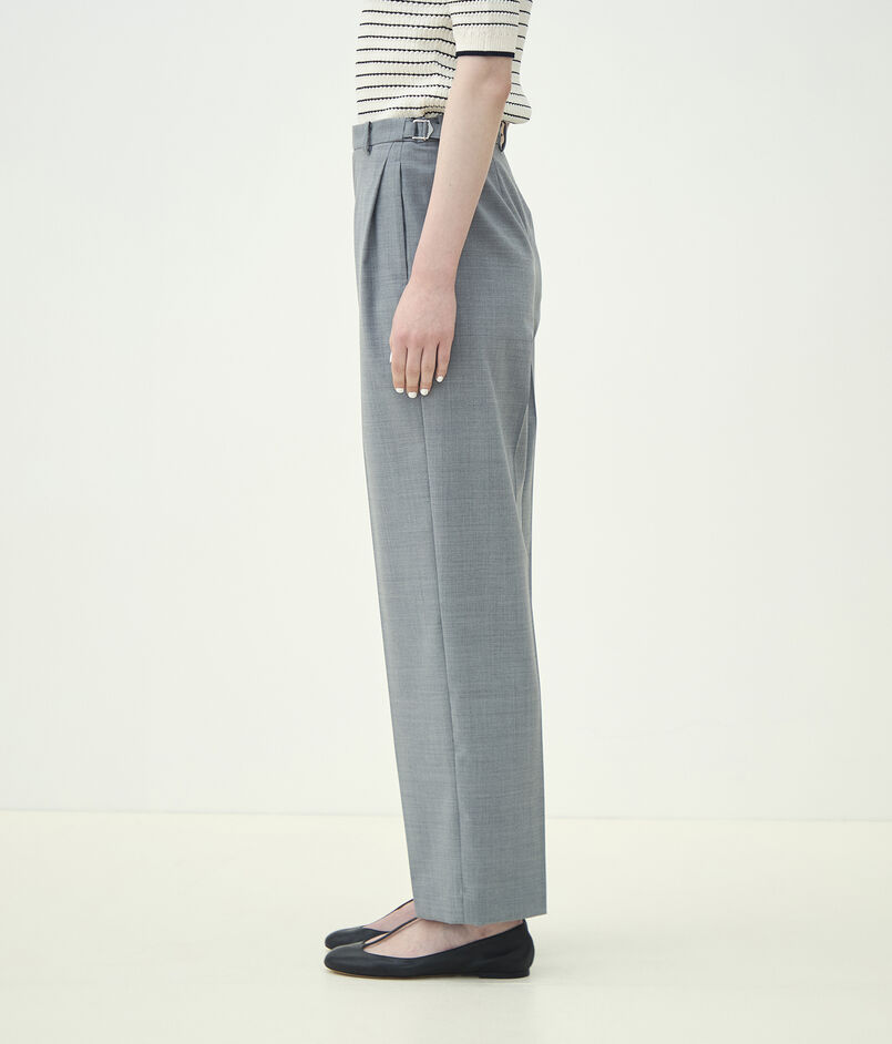 ウールとポリエステルをミックスすることでシワになりにくく、軽量かつイージーケア性を持たせた梳毛素材を使用したパンツ。