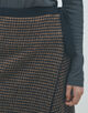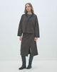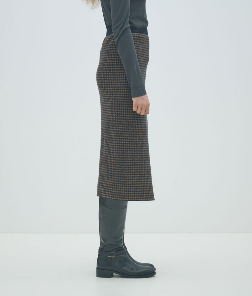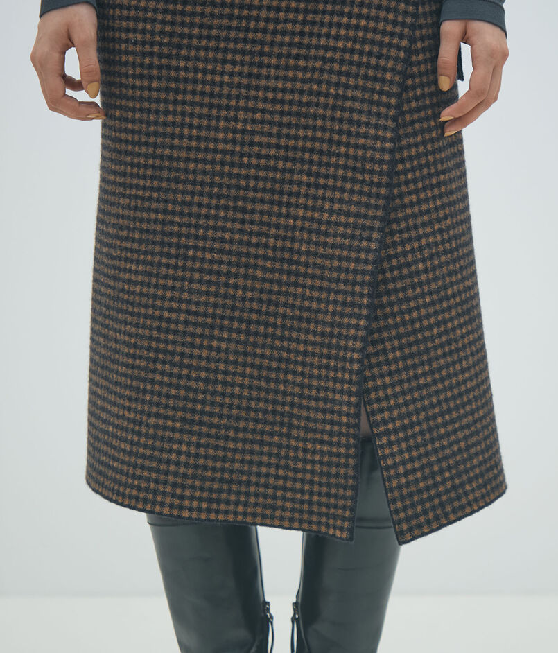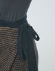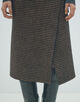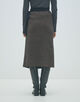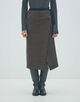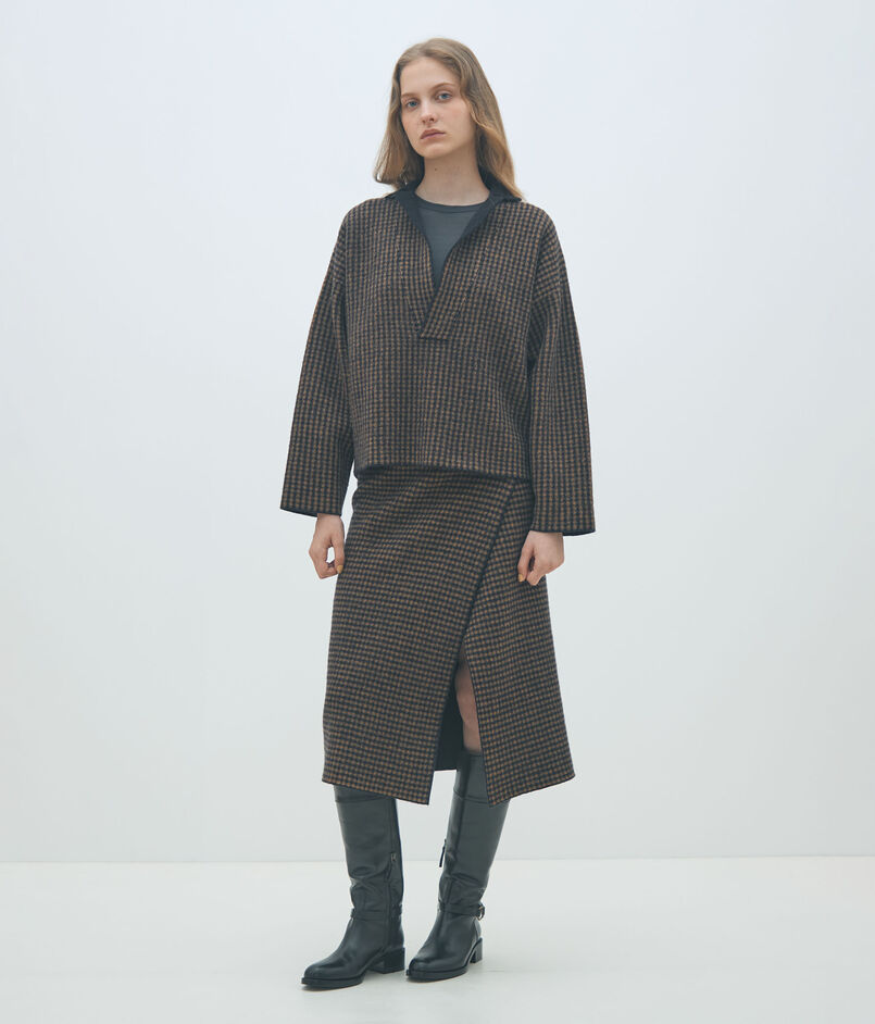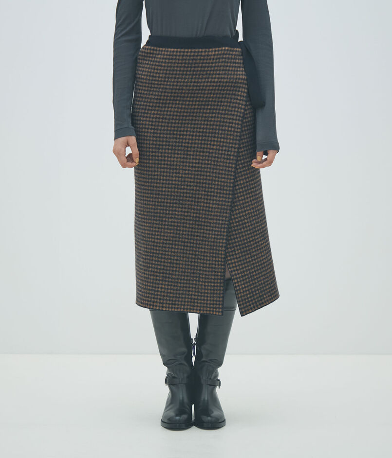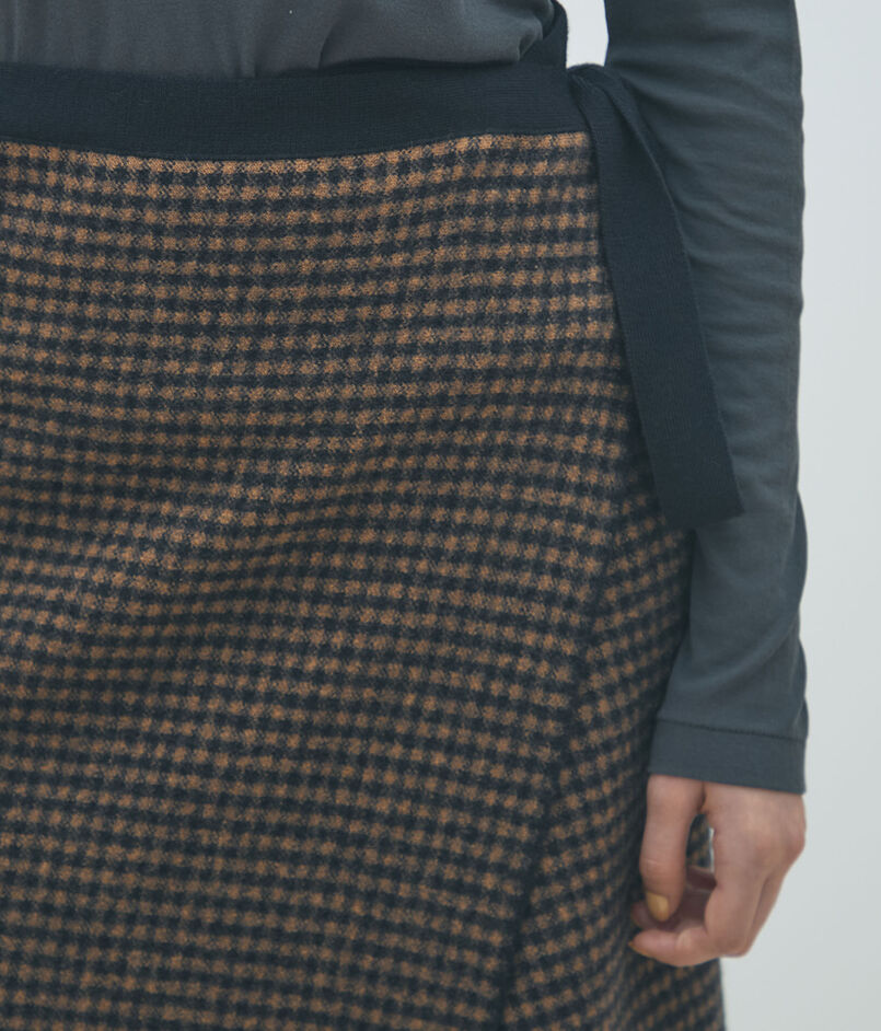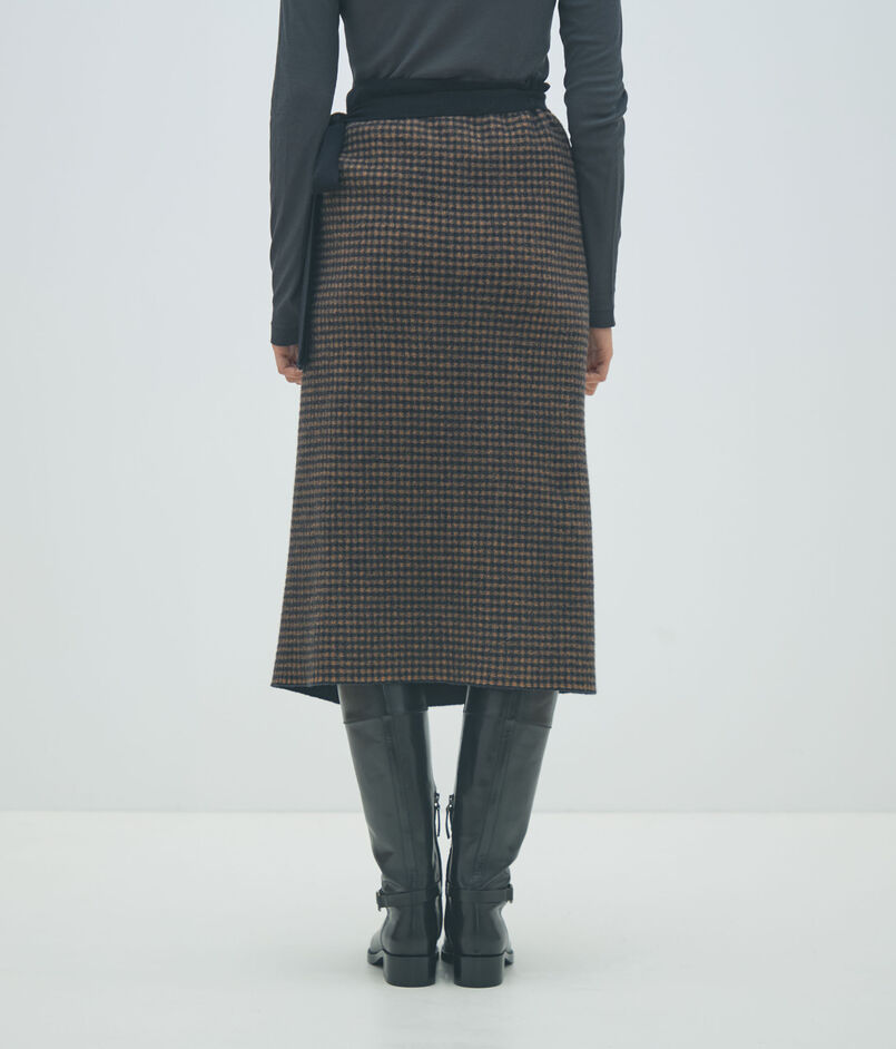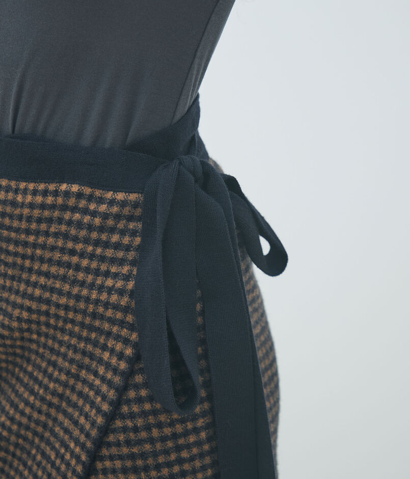 腰紐で結ぶタイプのラップスカートは、すっきりとしたシルエットに膝の隠れる着丈でバランスの取りやすい一着。