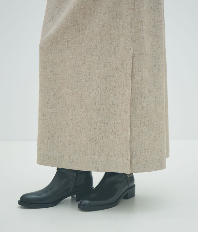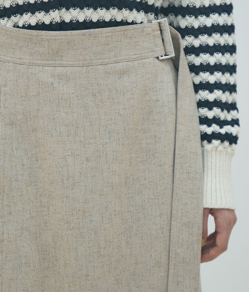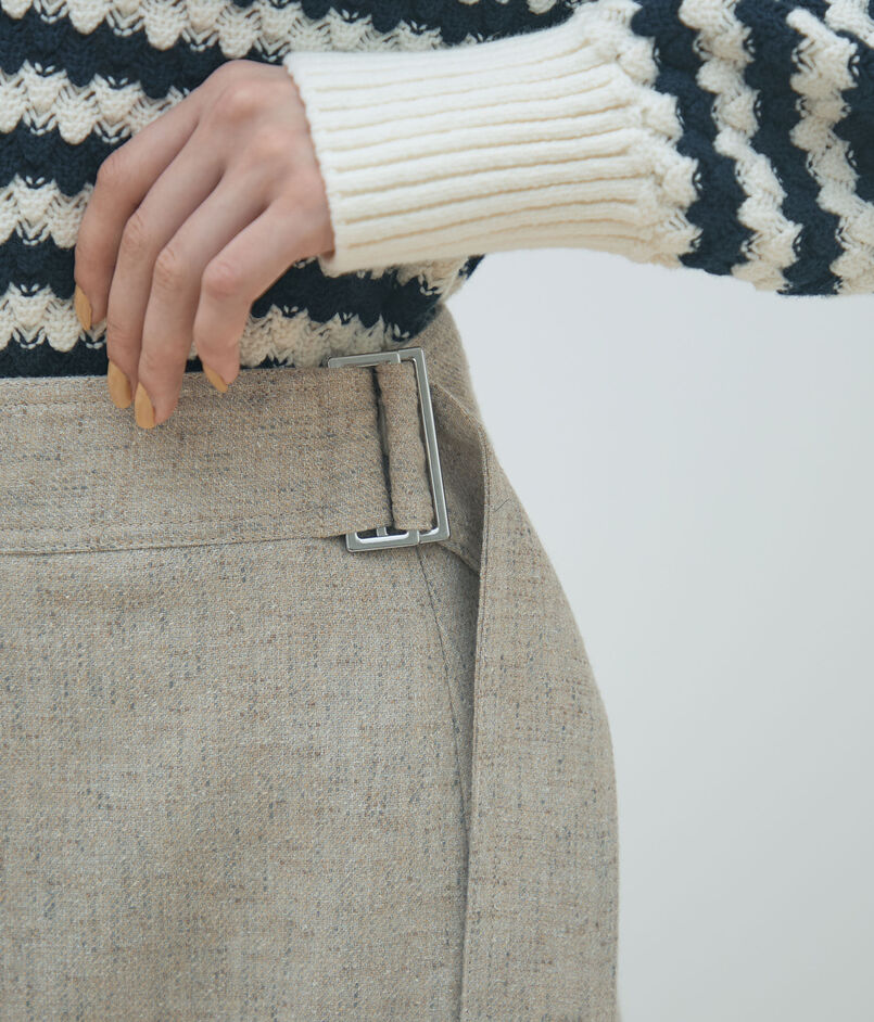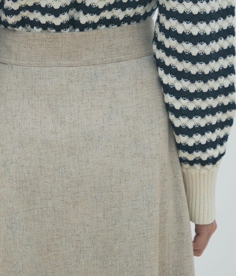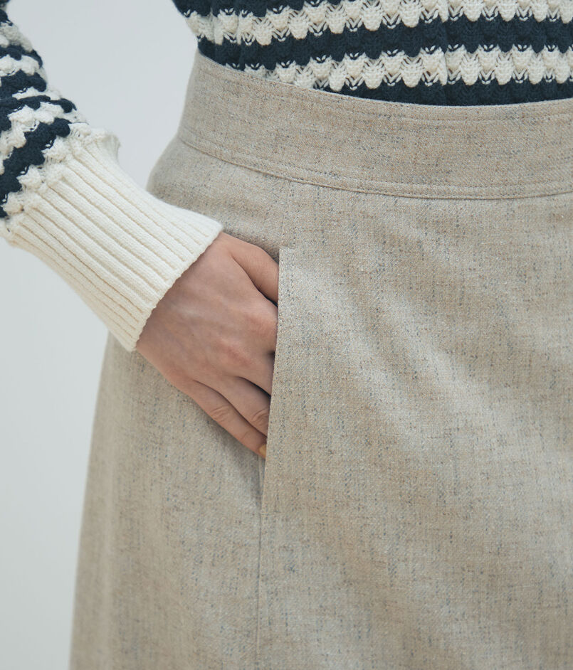 タテ糸にリサイクルウールとポリエステルの杢糸を、ヨコ糸にはシルクネップとポリウレタンを使用した、ウォーム感がありながらも締まりのあるタッチが特徴のツイード素材のスカート。