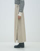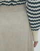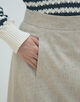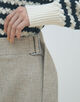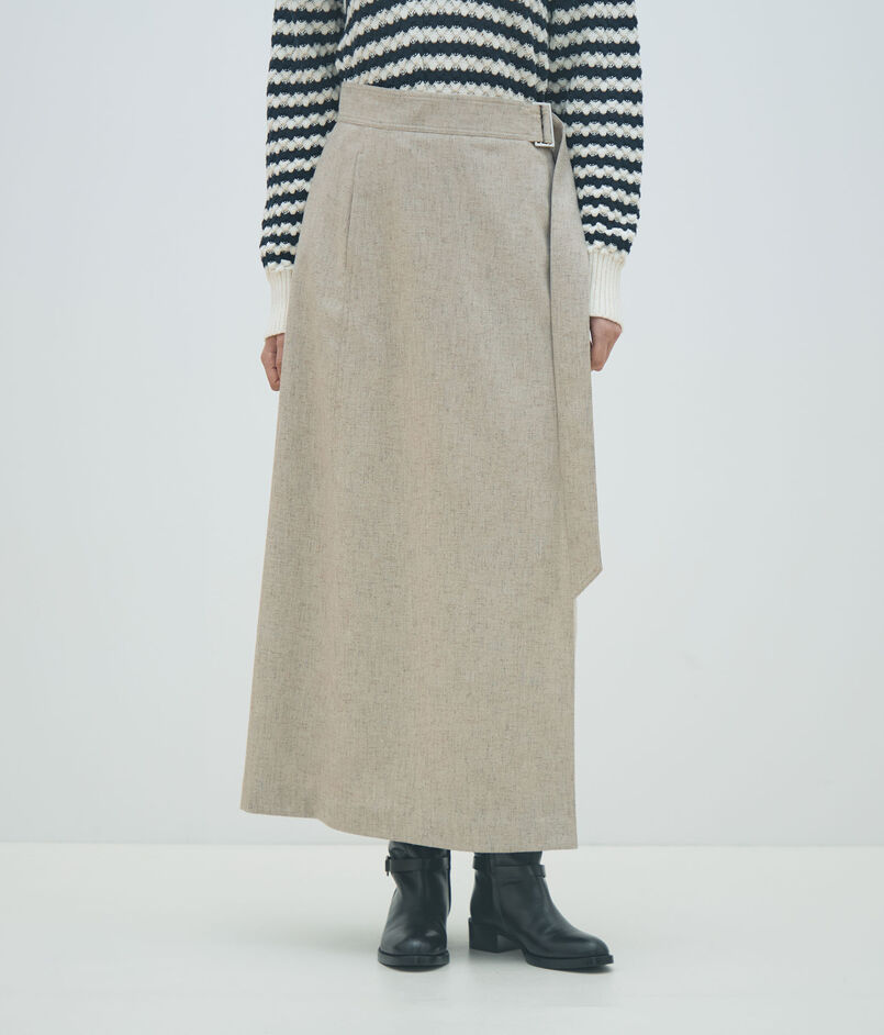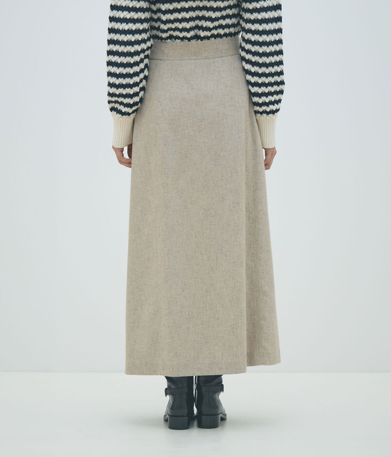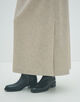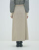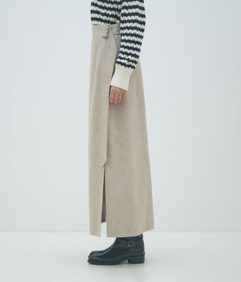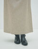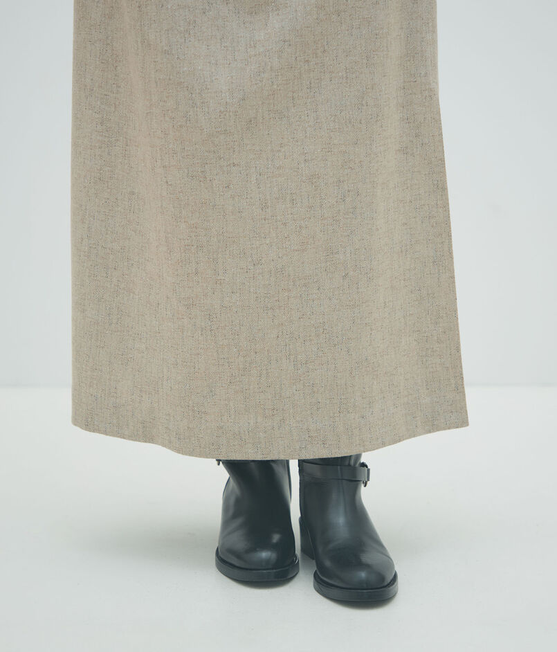 タテ糸にリサイクルウールとポリエステルの杢糸を、ヨコ糸にはシルクネップとポリウレタンを使用した、ウォーム感がありながらも締まりのあるタッチが特徴のツイード素材のスカート。