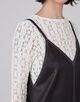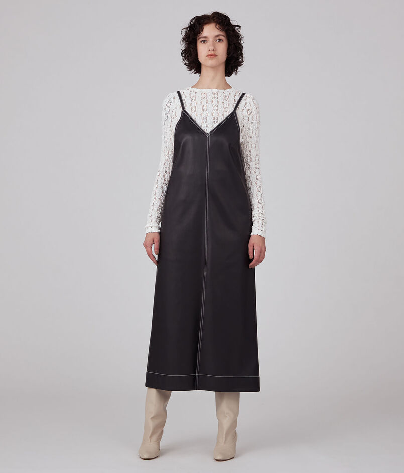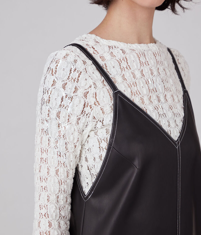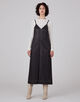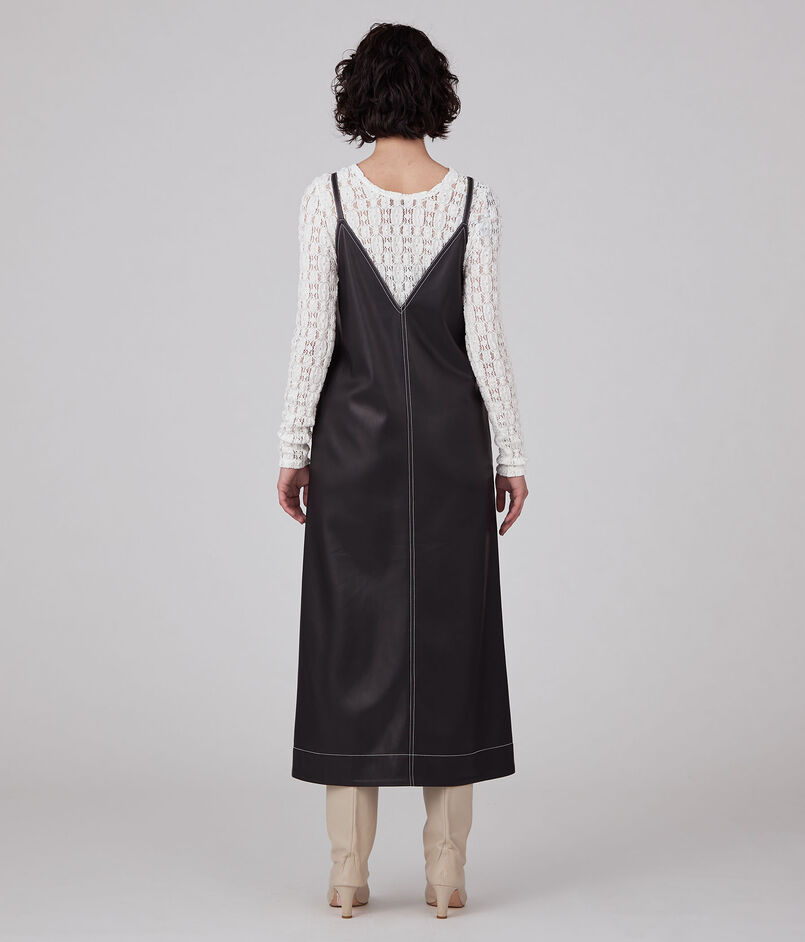 ワンピースは裾に向かってすとんと落ちるストレートシルエットにやや長めの着丈、華奢なストラップのデザインで女性らしいバランスの一枚。