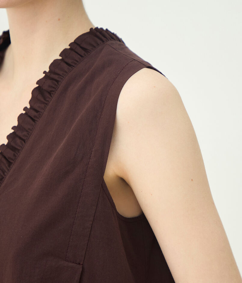 襟ぐりのダブルフリルのディテールで顔まわりに甘さをプラスした一枚。