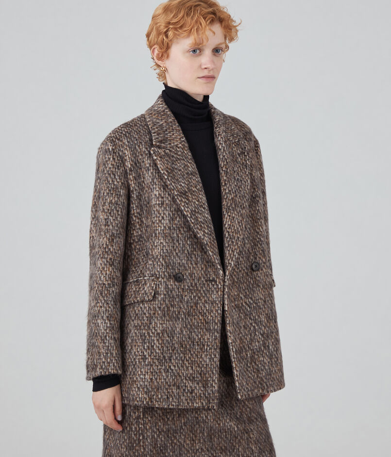 ジャケットはマニッシュなダブルブレストのデザインにゆったりとしたオーバーサイズでさらりと羽織るだけでこなれ感のあるバランスに。