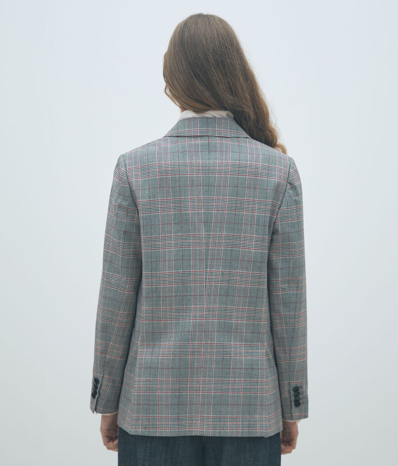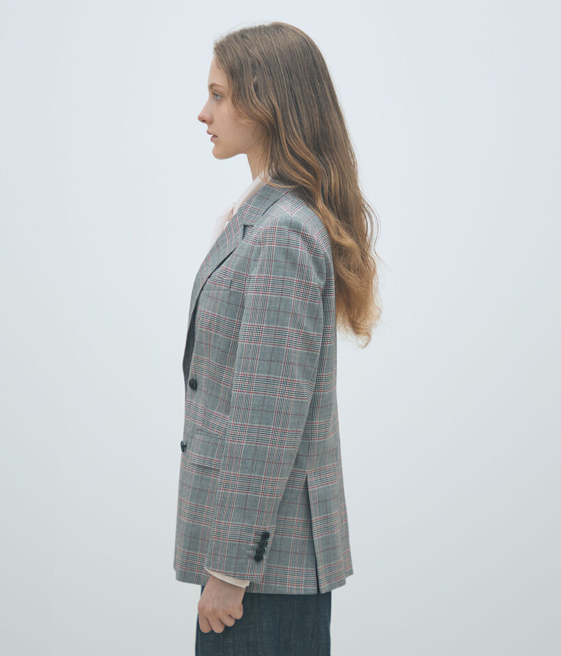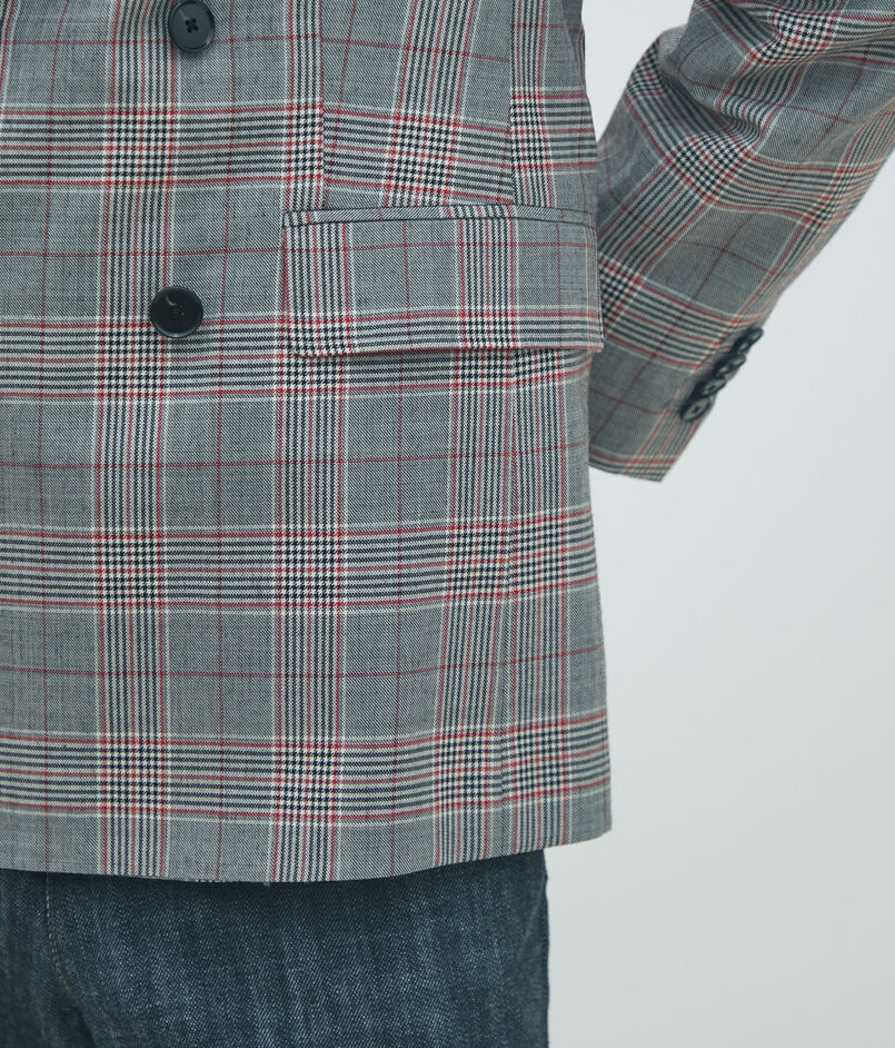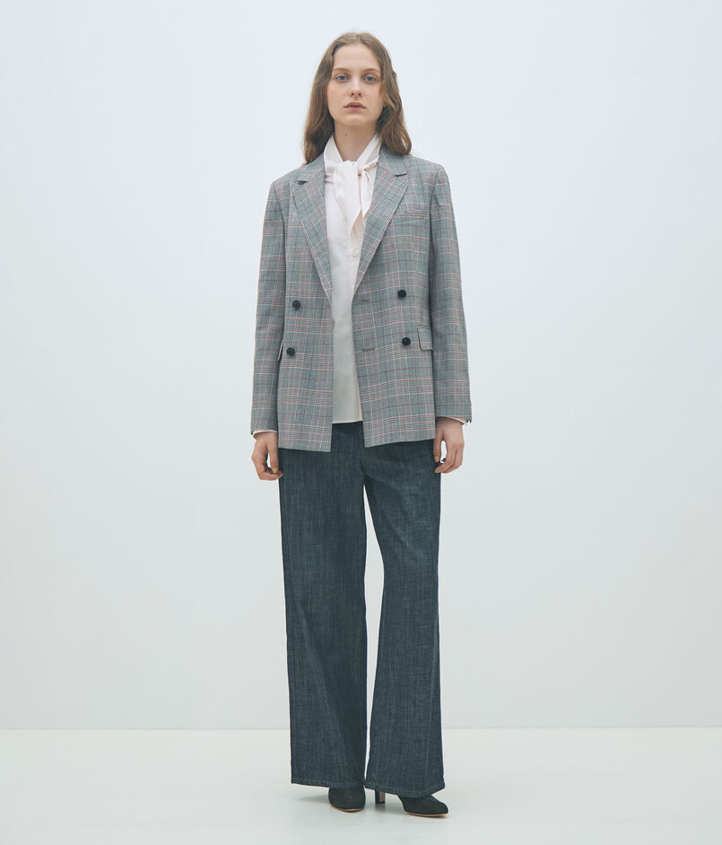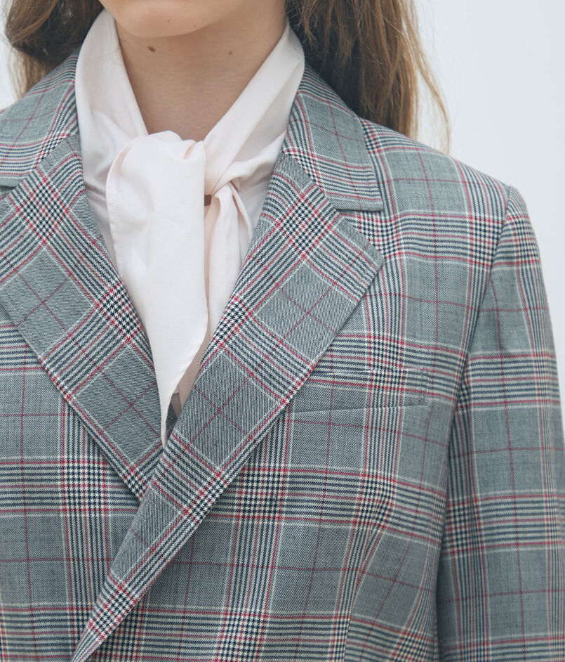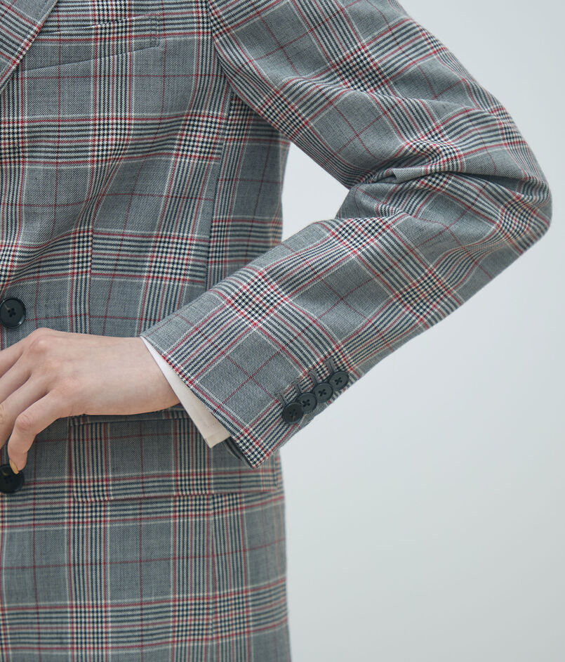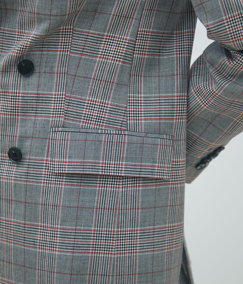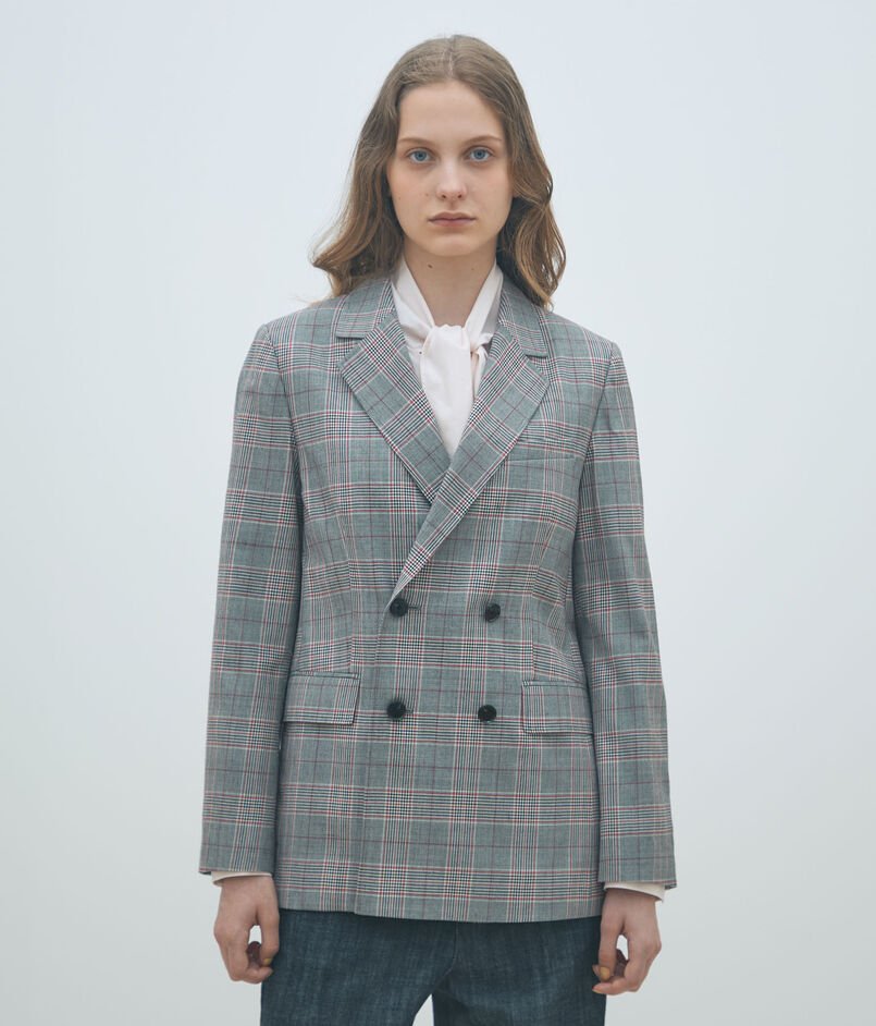 縦長のシルエットが美しいジャケットは、ダブルブレストのデザインやヒップにかかる長めの着丈でマニッシュなバランスでお召しいただけます。
