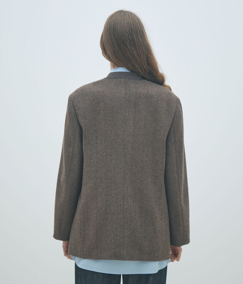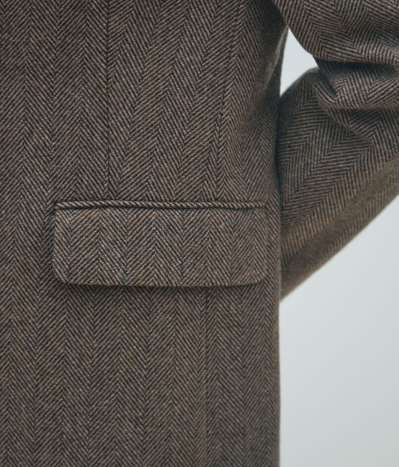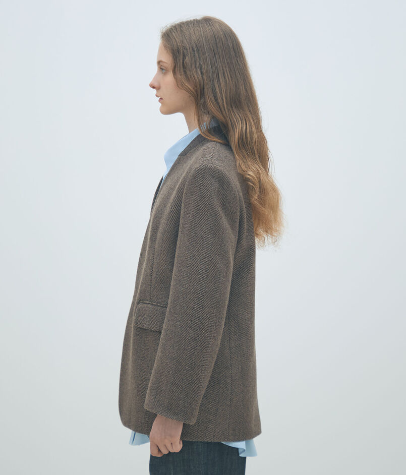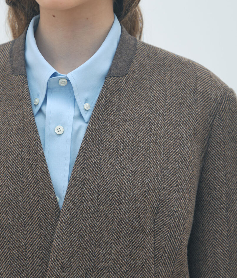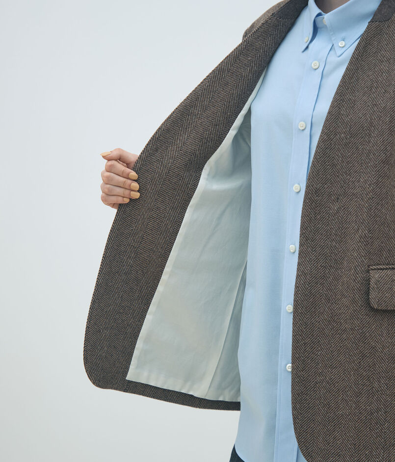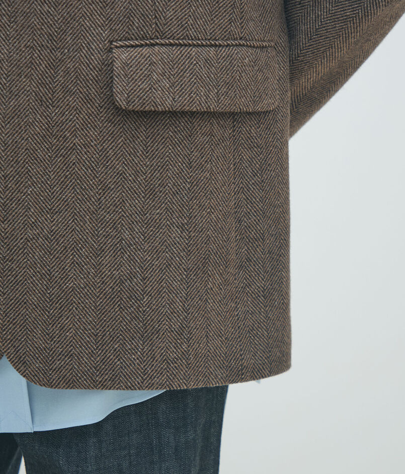 太番手の杢糸でクラシックな印象のヘリンボーン組織に織り上げた、深みのある色味が魅力の素材を使用したジャケット。