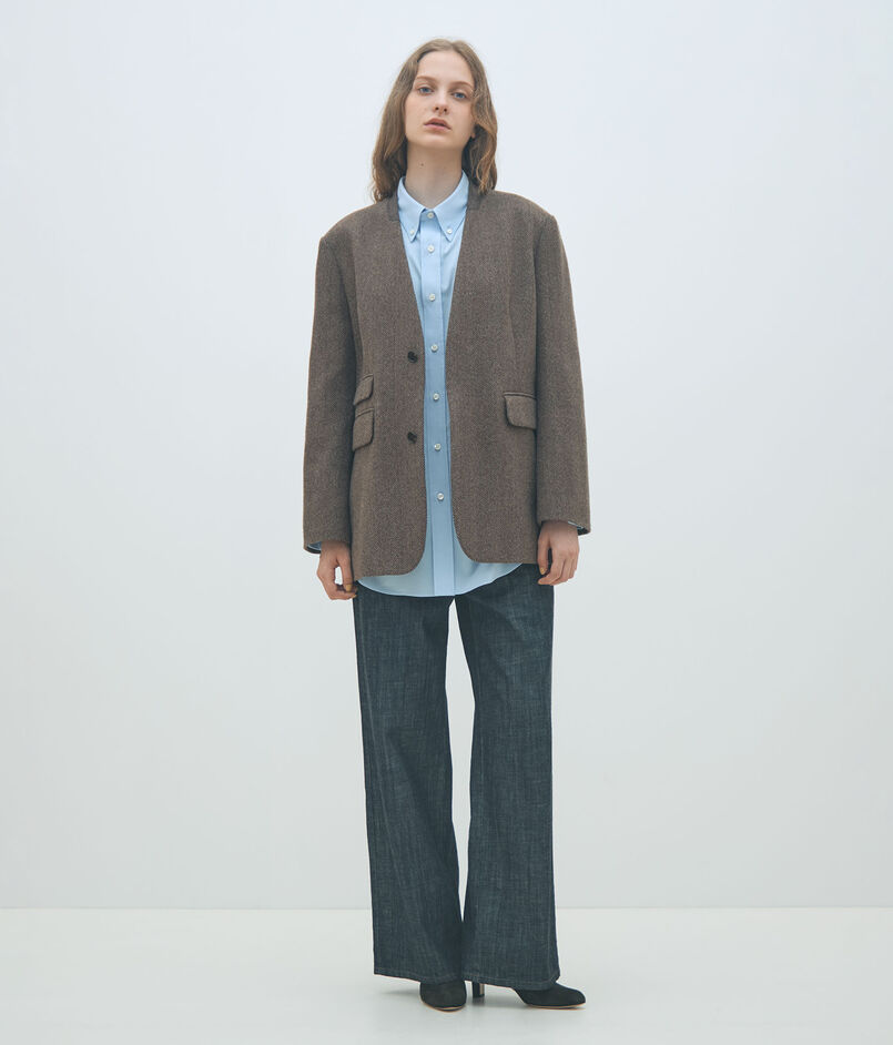 リラックスした落ち具合の中にきっちりとした印象を損なうことなく、さまざまな体型の方にもフィットするよう肩のラインのパターンメイキングにもこだわっています。