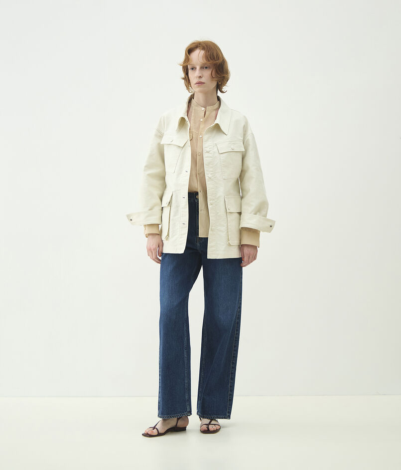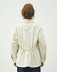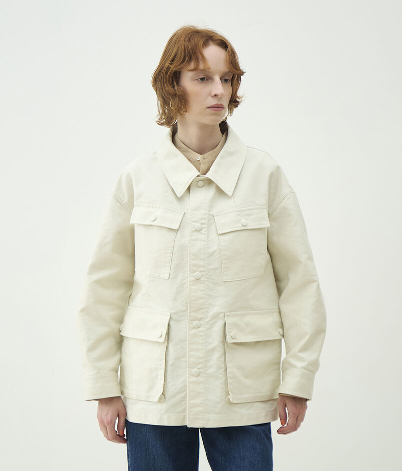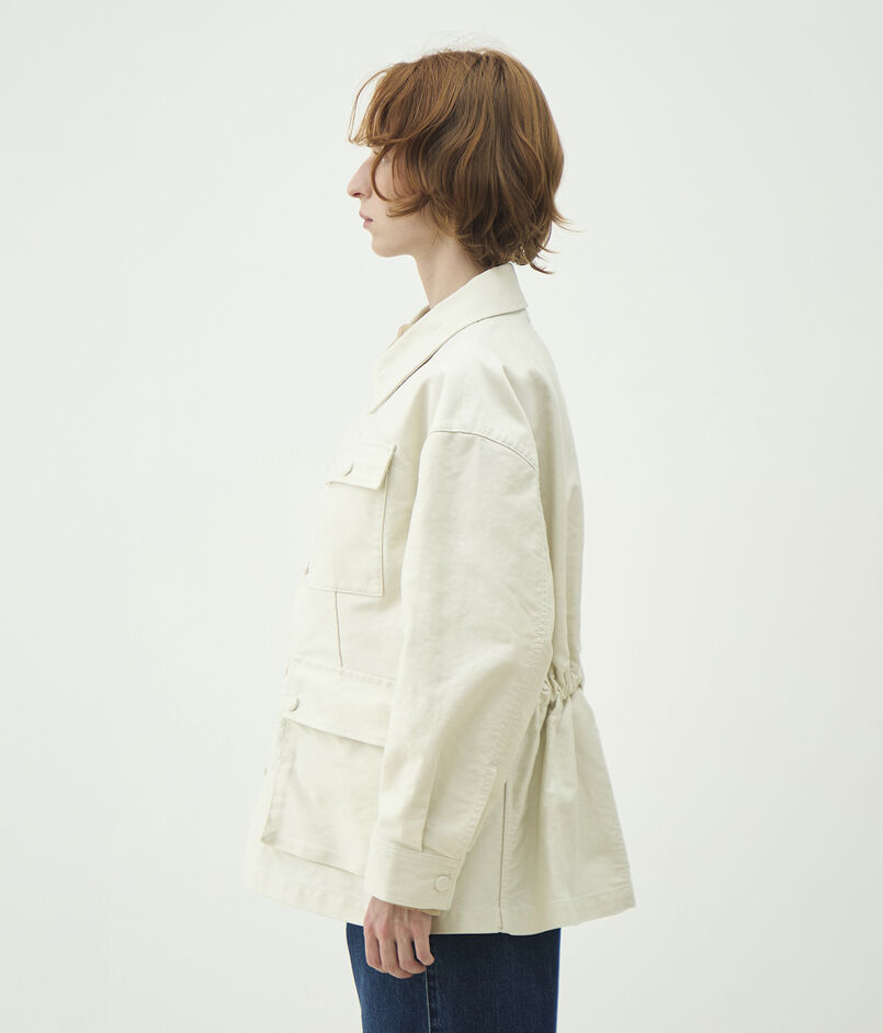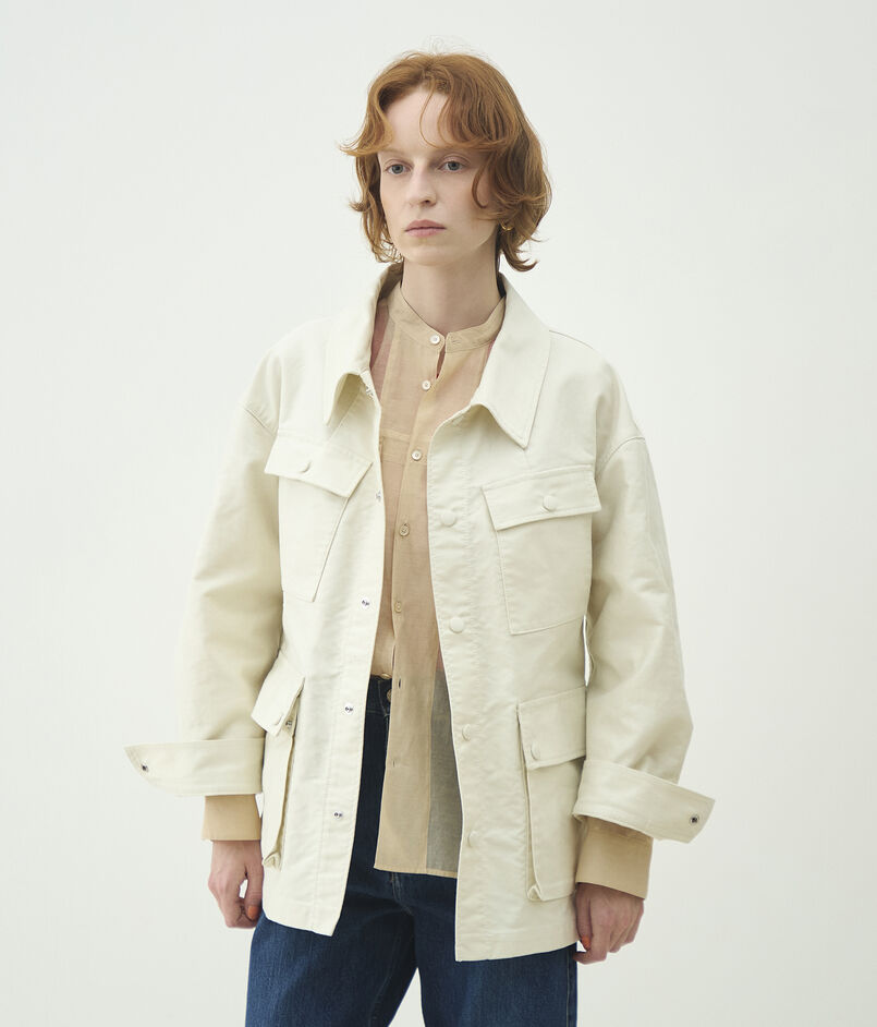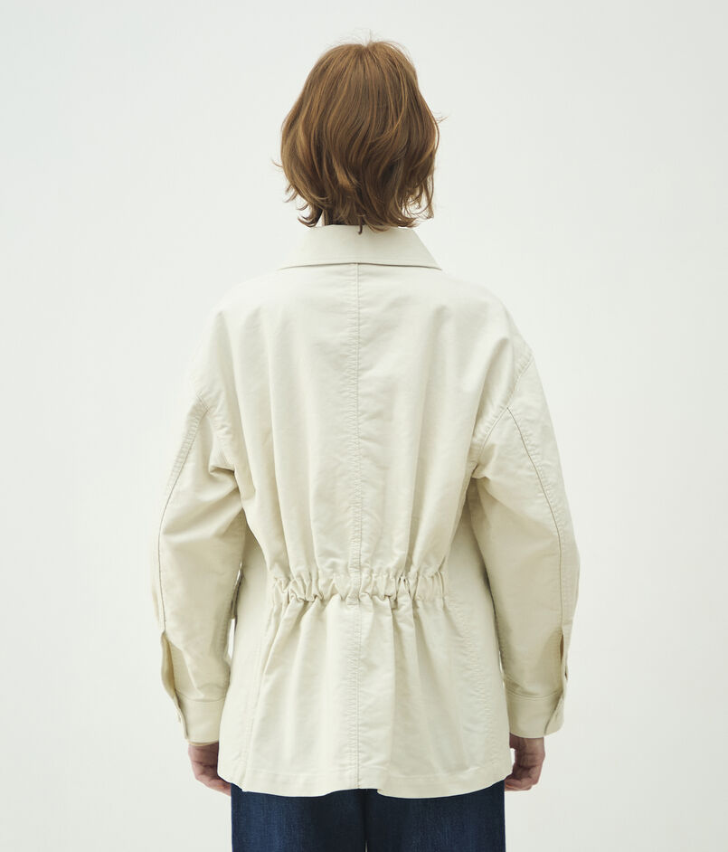 サファリジャケットをベースにアウトラインをオーバーサイズに仕立て、首まわりのあき具合や後ろギャザーのディテールでほど良く女性らしさをプラス。
