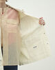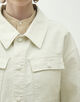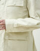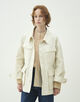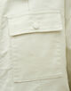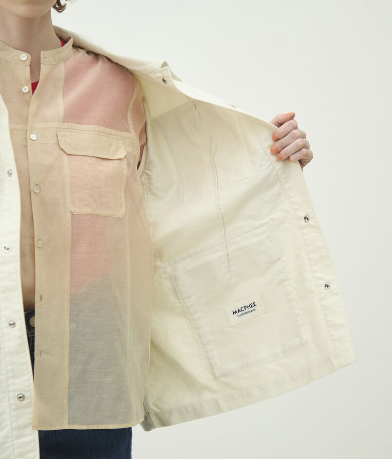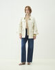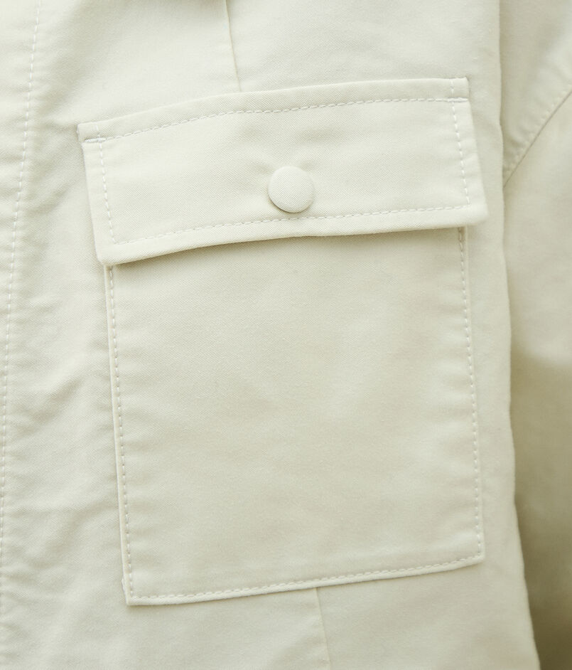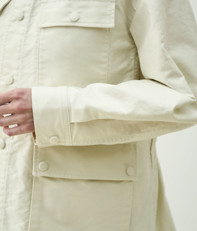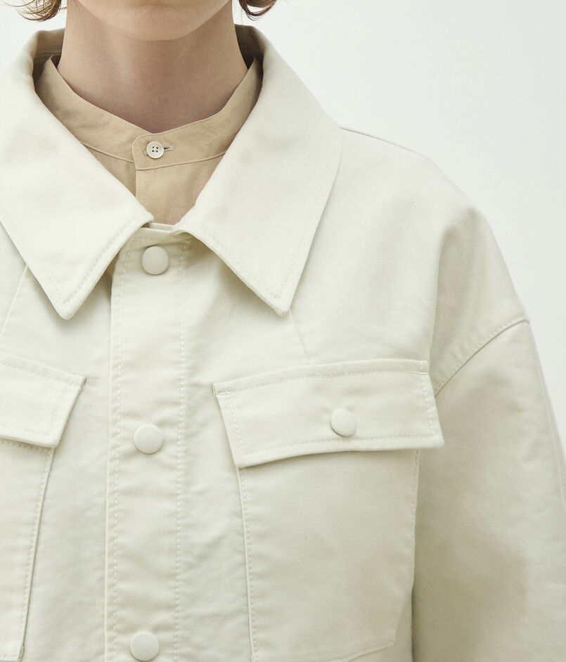 サファリジャケットをベースにアウトラインをオーバーサイズに仕立て、首まわりのあき具合や後ろギャザーのディテールでほど良く女性らしさをプラス。