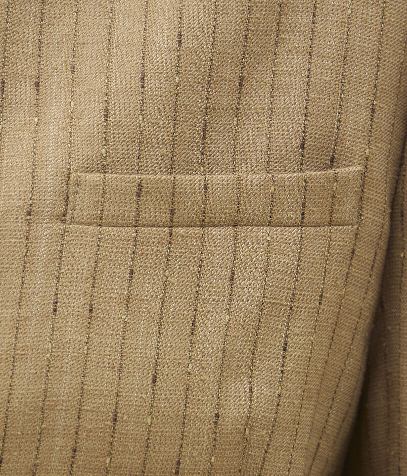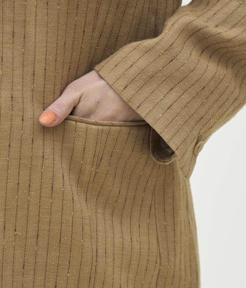 タテ糸にダブルカバーのスラブ糸を使用し、ヨコ糸に使用したリネンのスラブ感とシルクのネップ感が表面にあることで適度なクラフトさを感じていただけるシリーズ。