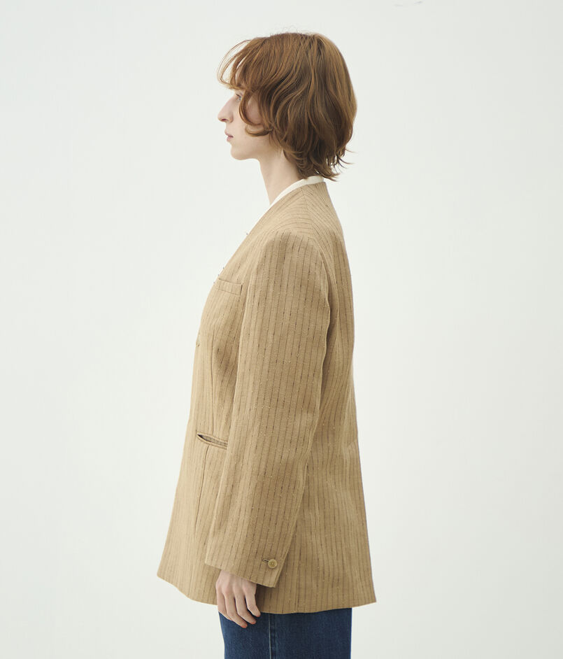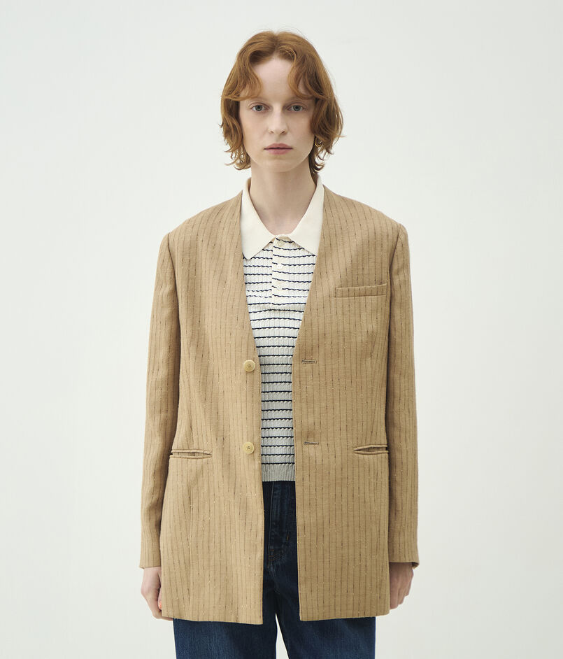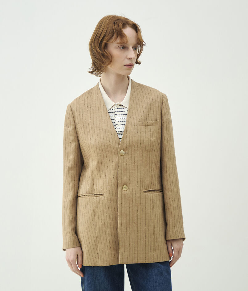 ジャケットとカーディガンの両方の良さを併せ持ったノーカラージャケット。