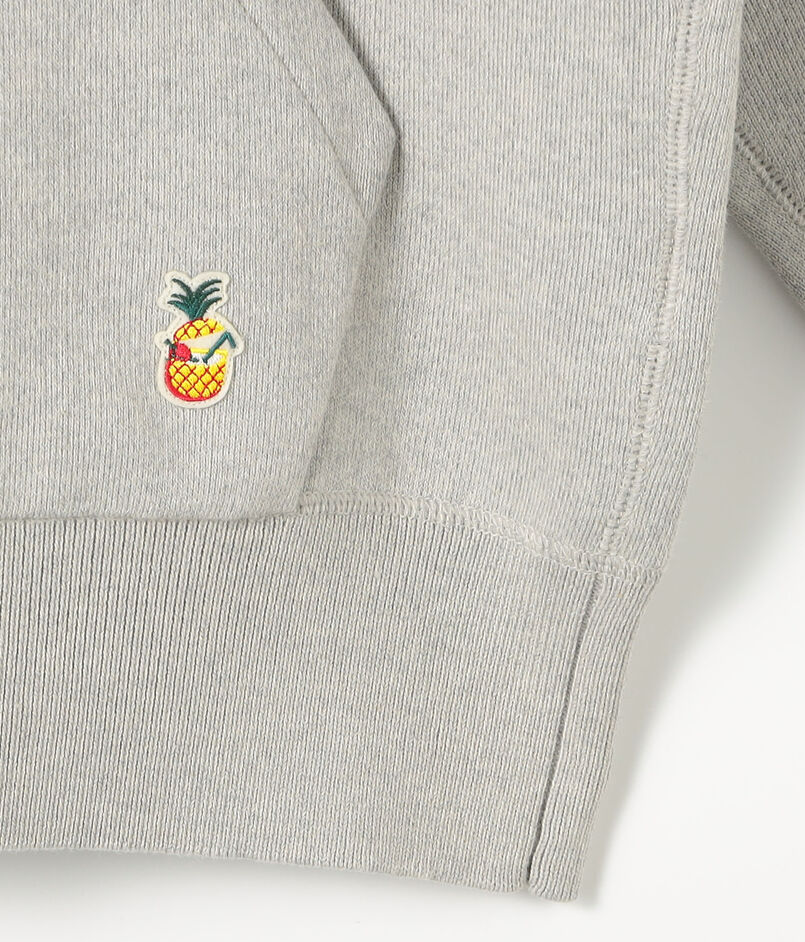 上質な風合いを活かし、通常はジャージー(丸編み)に使用される素材をあえてニット(よこ編み)で製品化しました。丸みのあるゆとりあるシルエットが特徴で、共地のメランジコットンを使用した3本針ロックミシン部分が、全体の統一感のある質感を生み出しています。〈Mai Tai〉のアイコンであるパインのワッペンがフロントポケットに配された、遊び心ある一着です。