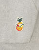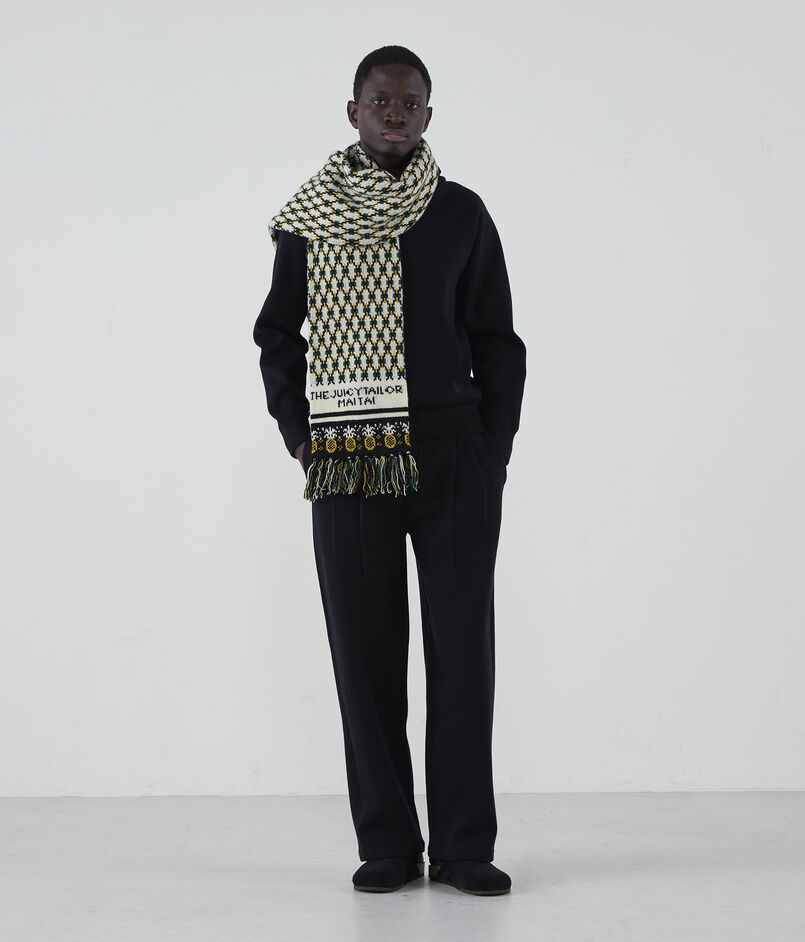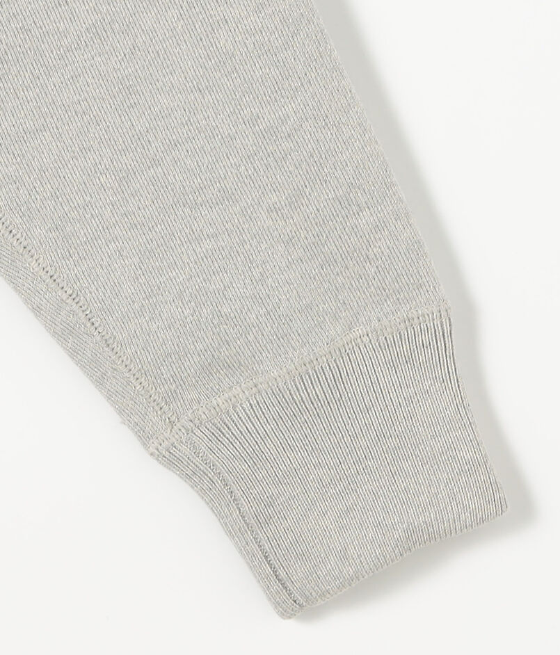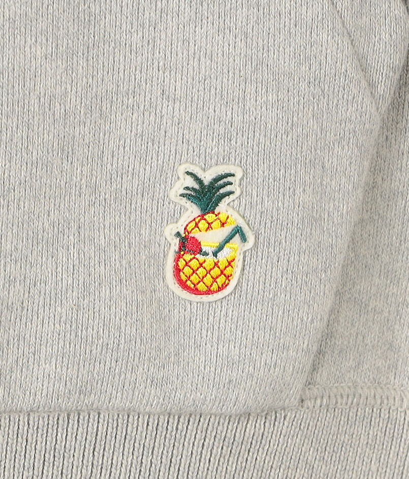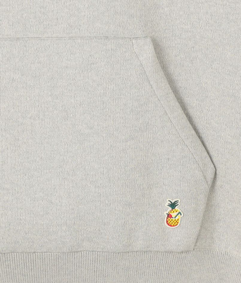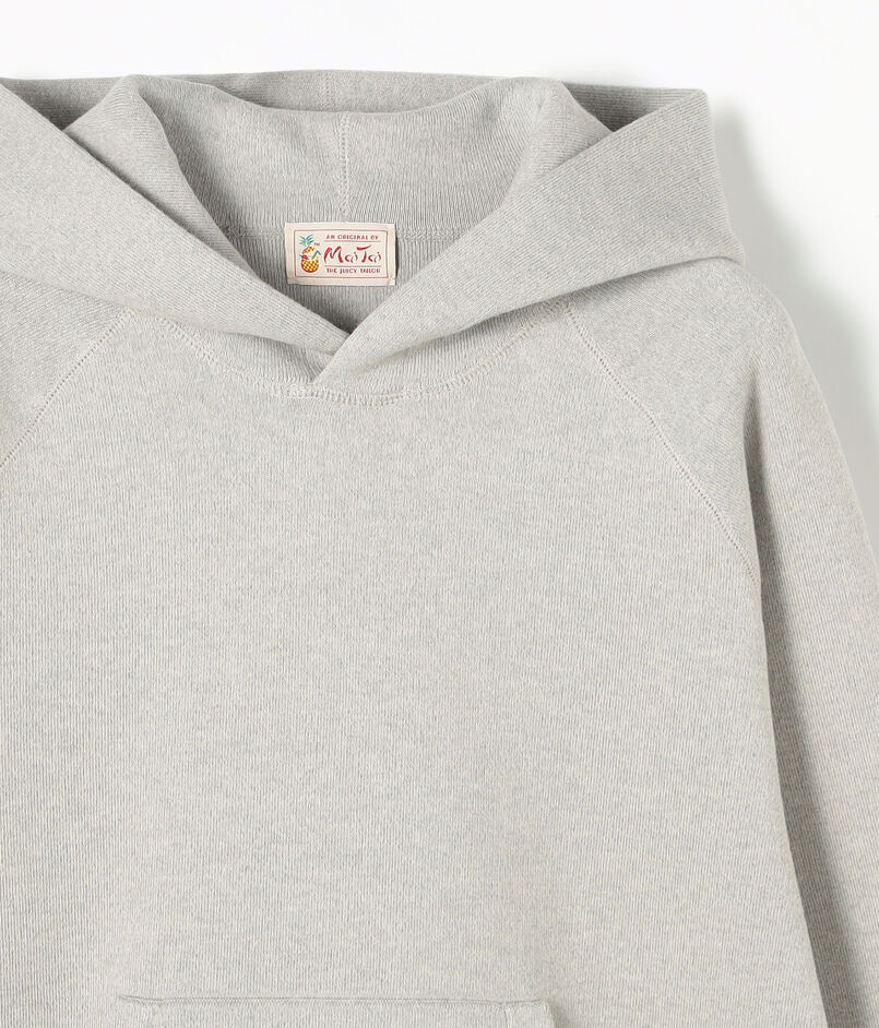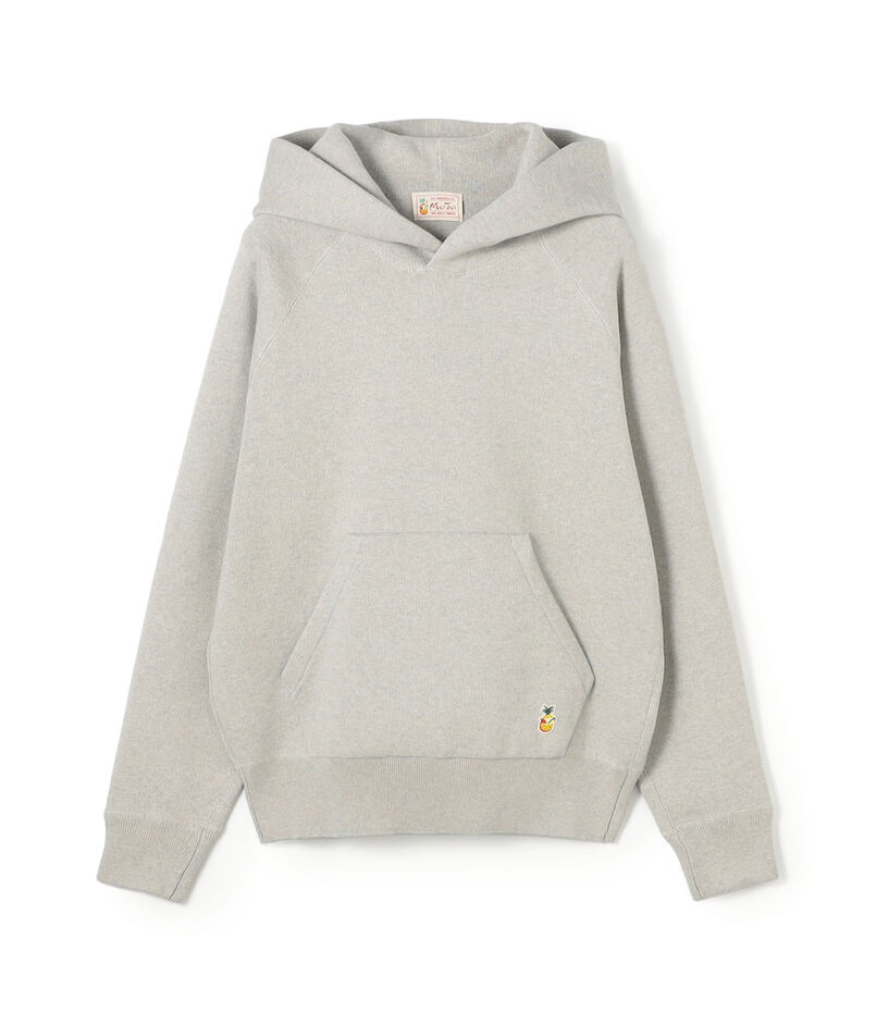 上質な風合いを活かし、通常はジャージー(丸編み)に使用される素材をあえてニット(よこ編み)で製品化しました。丸みのあるゆとりあるシルエットが特徴で、共地のメランジコットンを使用した3本針ロックミシン部分が、全体の統一感のある質感を生み出しています。〈Mai Tai〉のアイコンであるパインのワッペンがフロントポケットに配された、遊び心ある一着です。