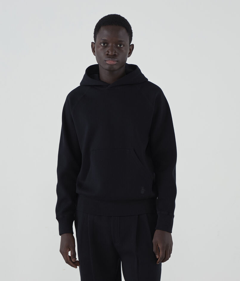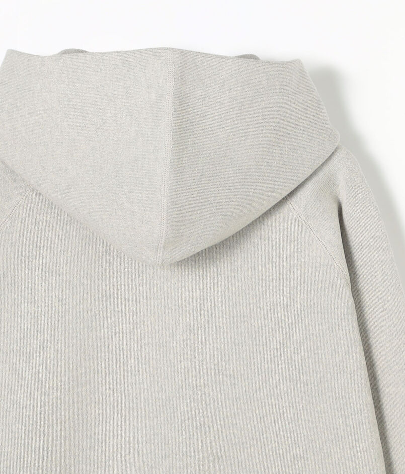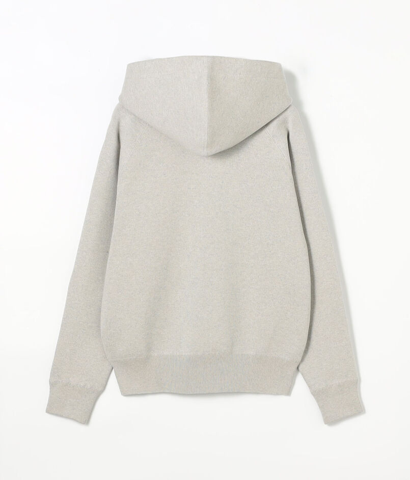 色味と風合いの良さが際立つメランジコットンと、ストレッチ性のあるポリエステルをダブル組織で編み上げたニットフーディー。