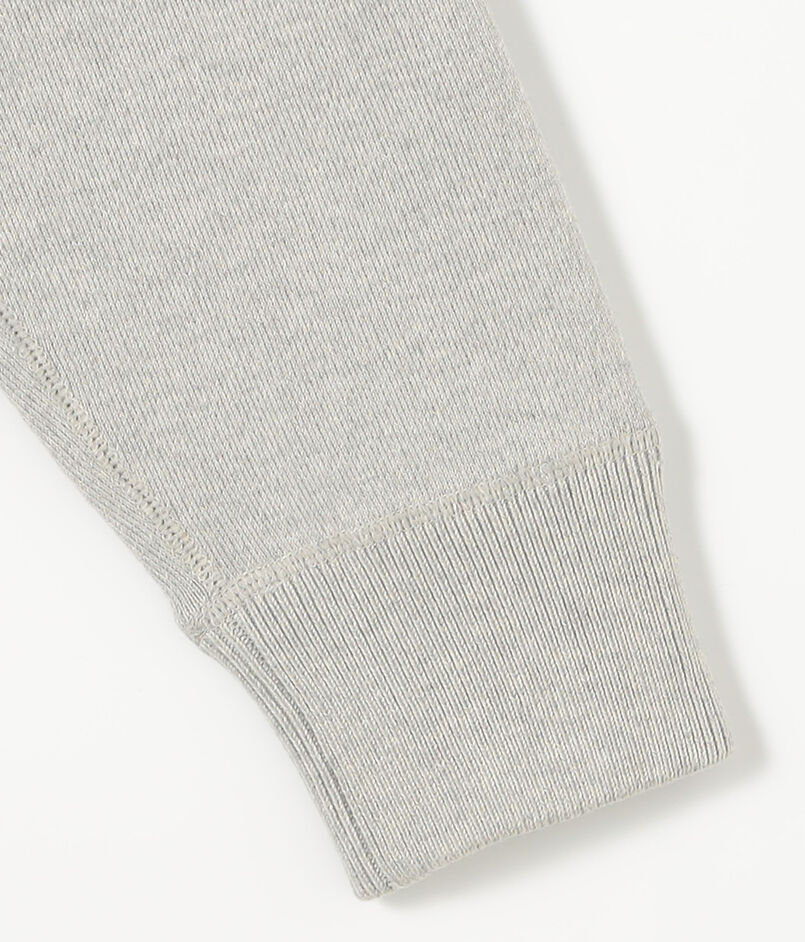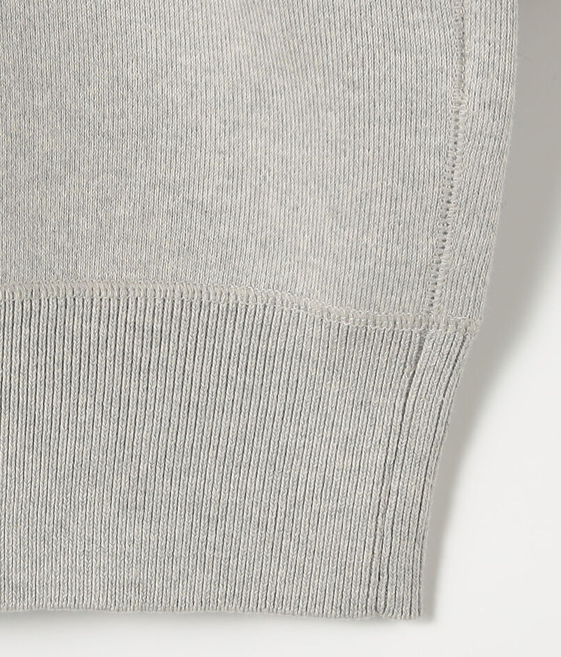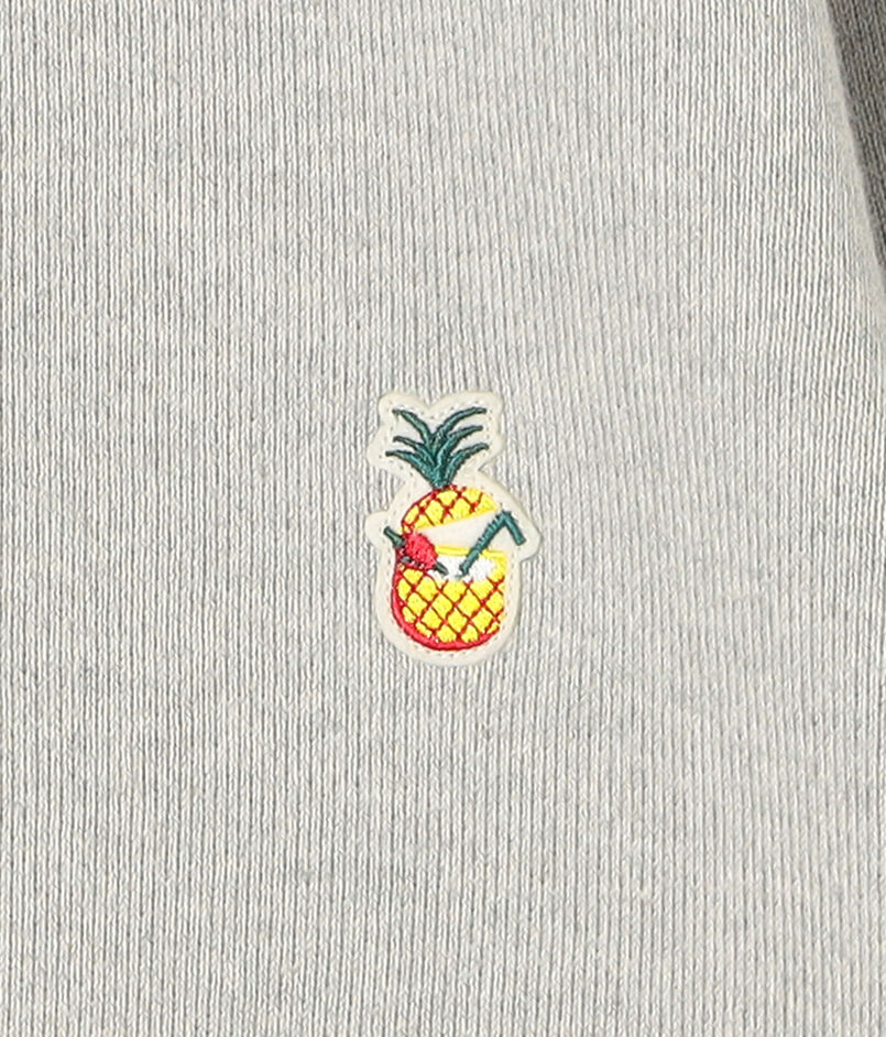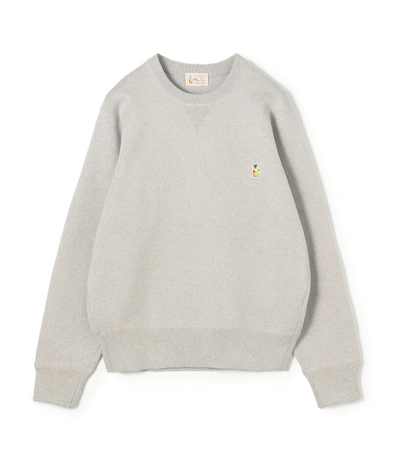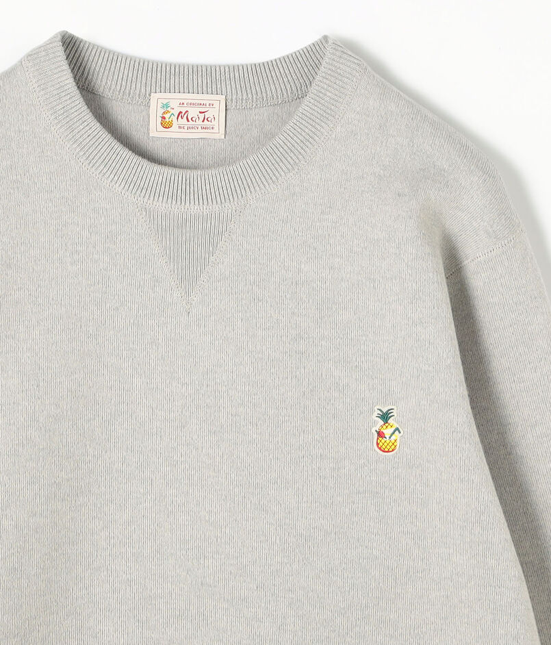 肩線や脇線などの3本針ロックミシン部分にも共糸のメランジコットンを使用し、全体に統一感のある質感で仕上げています。丸みのあるゆとりあるシルエットが特徴で、左胸には〈Mai Tai〉のアイコンであるパインのワッペンが配されています。