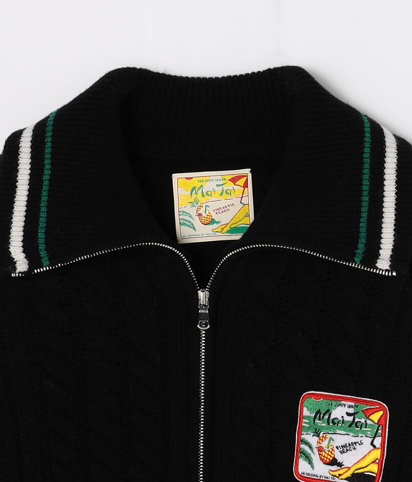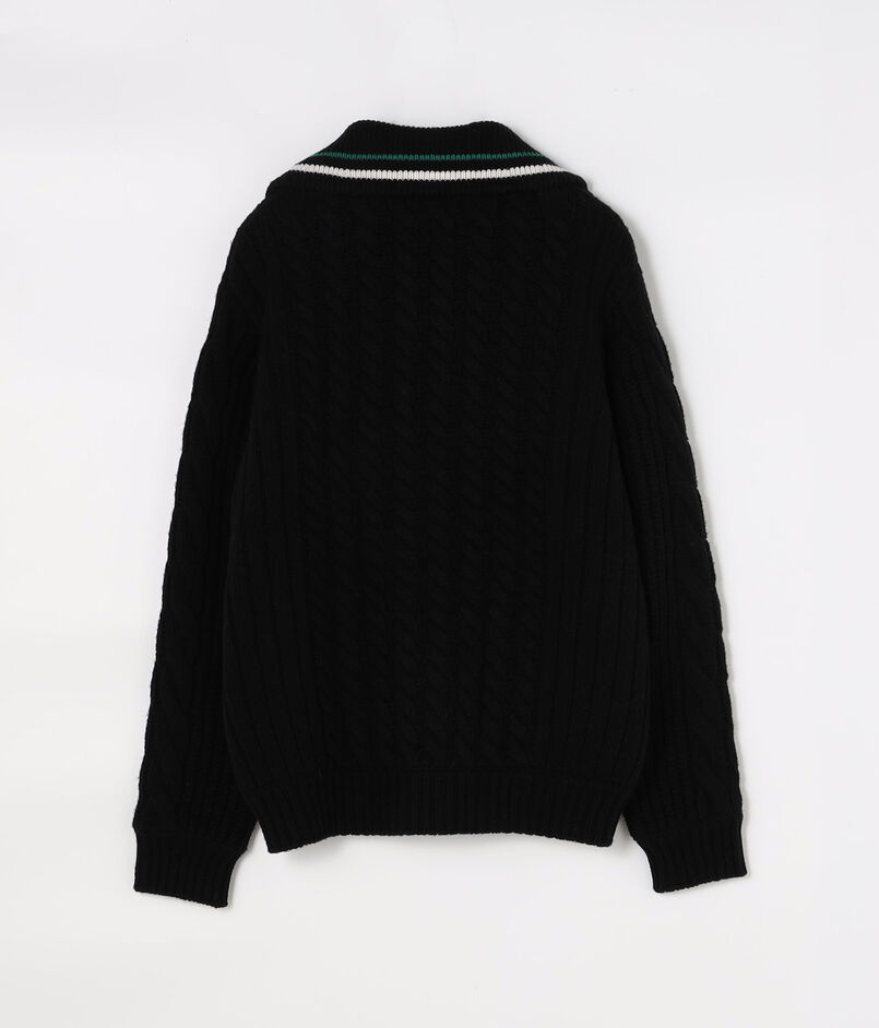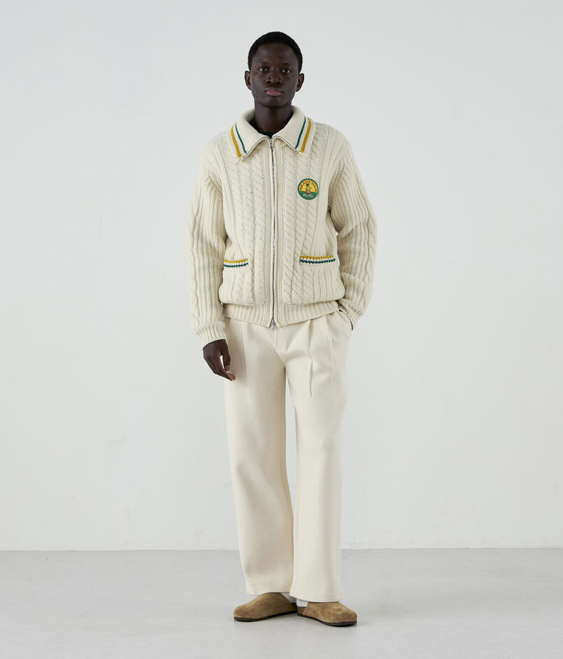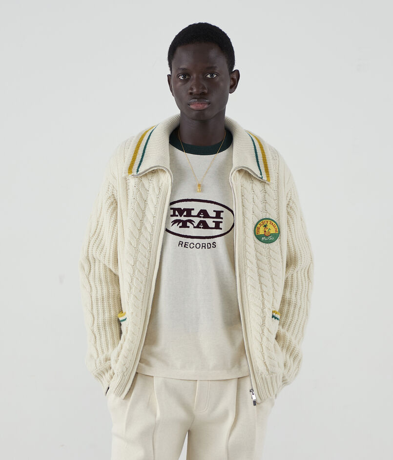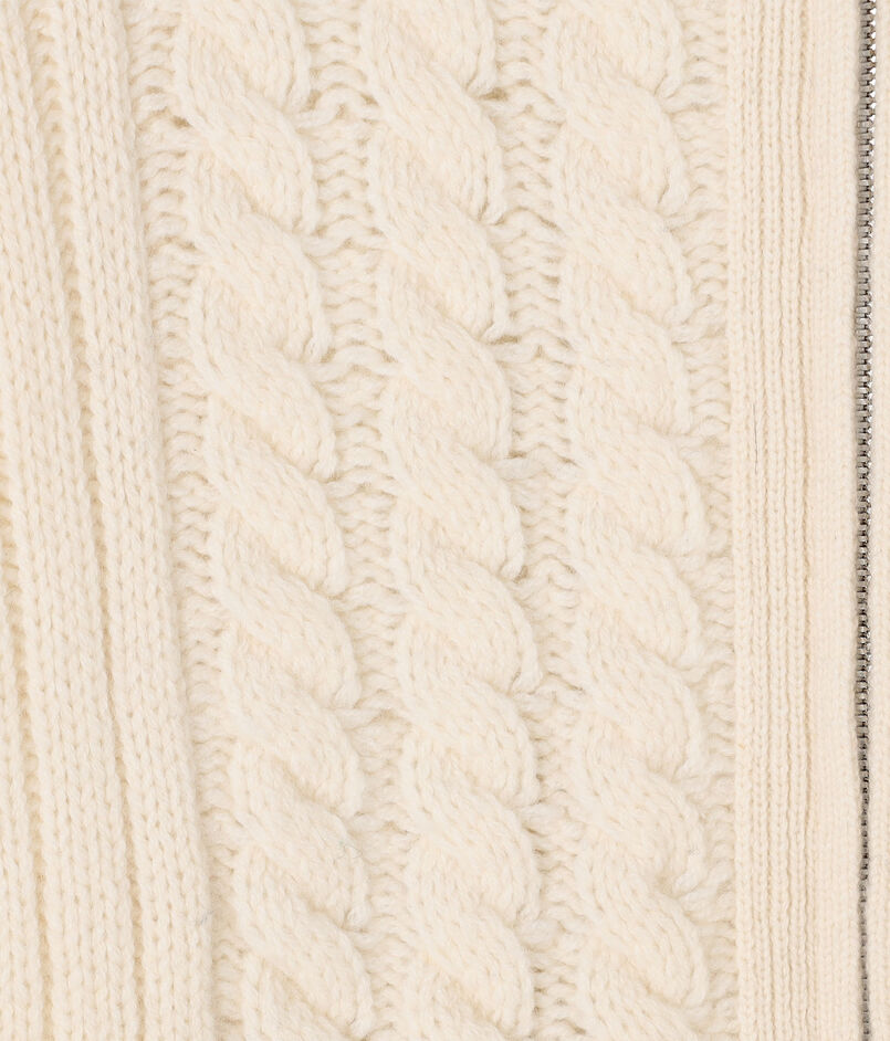 バルキーなラムズウールを使用し、ケーブルや畦編みといった表情豊かな編み地で仕立てたミディアムゲージのジップブルゾン。