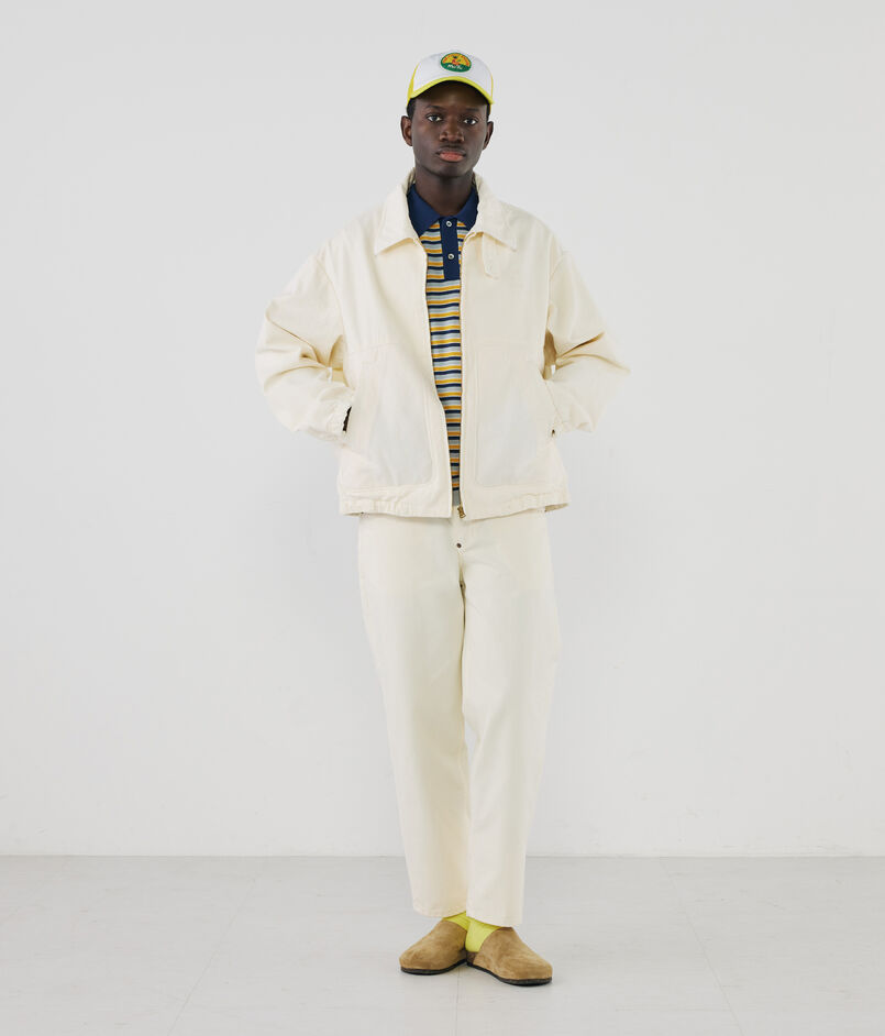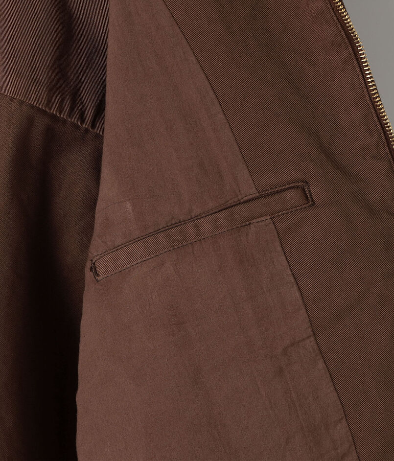 味わい深い表情を持つジップアップブルゾン。コンパクト糸を高密度に織り上げた、しなやかでタフなテクスチャー。毛羽立ちを抑えたクリーンな素材に「製品染め」と「柔軟洗い」を施すことで、深みのあるアタリ感と、長年着込んだようなヴィンテージライクな風合いを引き出しました。一点ごとに異なる微細な表情が、既製品にはない独自の存在感を放ちます。